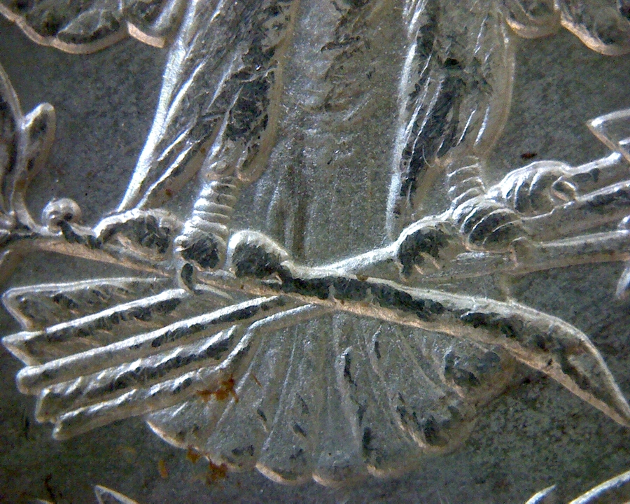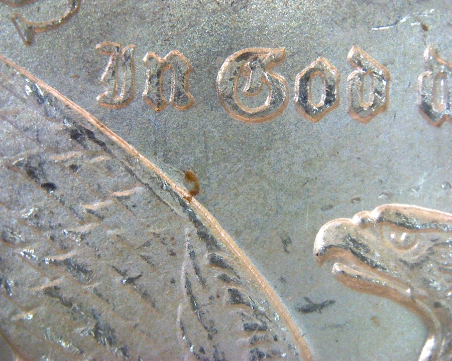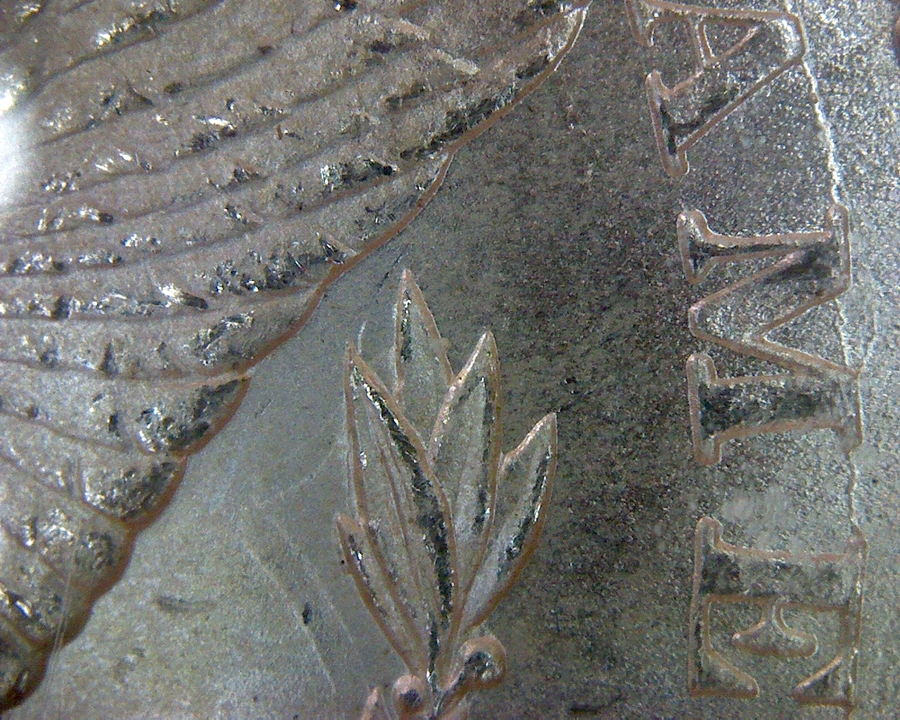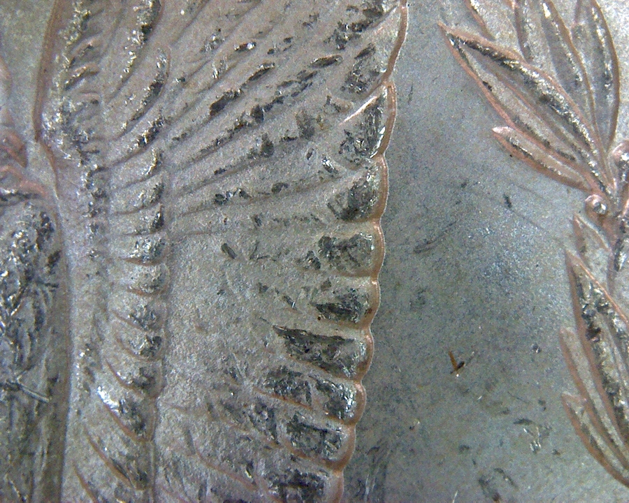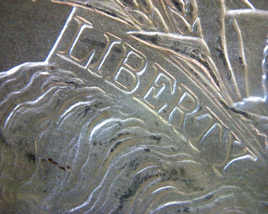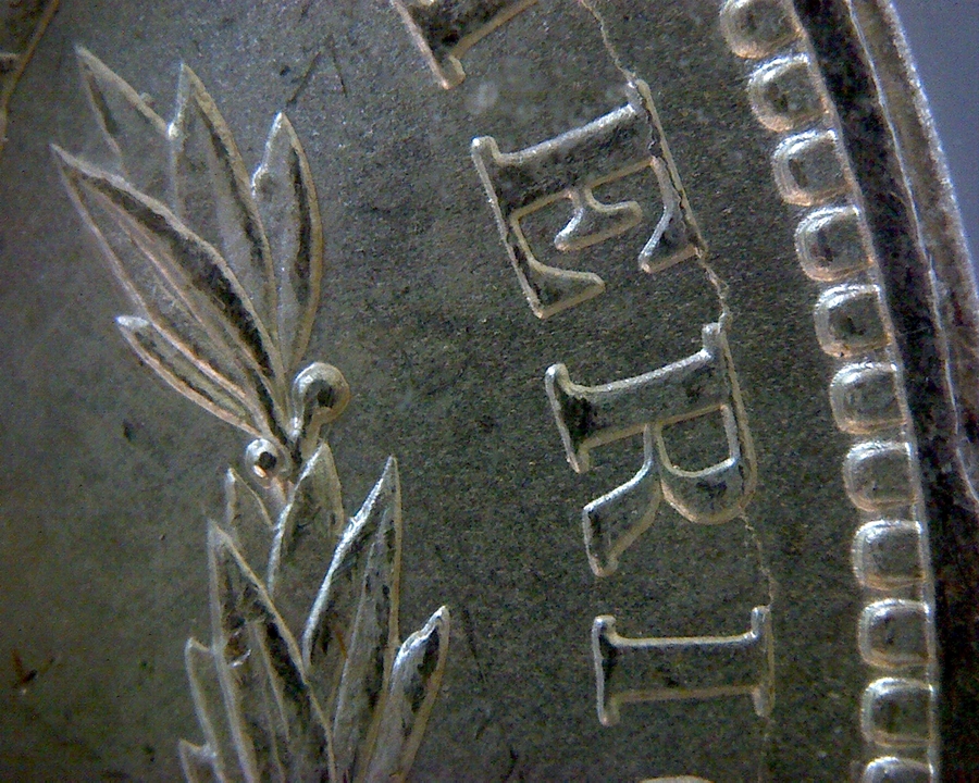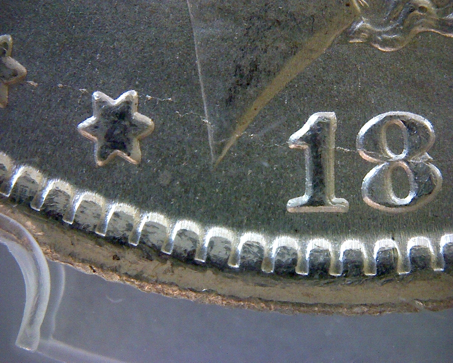 | Obverse: 3 Bold clash lines at Liberty's neck. LDS specimens have a Die BREAK at rear of Phyrgian cap below ribbon. Die wear and multiple clashes have worn away any visible "n" and st" letter transfer. |