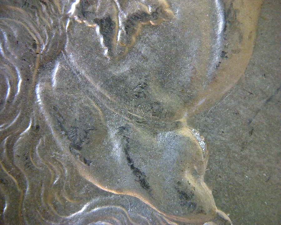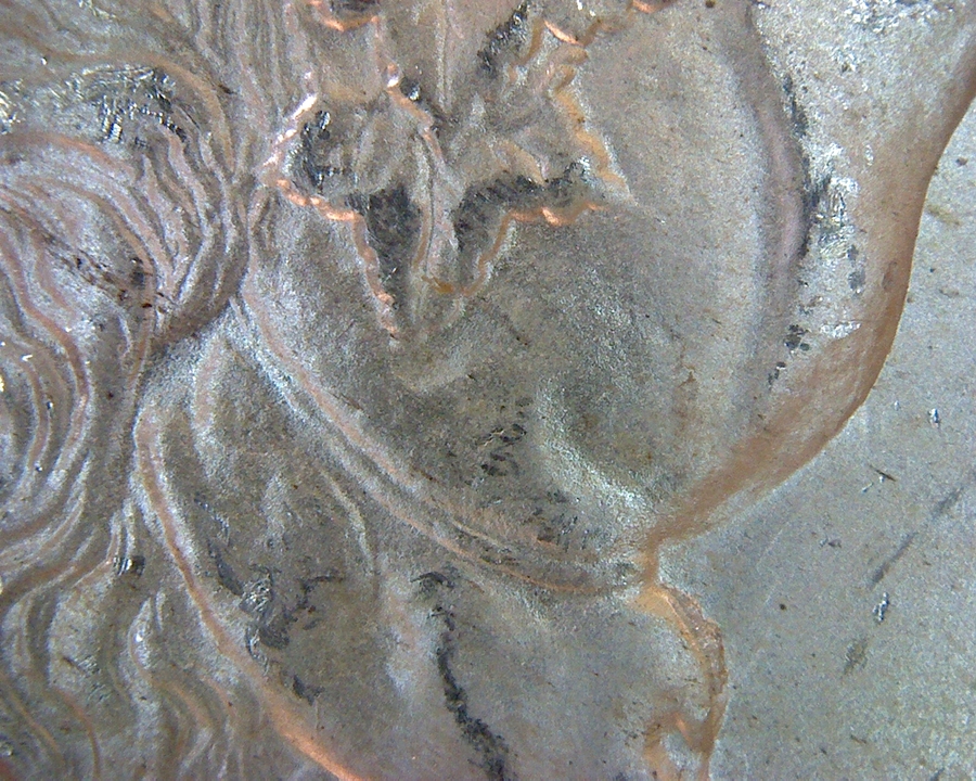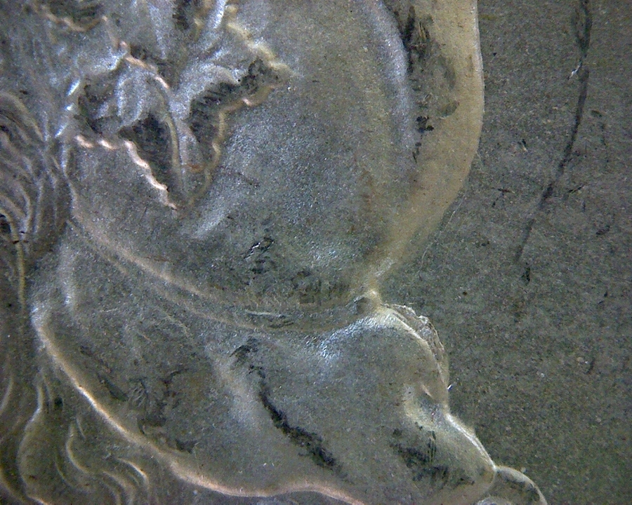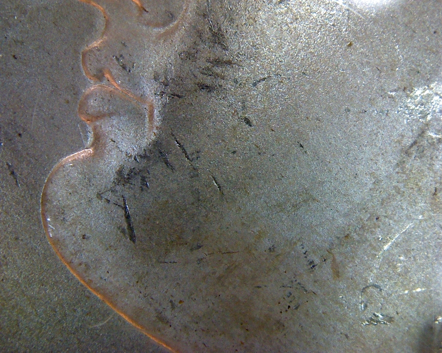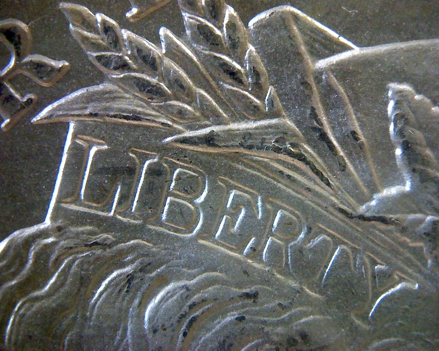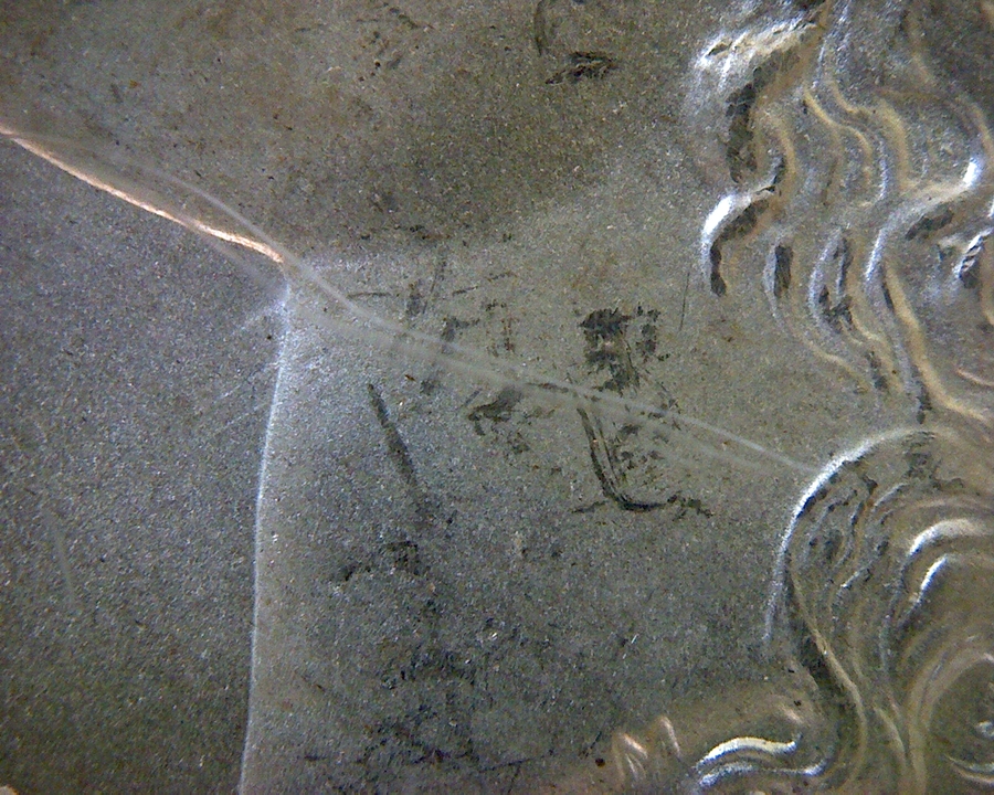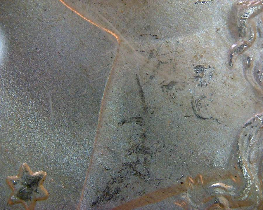 | Obverse: 3 Bold clash lines at Liberty's neck. LDS specimens have a Die BREAK at rear of Phyrgian cap below ribbon. Die wear and multiple clashes have worn away any visible "n" and st" letter transfer. |