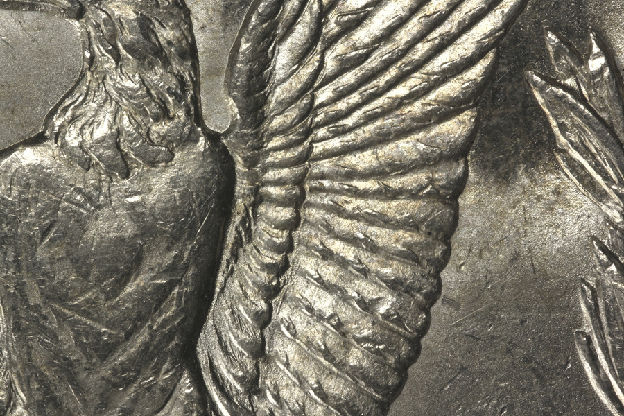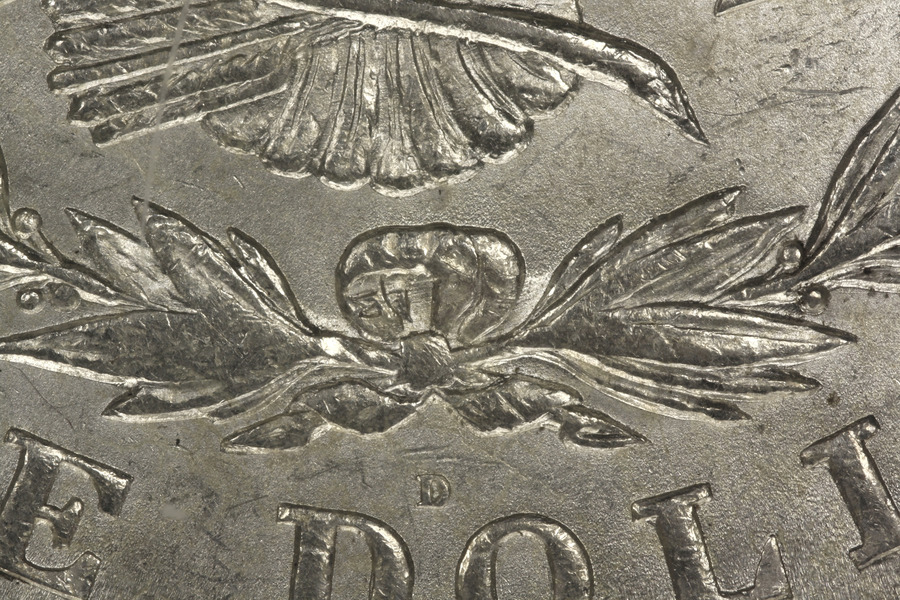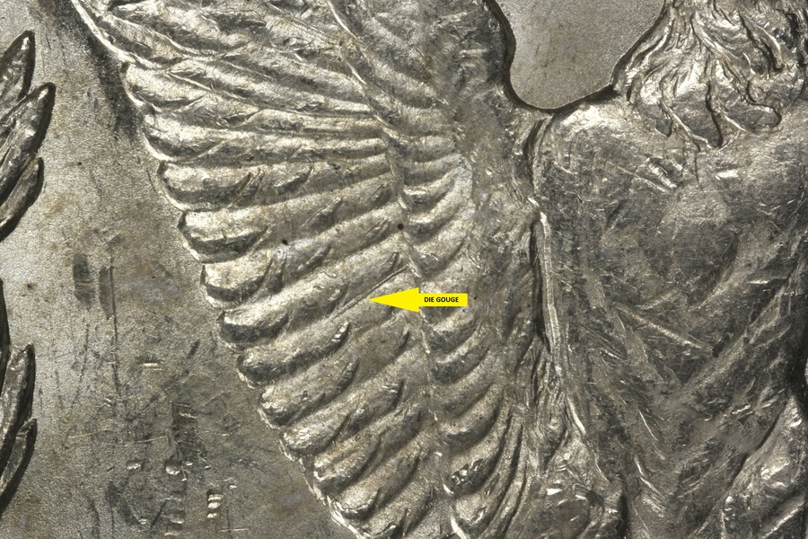 | Reverse: Mintmark centered and upright. Spike on the lower left side of O in ONE. Fine die scratches in various directions on over polished tail feathers around eagle's right leg and between eagle's left wing and body. U in trust U in Trust is "spiked" with a thin die gouge. Die marker: Diagonal die gouge between seventh and eighth outer feather from bottom of eagle's right wing . |