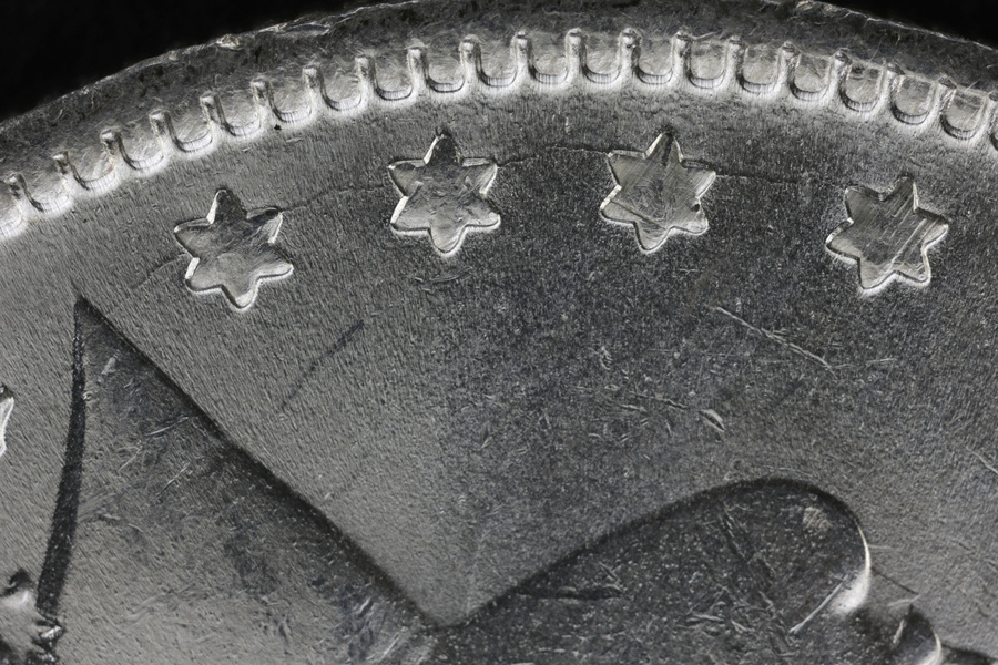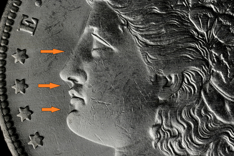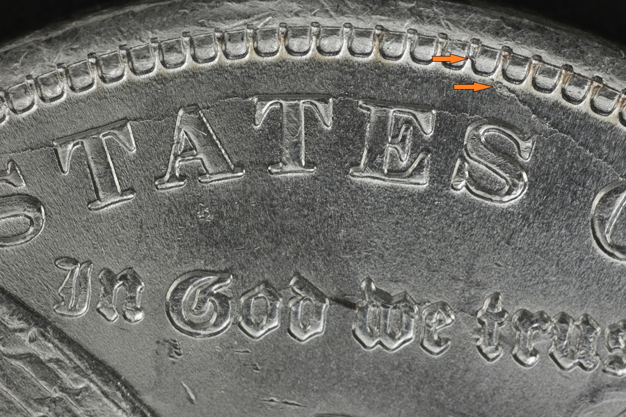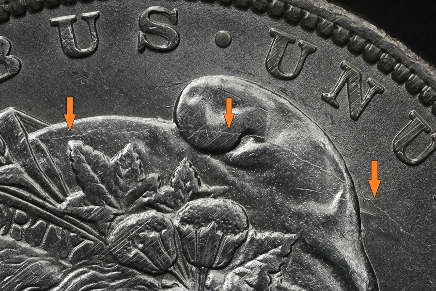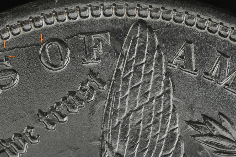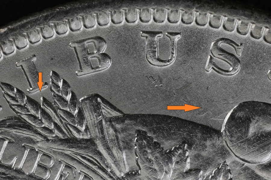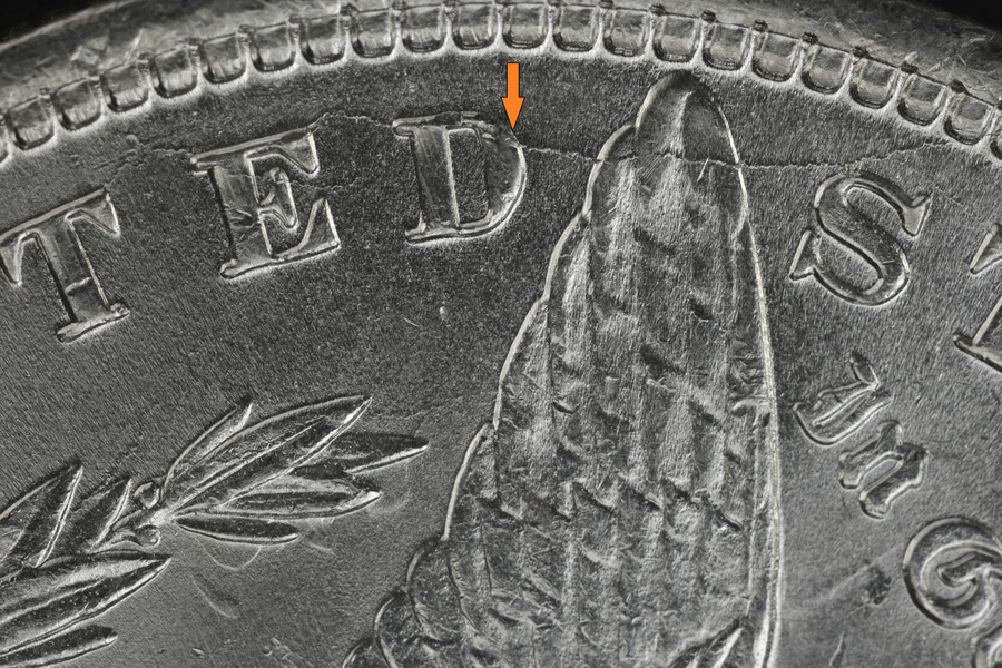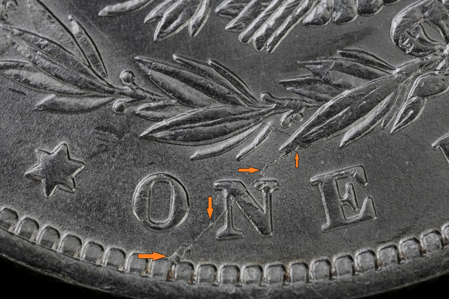 | Comments: ALOT going on with this coin. Planchet striations on obverse and reverse. TONS of cracks and breaks. VAM-38B is a true champion of Crack City. |