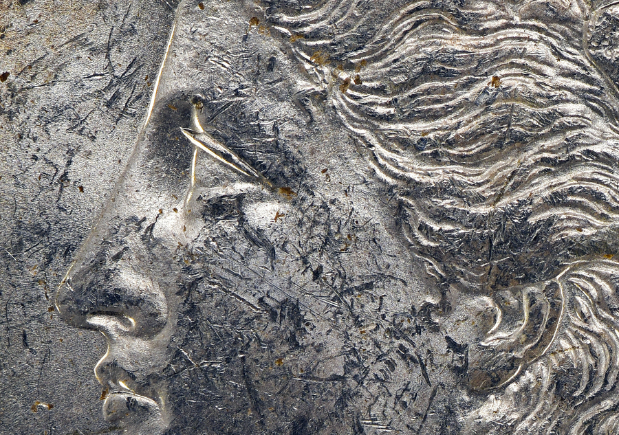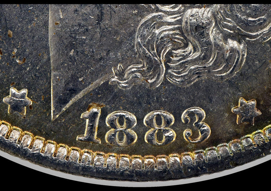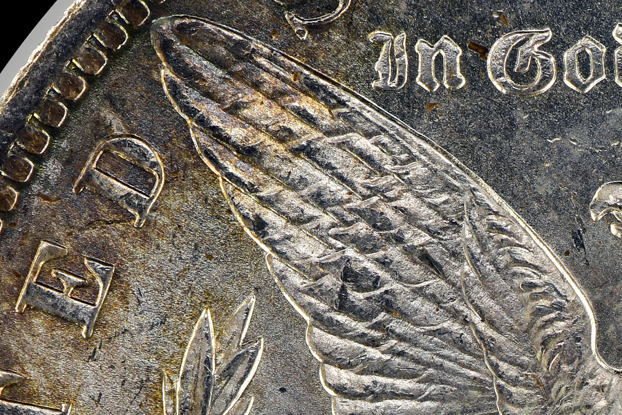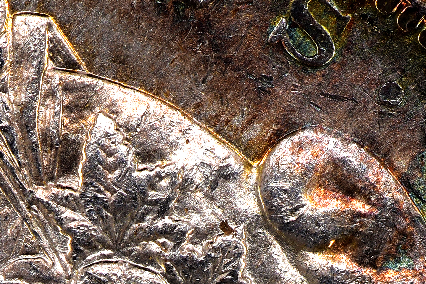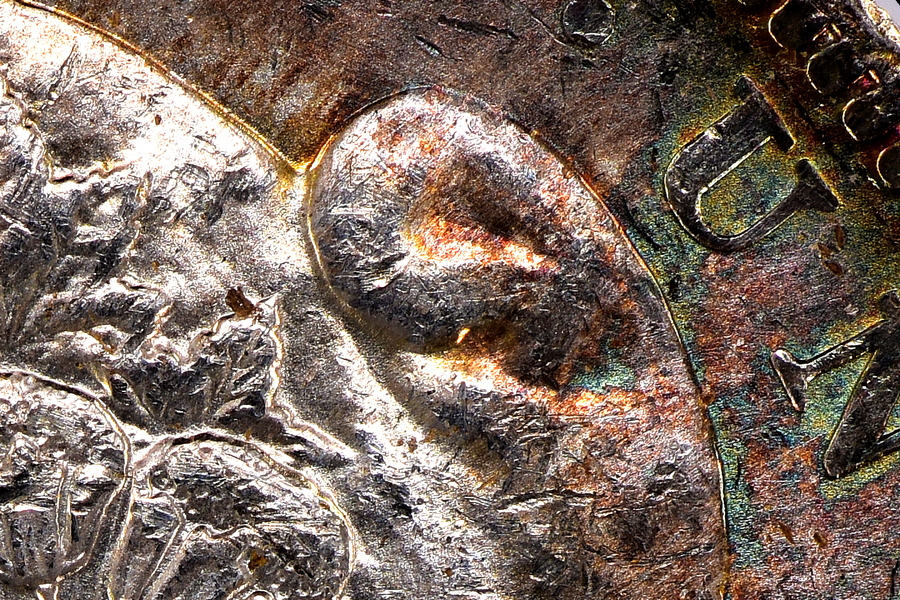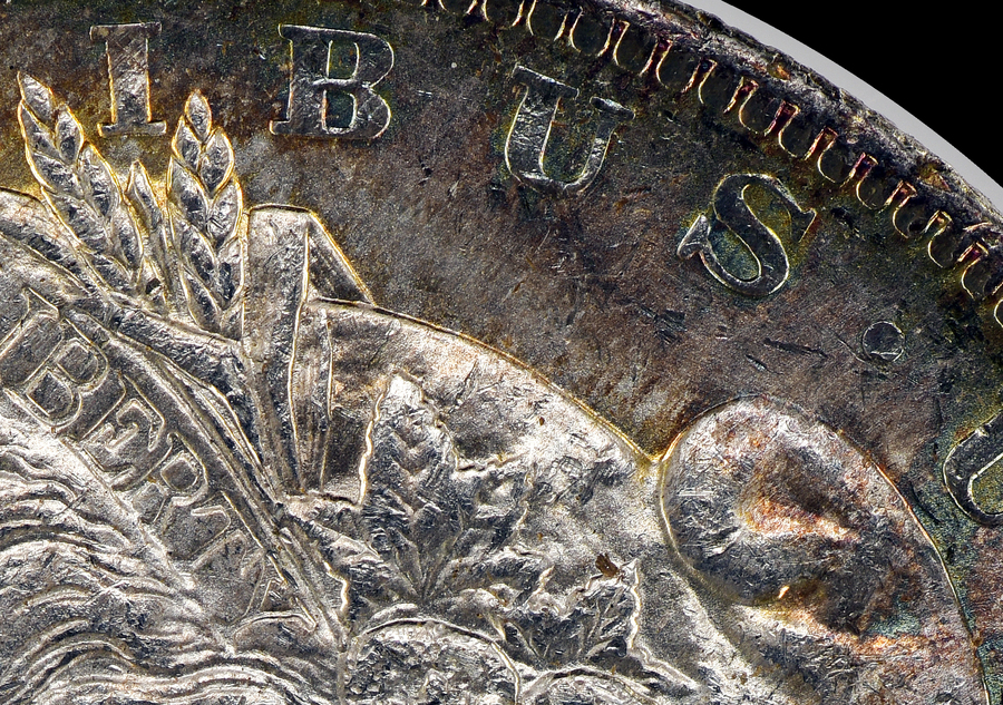 | Hot spot in the middle fold is from post mint damage. | Beveling of the field above the cap top. |