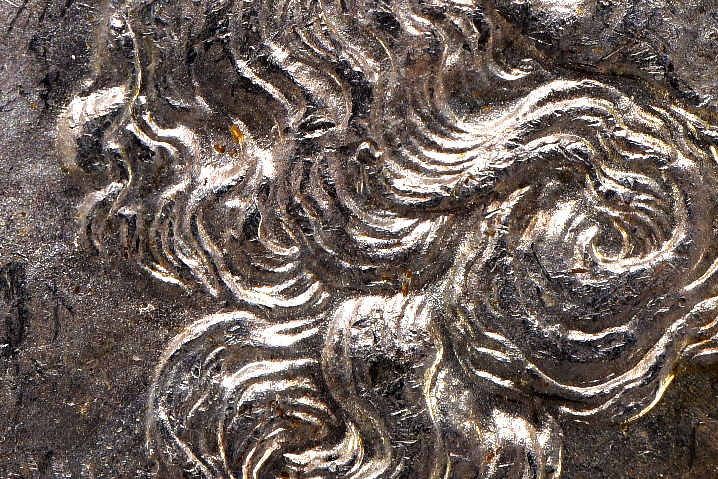 Doubled ear at lower and back inside walls. Die chip at back wall. Die chip cradled by the upper hair V.