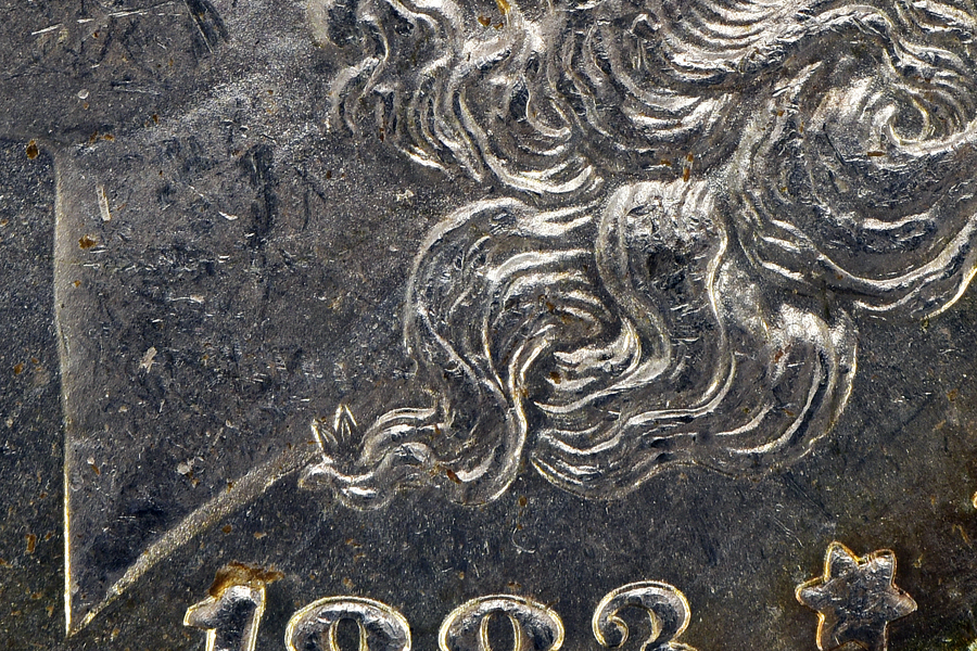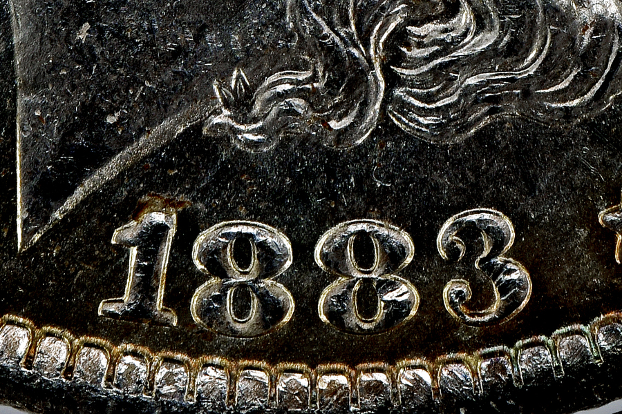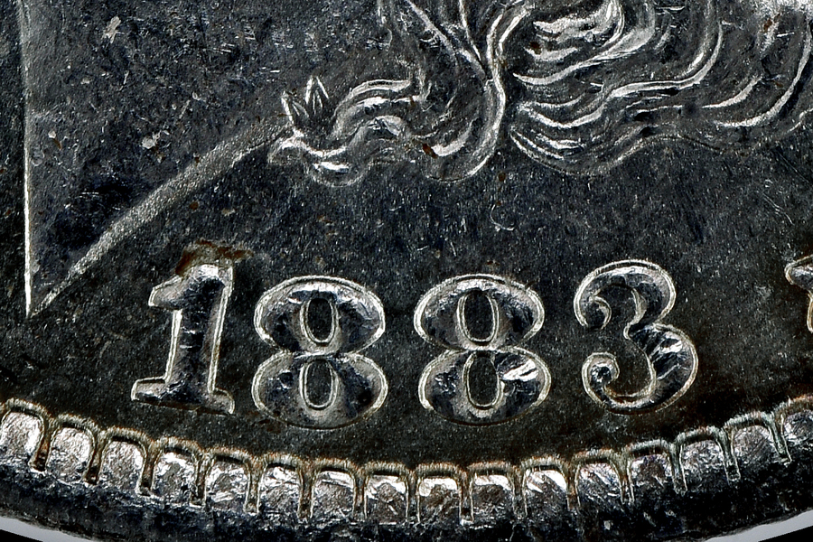 | Date doubled at flag of 1, upper left inside loop of 8s, and upper right inside loop of 3. | Mint mark tilted to the left and set centered. |
