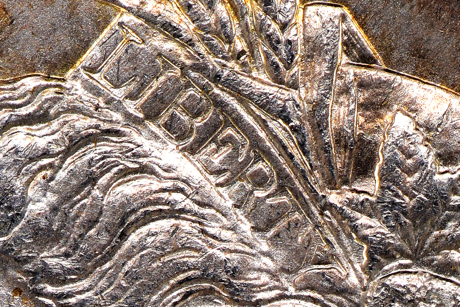 Hot spot in the middle fold is from post mint damage. Beveling of the field above the cap top.