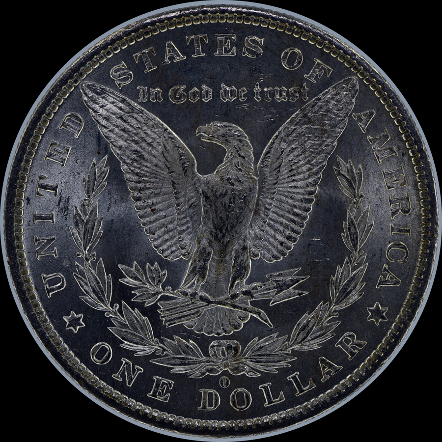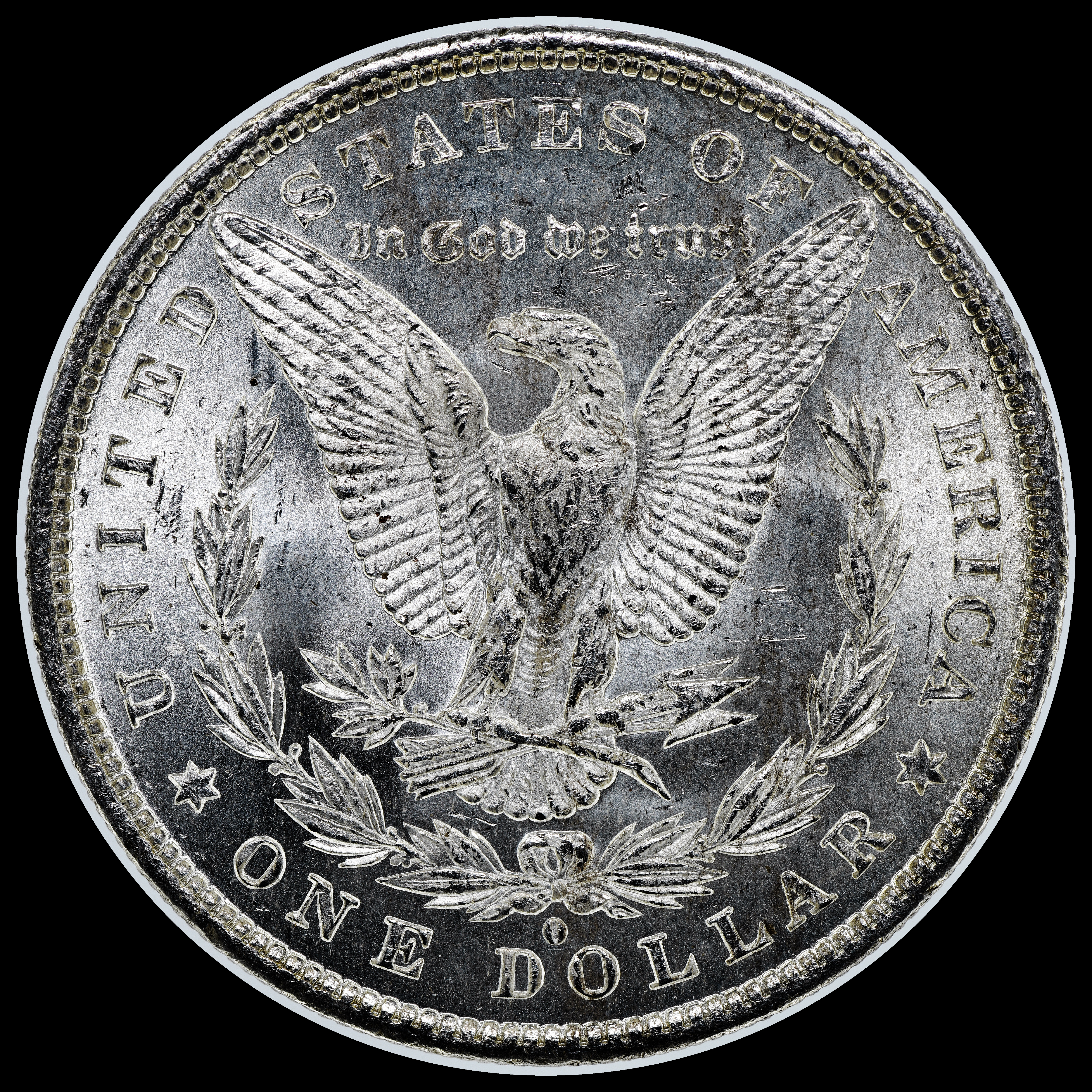 | Reverse: Weak cap V clash at 0 deg, crack/metal from right wing tip to nearest denticle gap, crack at RW4 laurel berry, micro-crack connecting outside of UNITED and STATES, crack from middle serif of F through left wing tip, crack between RW1 and left wing, micro-crack from right upper R crossing outside I to denticles, diagonal line from upper right leg extending across upper tail feathers, two horizontal lines and one diagonal line crossing inside the bow loop, doubled right wreath, doubled left wreath LW3, doubled st of Trust. |