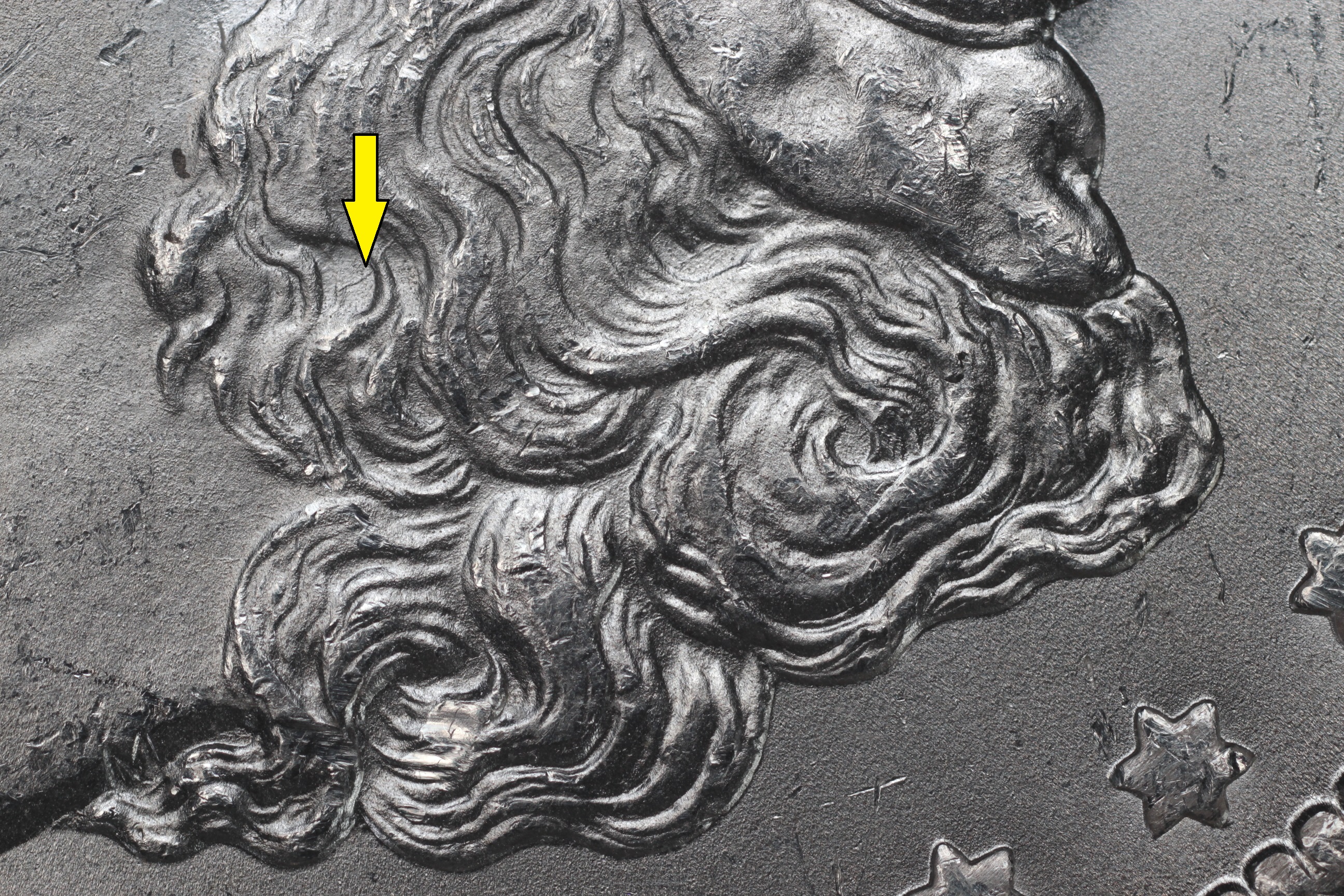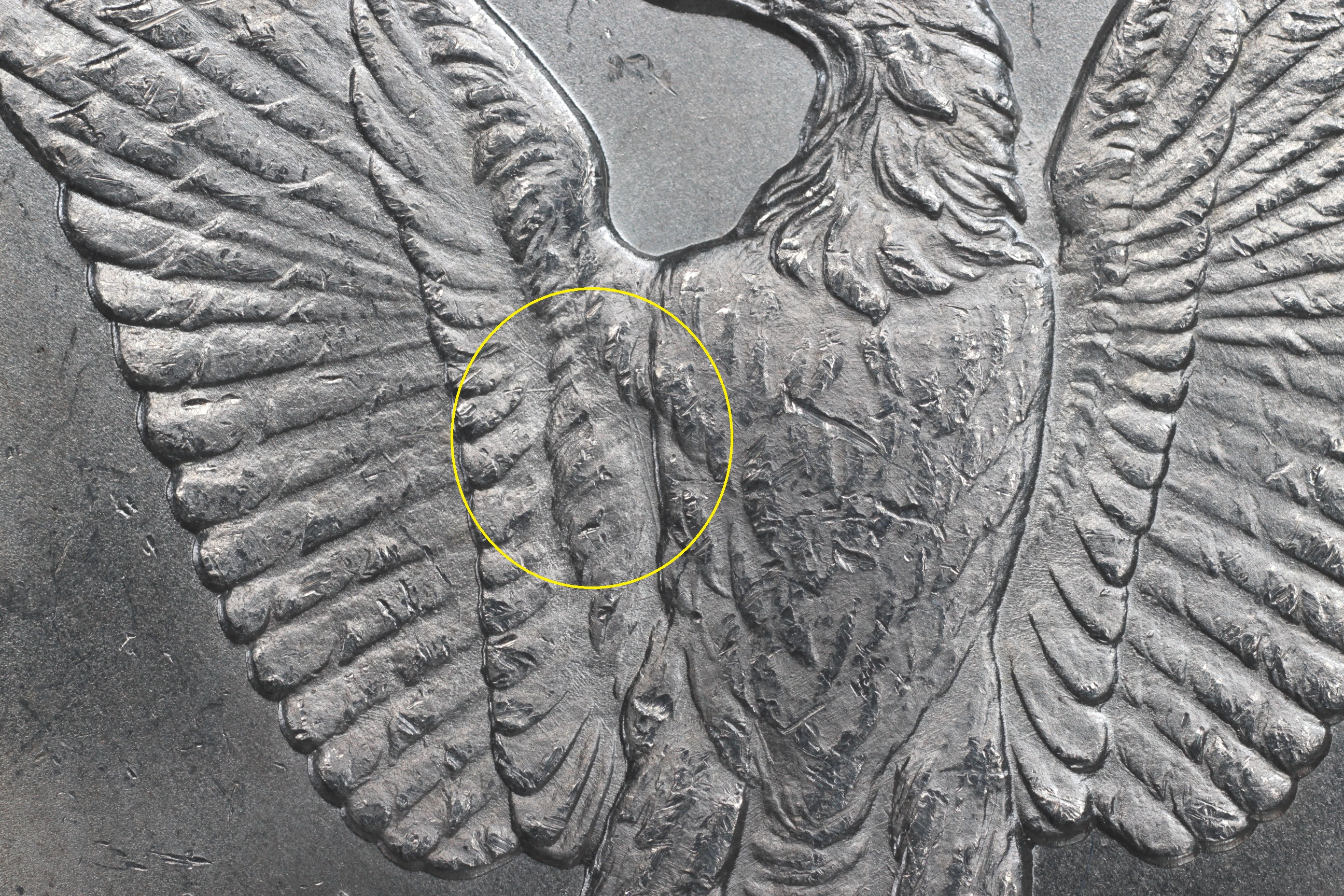 • Die scratches between eagle's breast and right wing and on right wing as well. Gouge between eagle's breast and left wing .