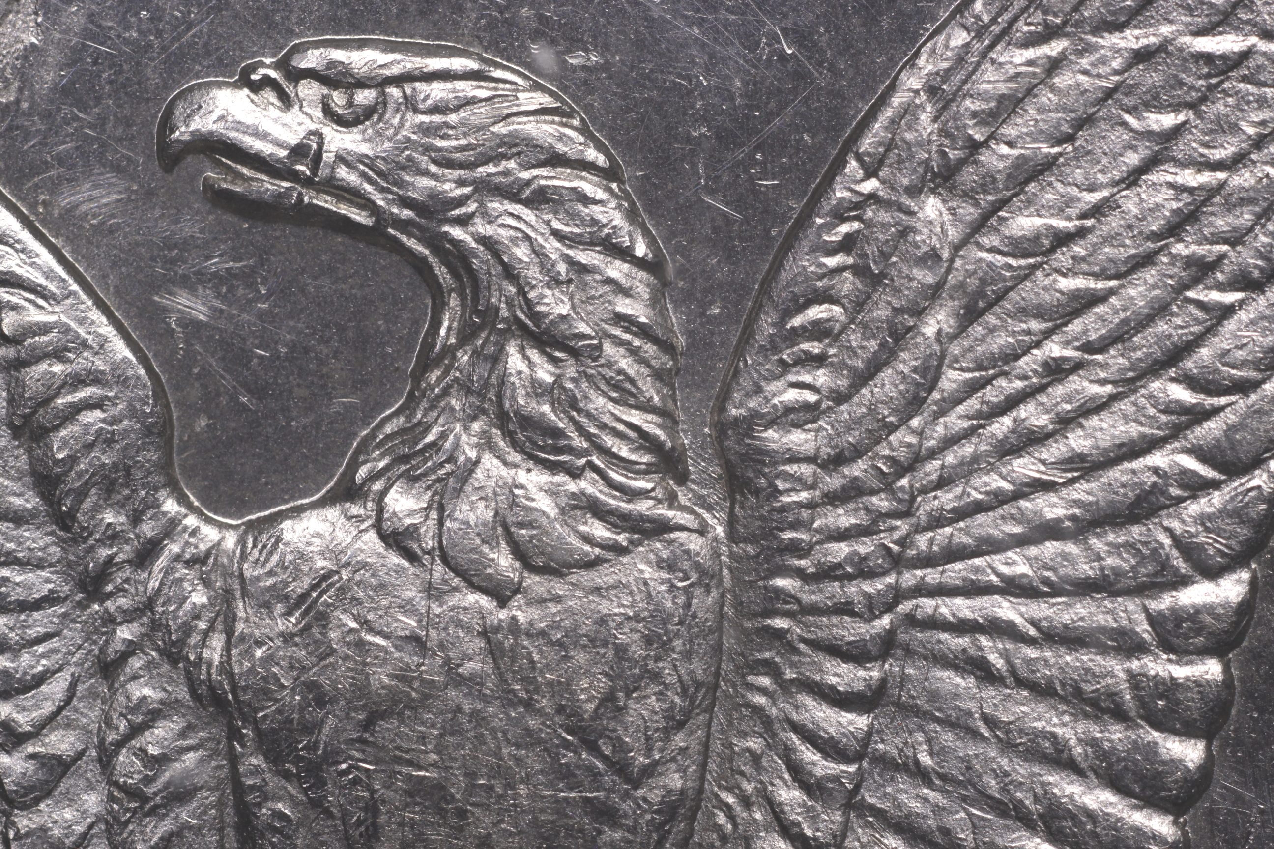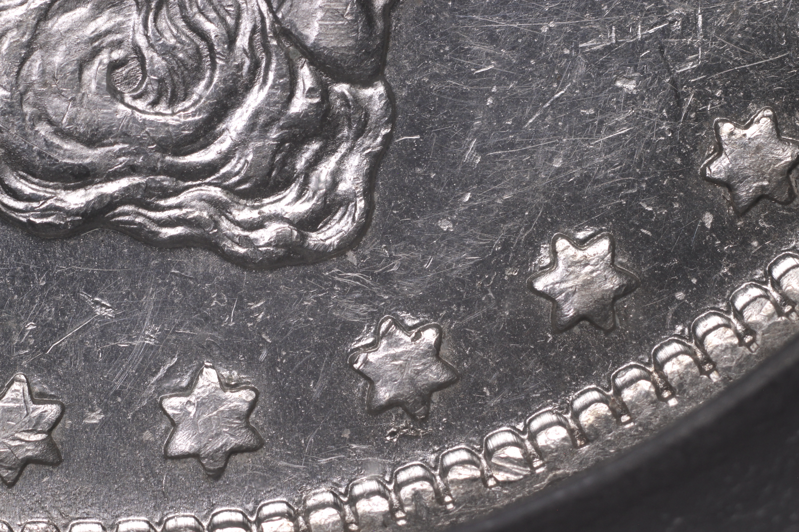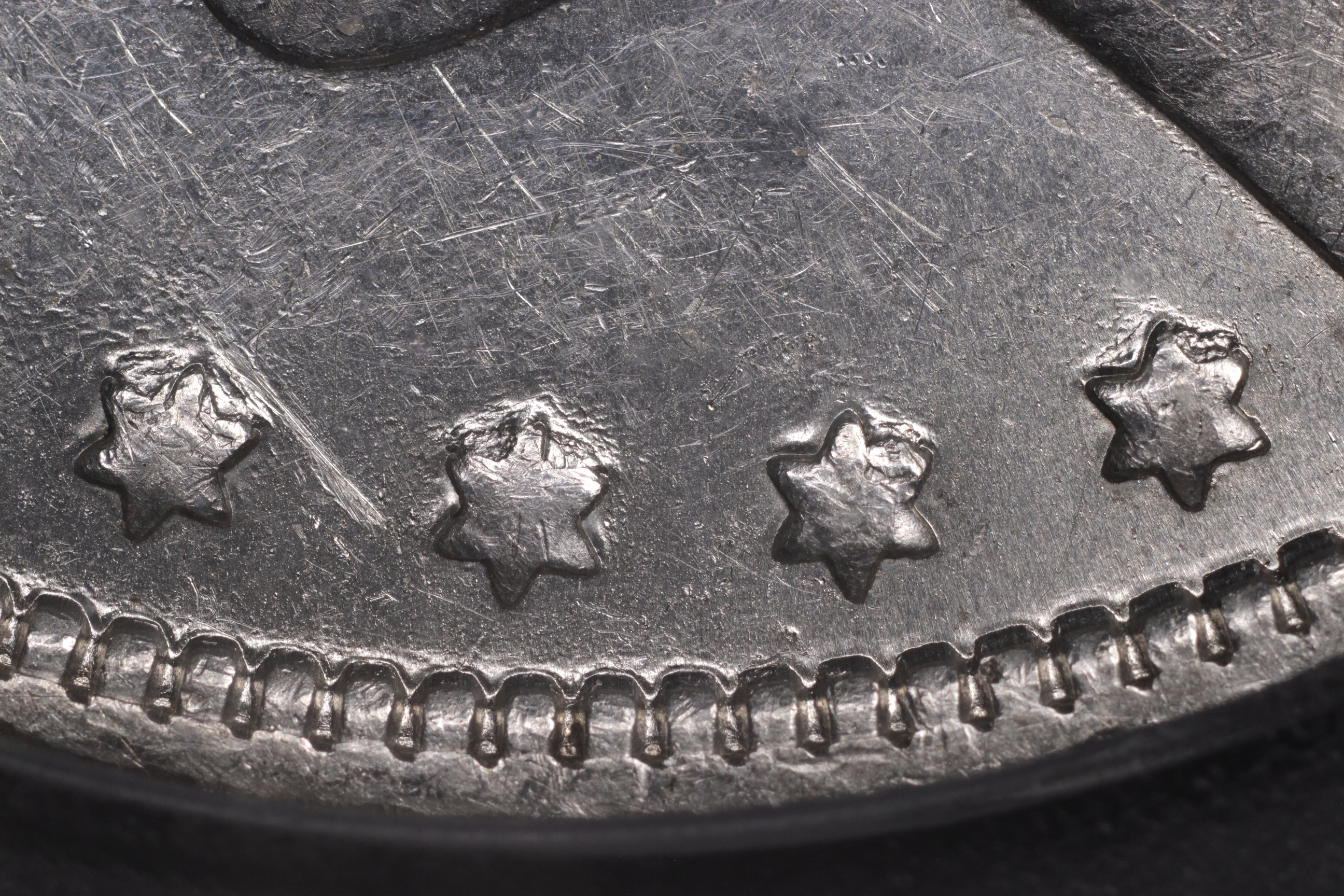 | Obverse III2 8 Date set further right than normal. Extreme die wear showing as built up metal on all left stars, first right star and E-P towards coin center. |
