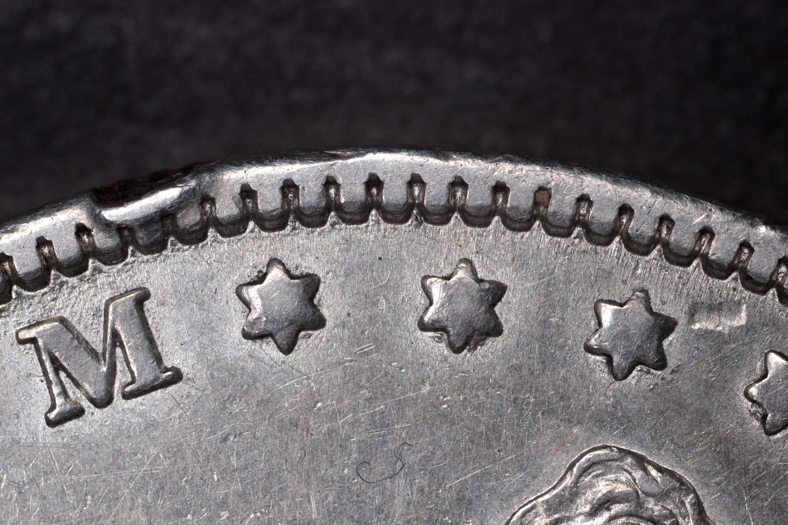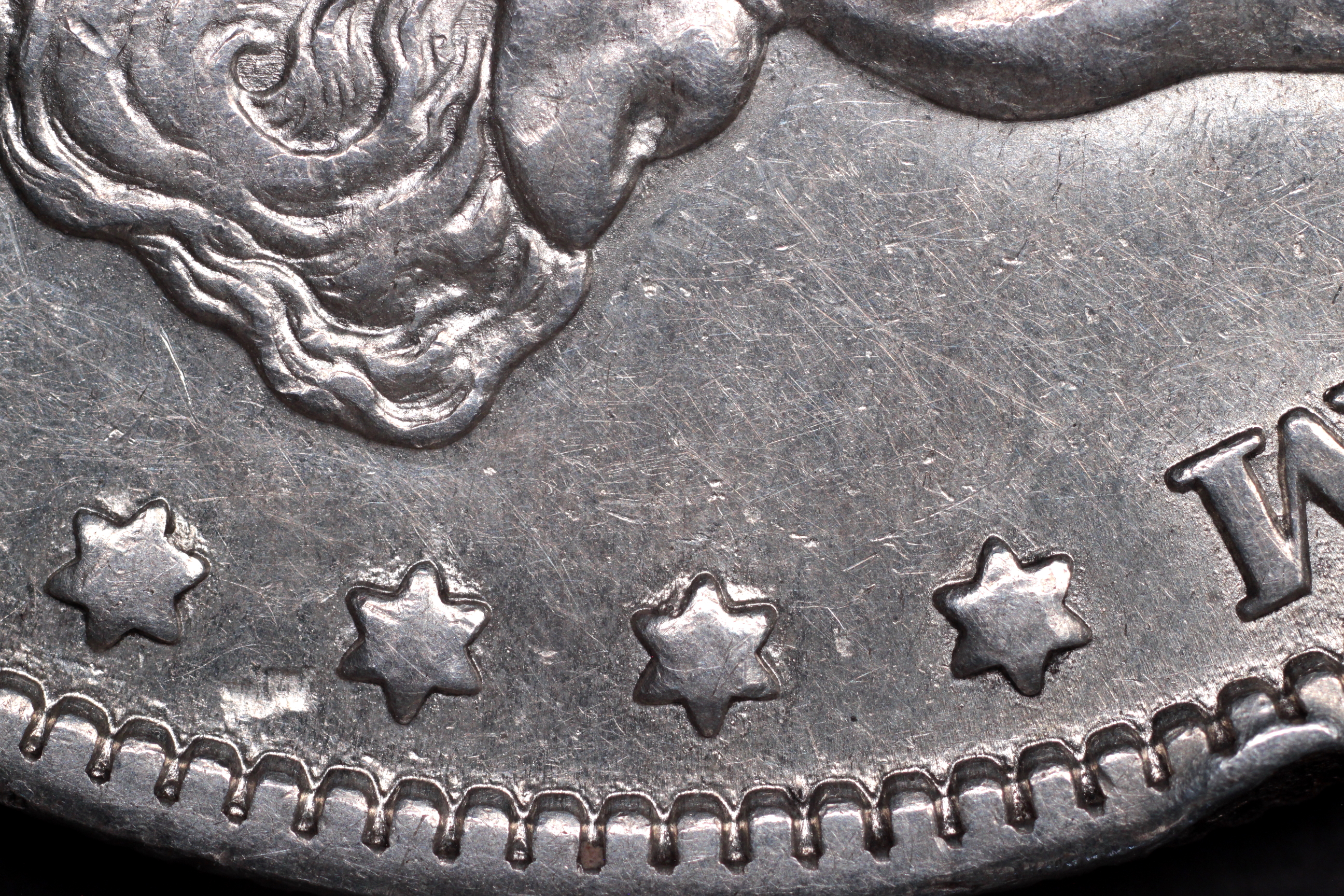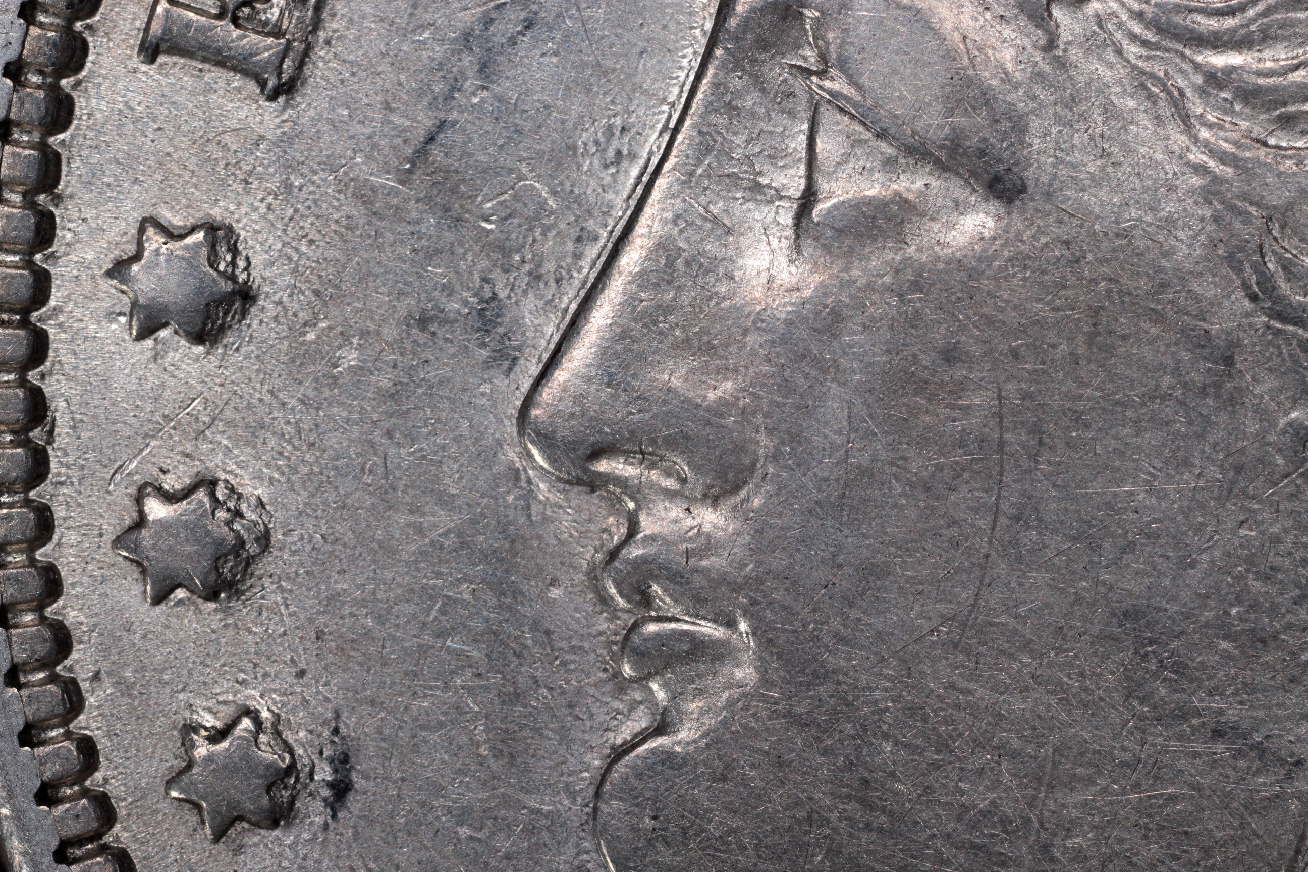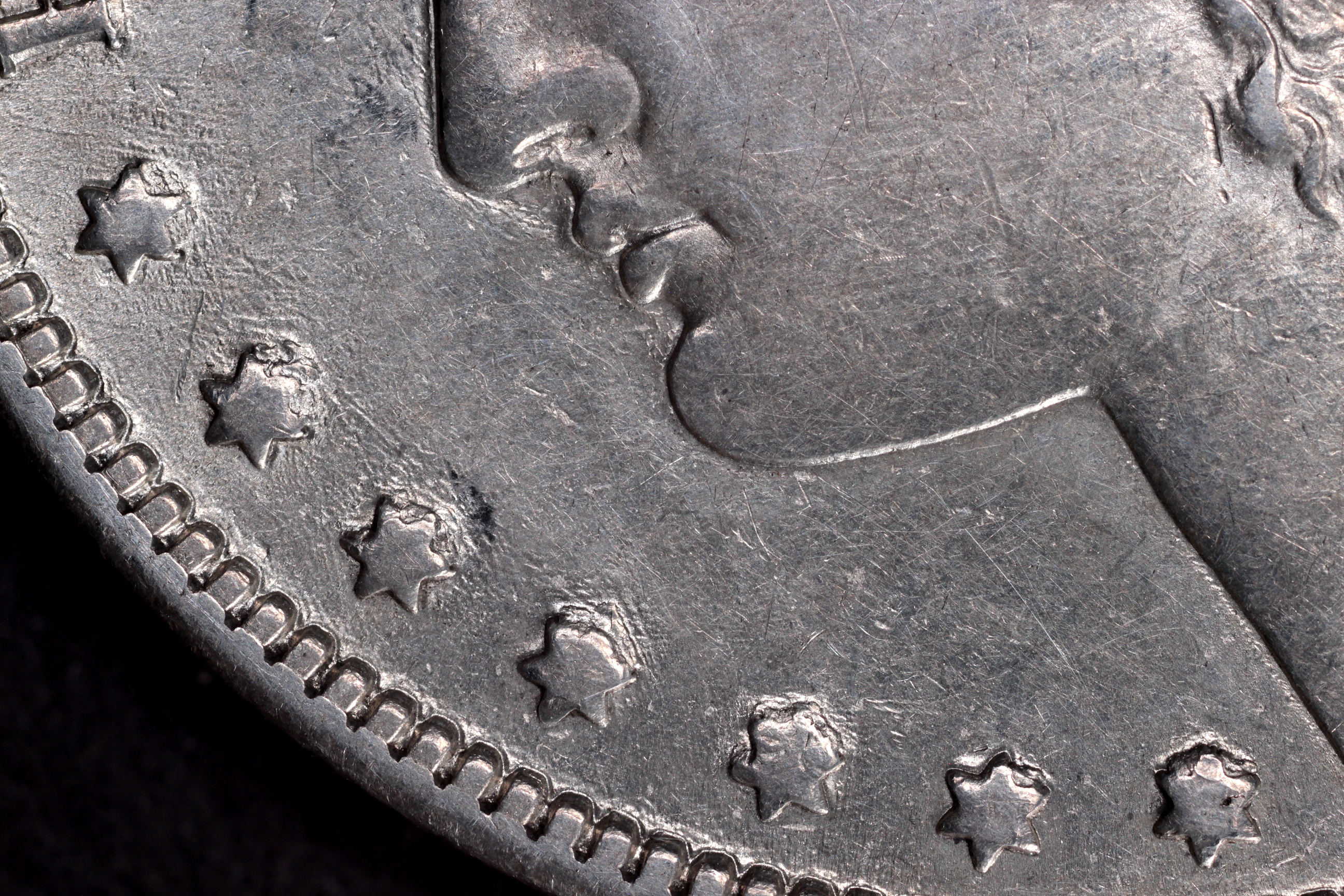 | Obverse III2 8 Date set further right than normal. Extreme die wear showing as built up metal on all left stars, first right star and E-P towards coin center. |