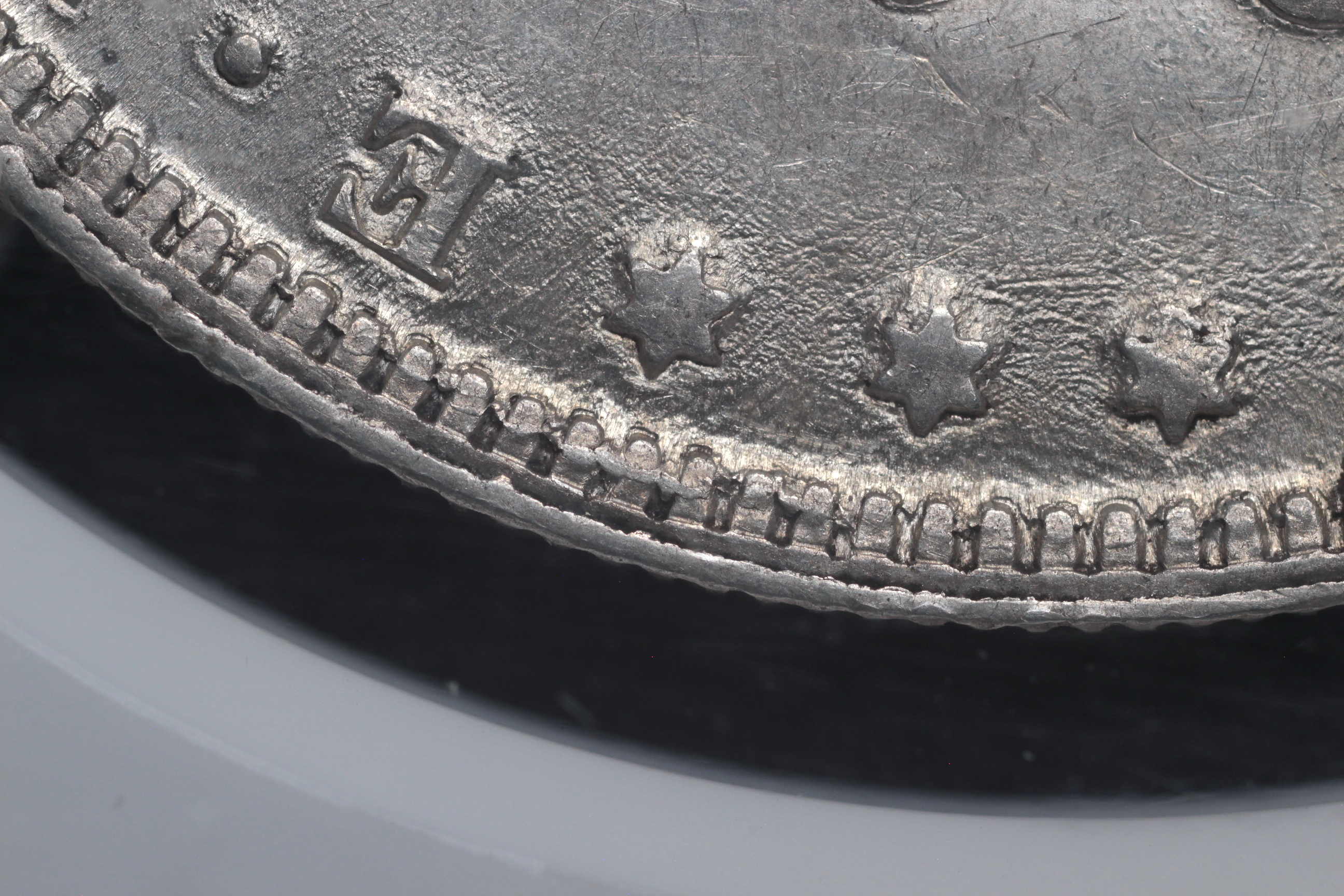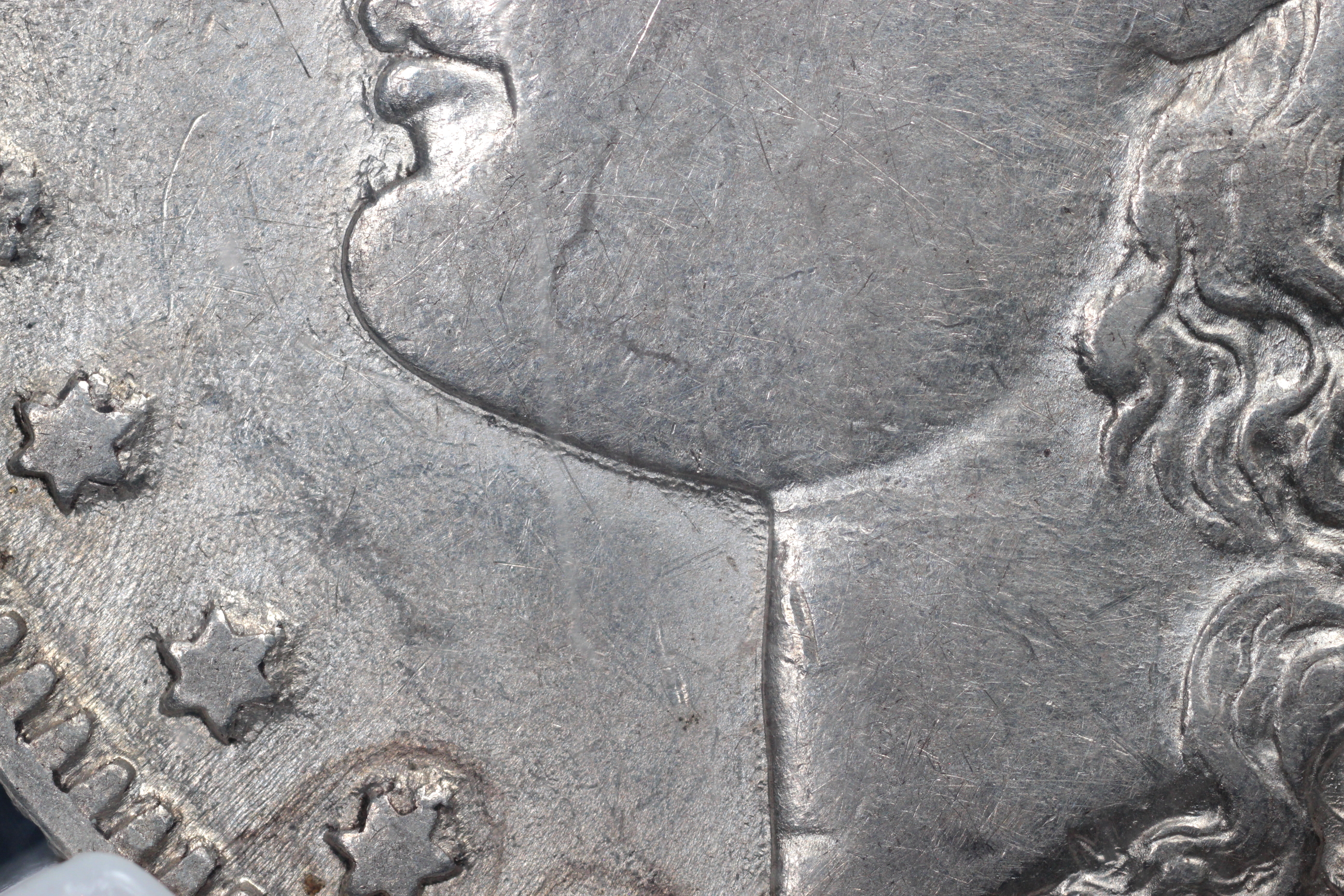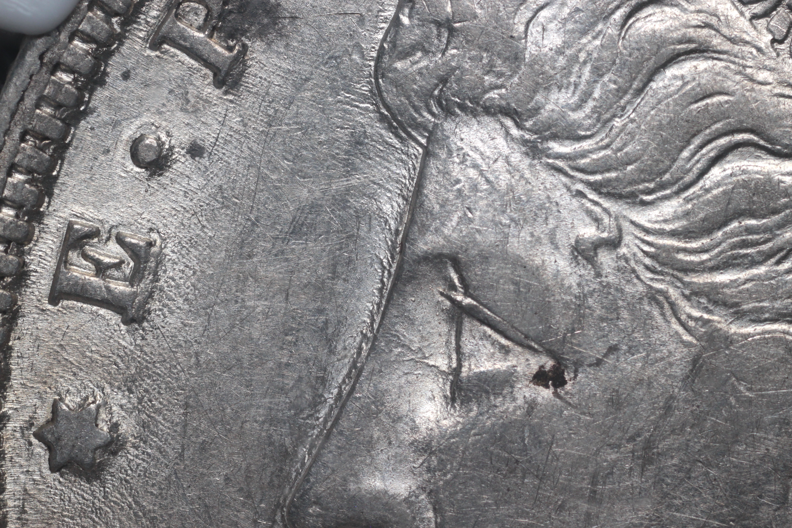| Obverse III2 8 Date set further right than normal. Extreme die wear showing as built up metal on all left stars, first right star and E-P towards coin center. |