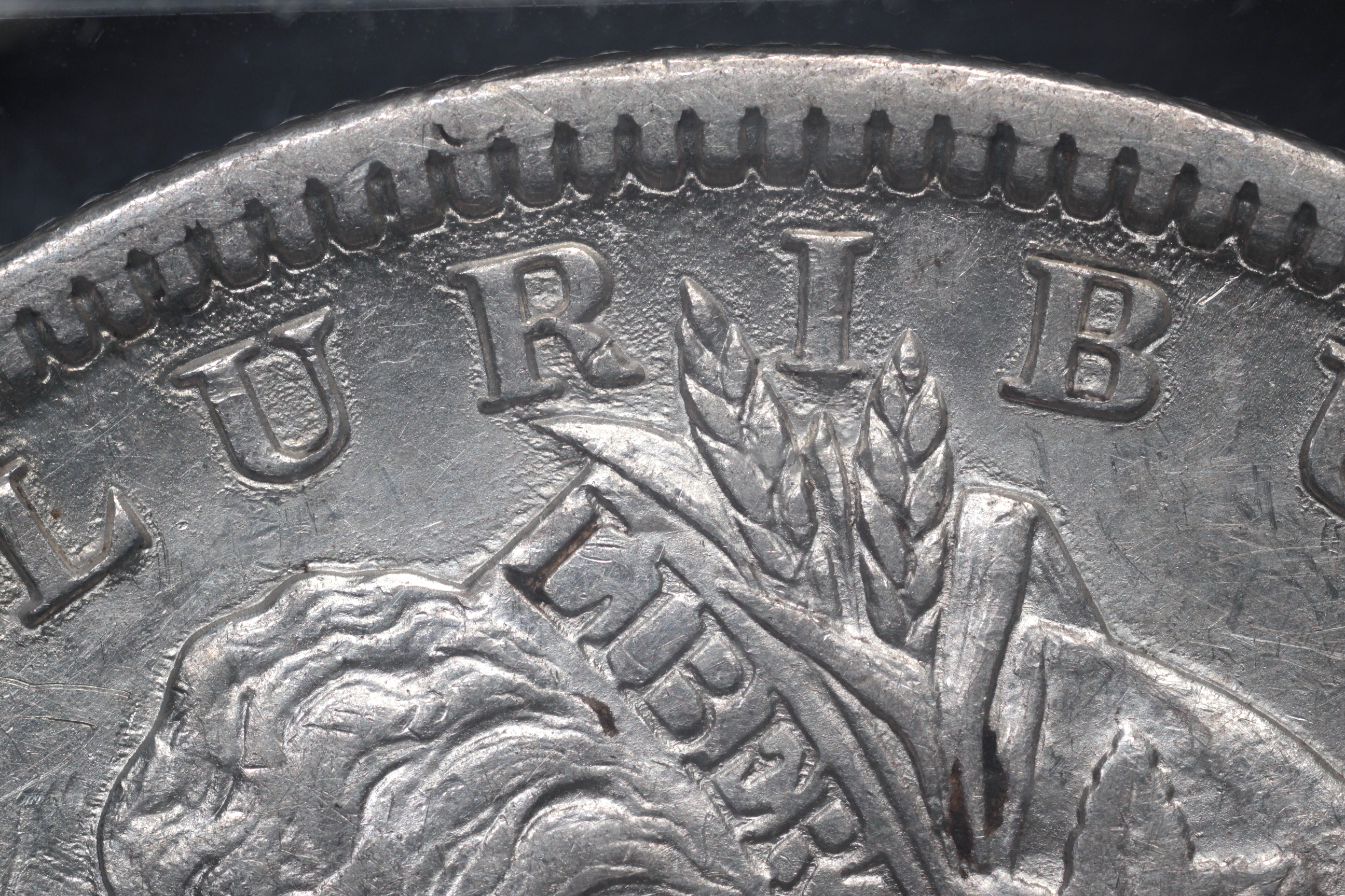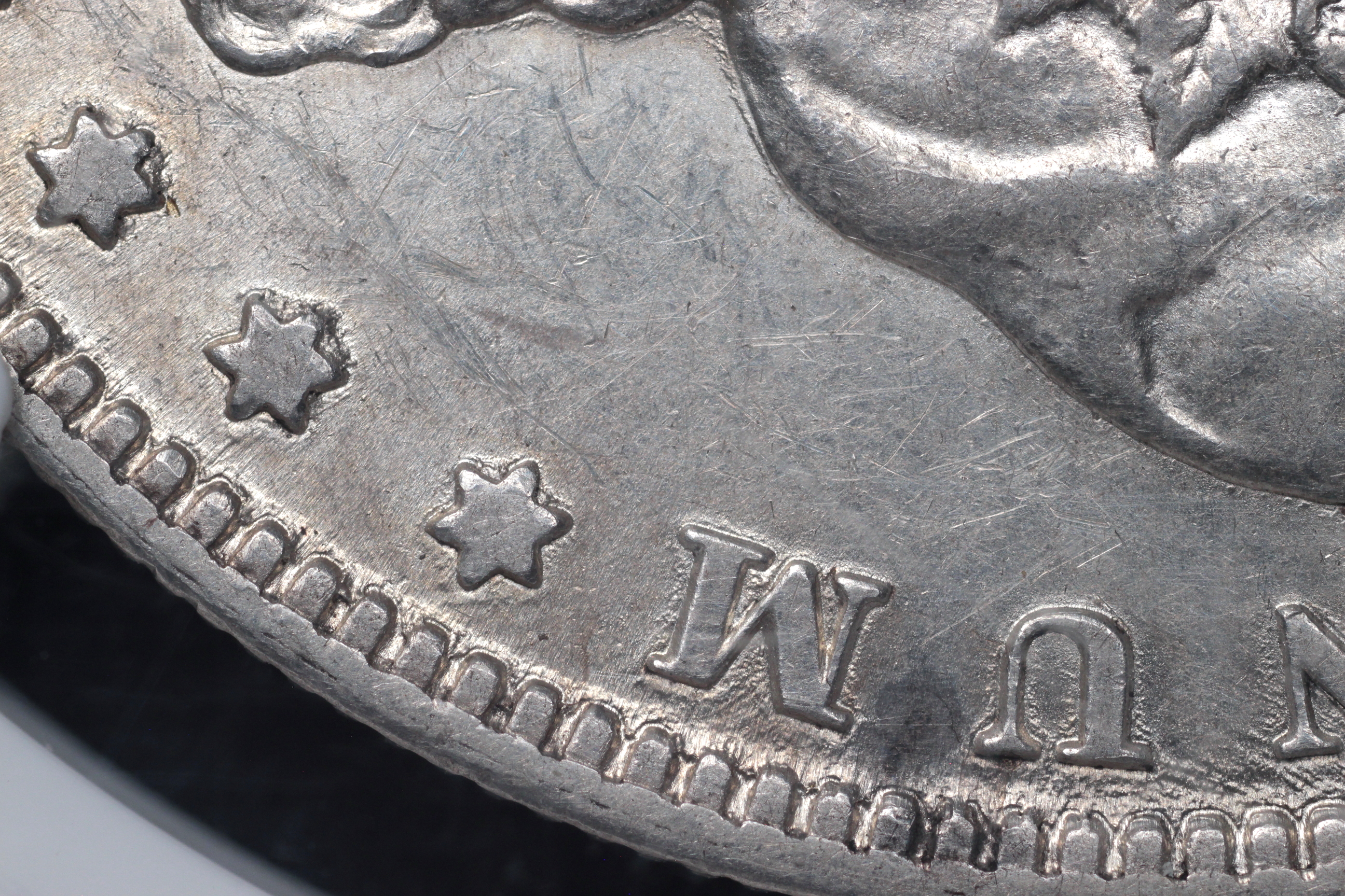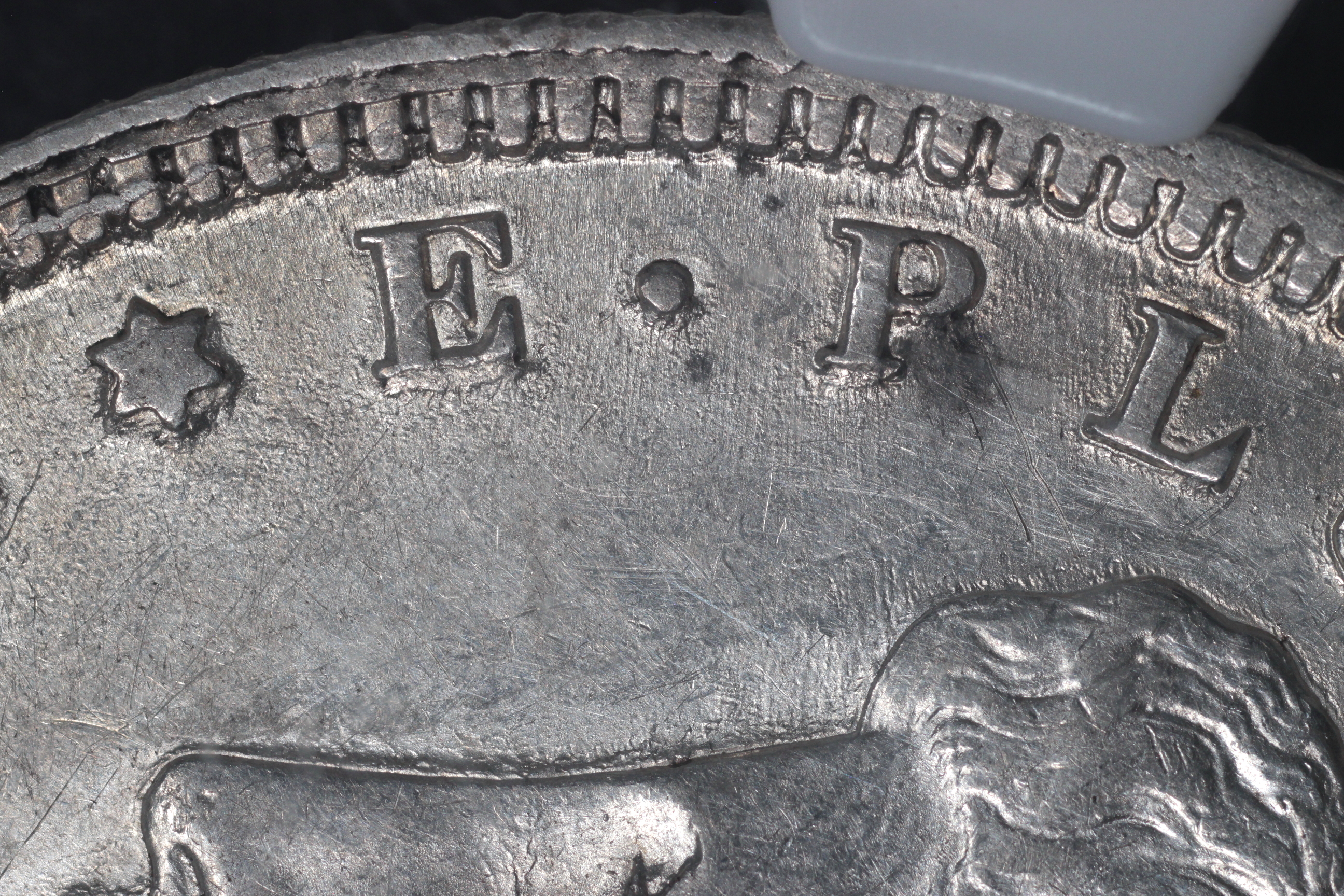 | Obverse III2 8 Date set further right than normal. Extreme die wear showing as built up metal on all left stars, first right star and E-P towards coin center. |