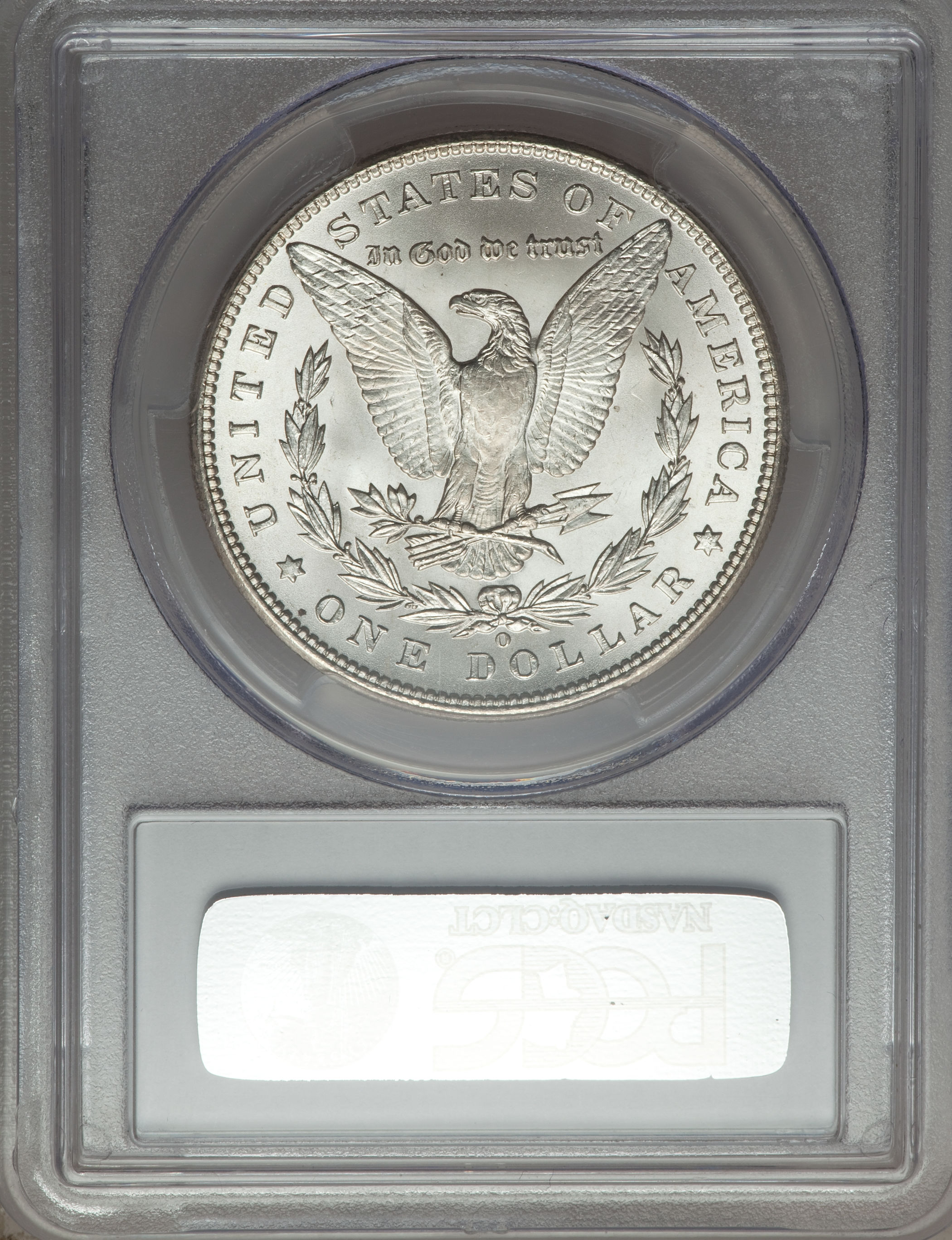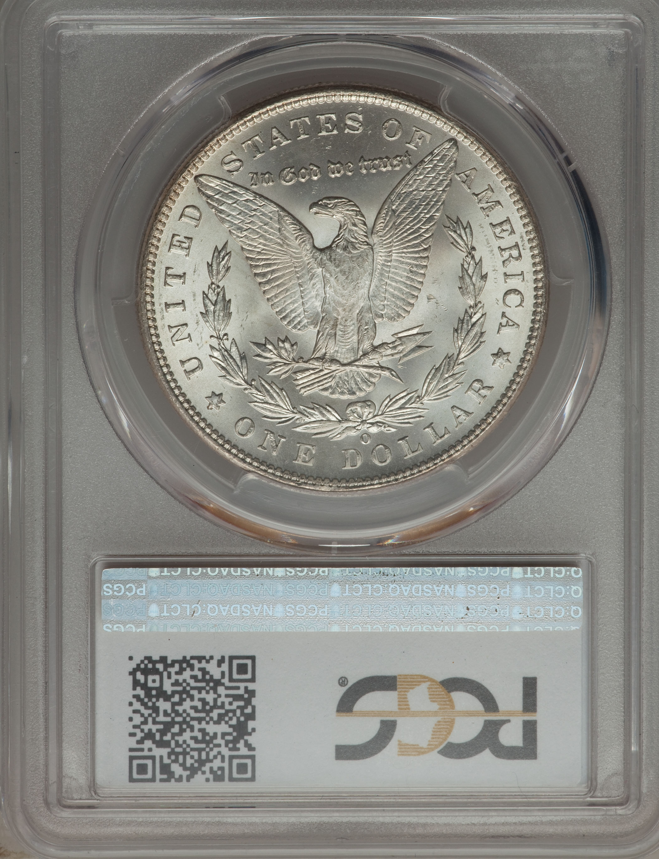 | Reverse: Attributes: Mint Mark set Right, High, and Upright. Markers: Crosshatching of lines fill left wing gap. A long concentric scratch crosses outer wing feathers three through ten of the left wing. Short line bridges upper gap between tail feathers six and seven. Line from bottom of right leg feather crosses the fifth through seventh upper tail feathers. A diagonal and two horizontal lines cross upper tail feathers 6 and 7 and form a horizontal V with the apex at the third ring of the right leg and mirror Z. Two horizontal and diagonal line form a Z in left leg triangle. Interrupted vertical gouge in right leg triangle. Horizontal line upper right leg triangle. Diagonal lines in field at upper olive leaves. One gouge extends off left side of upper outer olive leaf. Dot on field between arrow feather and olive branch. Small gouge at left wall bottom one-third inside bow loop. Horizontal lines in bow loop. Horizontal lines in gaps between wreath stems and the wreath clusters. Beveling of field along the second to third tail feathers. Clashed cap V. Cracked ATE of STATES and ME of AMERICA. |
