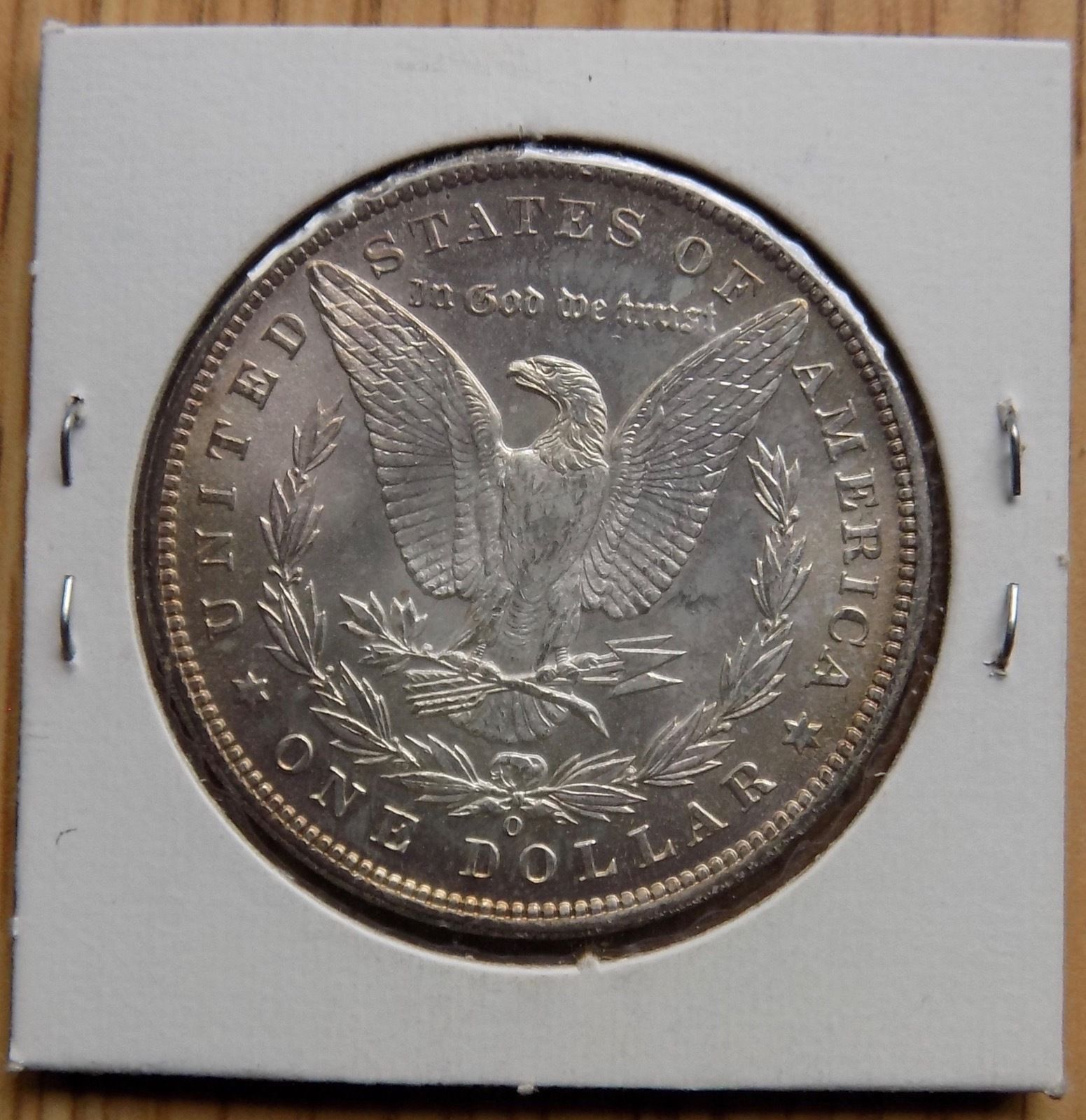 | Reverse: Attributes - Mint Mark Set Center, High, and Upright. Markers - Gouge off upper right serif of r and closed lower loop or s of trust. Horizontal line through pupil. Parallel lines fill left wing gap. Two parallel lines extend from neck feather near floor of left wing gap. Line extends from left leg feather to third transverse upper tail feather and another horizontal line to the eighth transverse upper tail feather. Horizontal lines extend from along the right leg to the seventh upper tail feather. Two horizontal lines extend from the left leg to the first upper tail feather. Dense horizontal lines in the right and left leg triangles. Horizontal line crosses upper 1/3 of inside bow loop and another short horizontal line crosses the floor of the inside bow loop. Lines cross from the right outside bow loop and the bow ribbon to the fifth right wreath cluster. Interrupted crescent shaped pitting in the inside mint mark loop (O/O). Beveled field along the upper arrow feather. Lines between the olive leaf clusters. Polishing of the bases of the middle lower outside feathers of the right wing. |