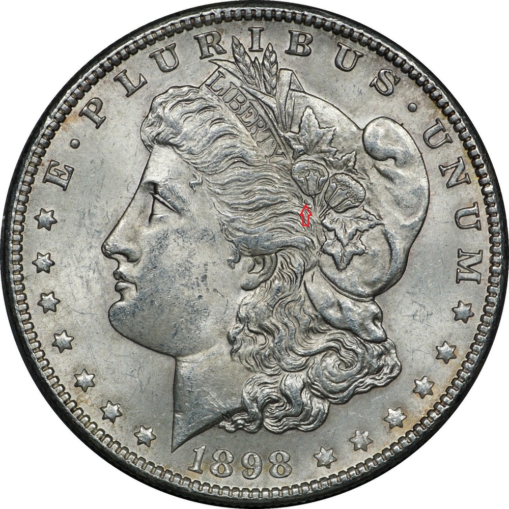| Reverse: Attributes. Mint Mark Set Center, High, and Upright. Doubled inside leaves of LW2-3. Doubled TED and ST of legend. Doubled G of "In God we trust". Doubled scratch across left wing tip. Markers. Horizontal gouge along top of S of STATES. Surface doubling along tops of TA of STATES. Gouge connects RU and bridges U of trust of IGWT. Gouge bridges st of trust of IGWT. Crosshatching of diagonal lines in left wing gap with two short lines extending from above the elbow. Field beveling at tip of right wing. Small gouge in left leg gap between second and third transverse tail feathers. Dense horizontal lines in left and right leg triangles. Two lines extend from third ring of right leg to the seventh upper tail feather. Diagonal gouge near base of fifth outer feather from the bottom of the left wing. Thick lines between upper arrow feather and olive stem. Lines connect olive leaf clusters. Field shadowing of outside long leaf of first left wreath cluster. Dense lines cross inside bow loop and extend from outside right bow loop to the adjacent fifth right wreath cluster. Dense lines connect ribbons and adjacent wreath clusters. Lines connect the fifth left and right wreath clusters to the adjacent laurel berries. Dot on field between first and second tail feathers. |