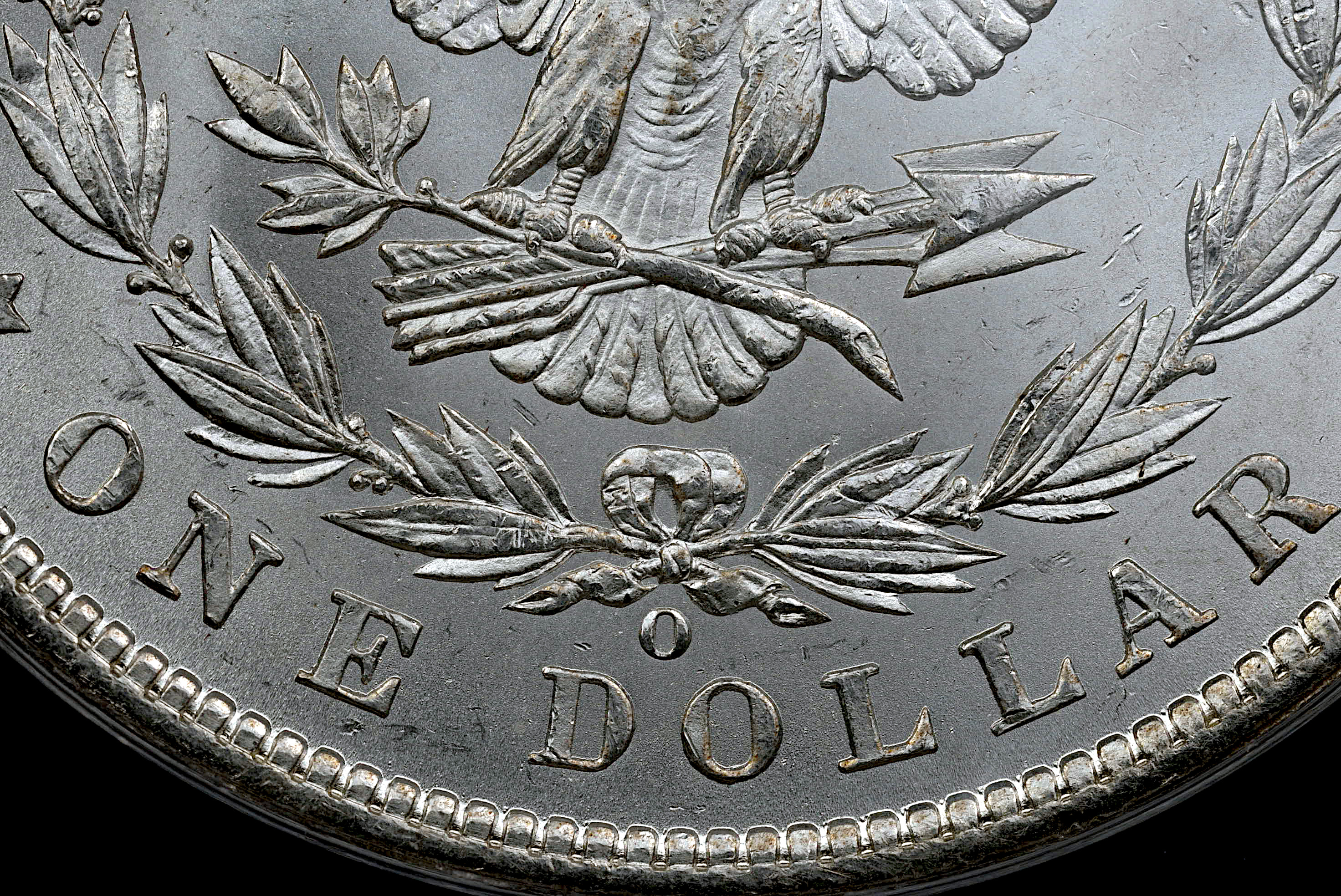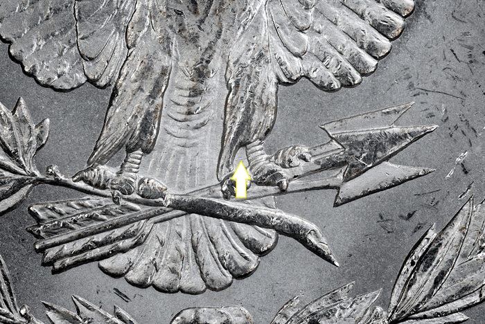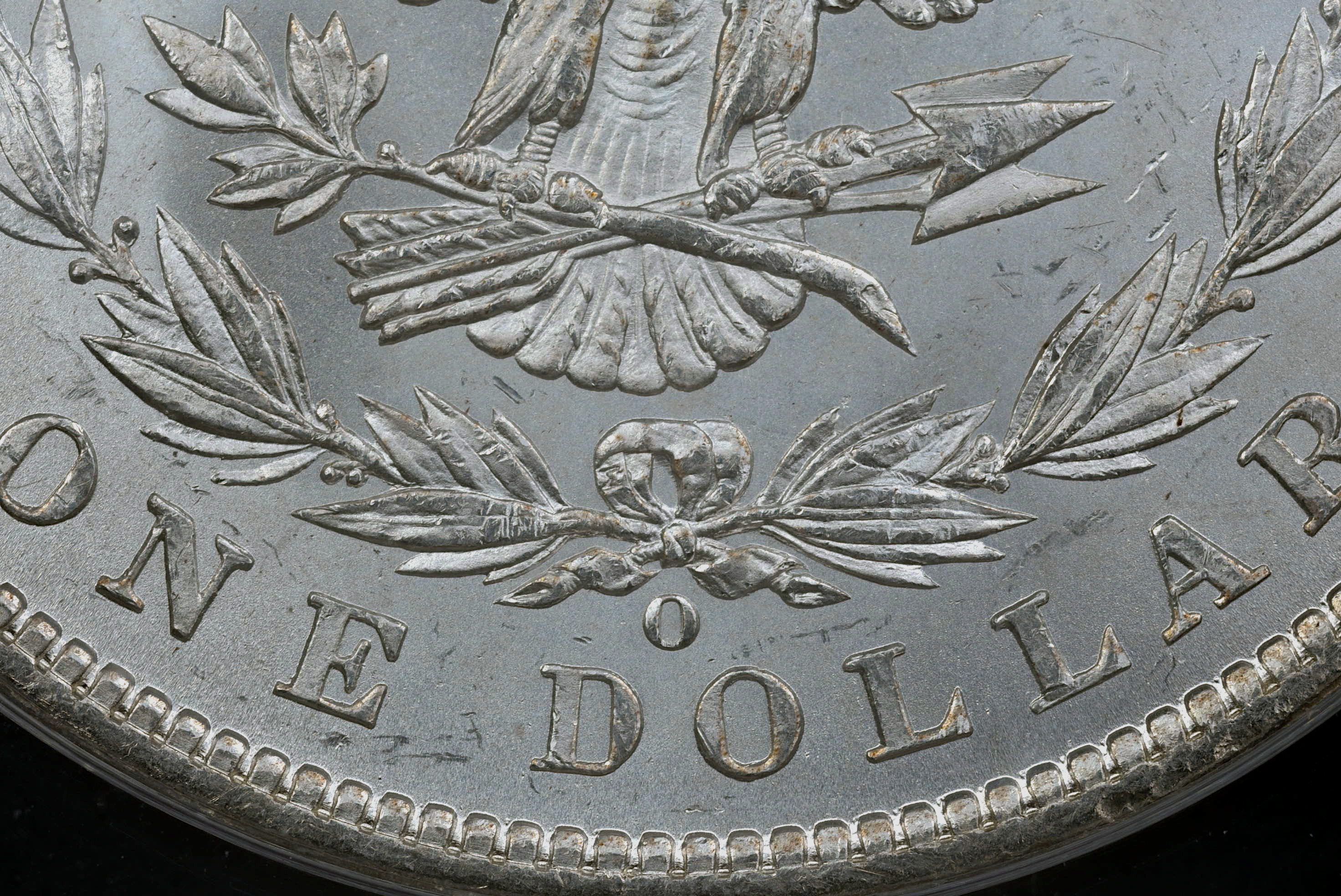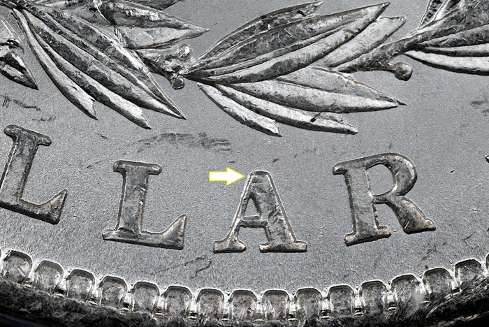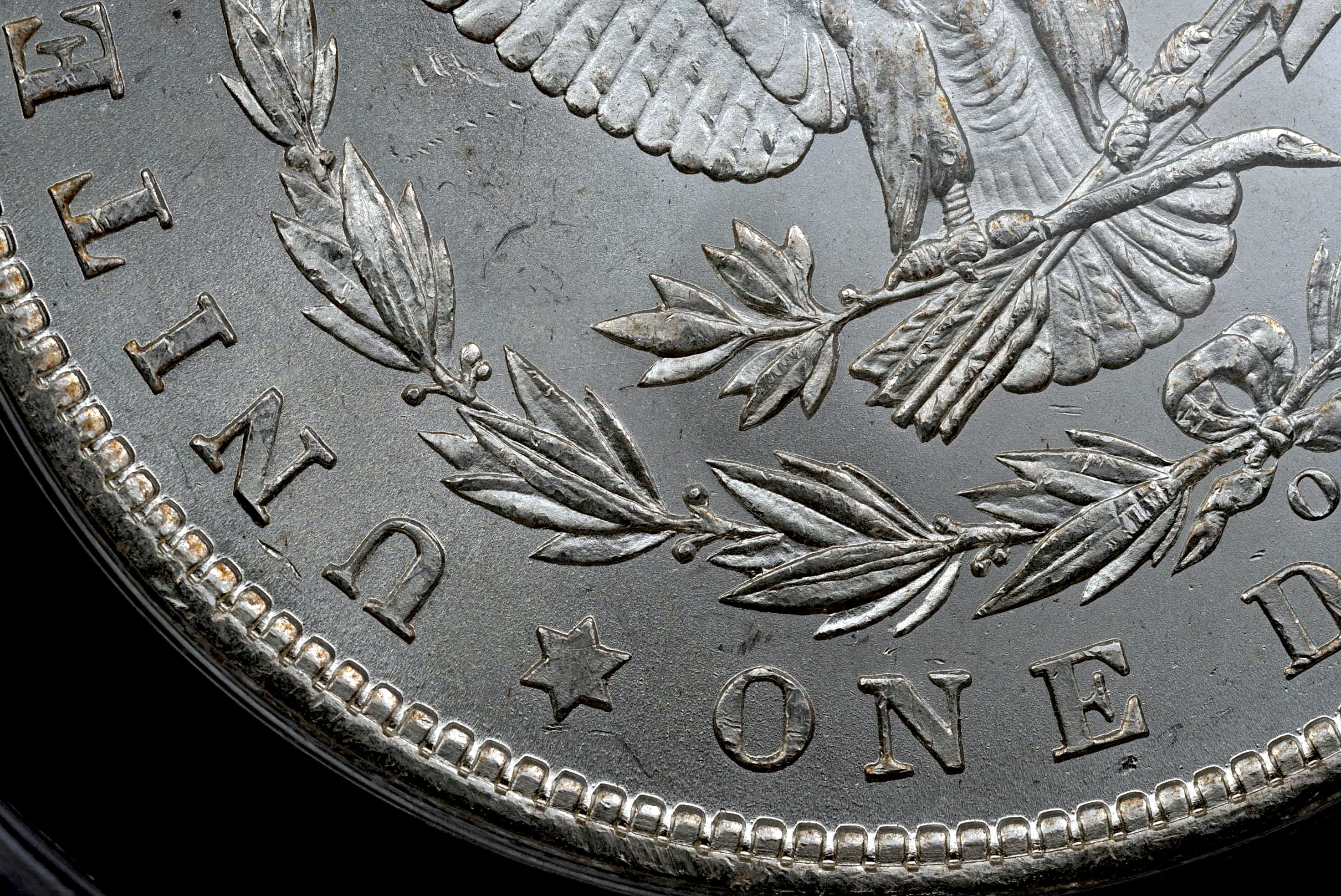 - A feature that has been described as a "Snail" due to its shape, appears on a leaf of Right Wreath Cluster #4. This feature is of the Hub and is seen on Morgan Silver Dollars that were minted from at least 1881 through 1904. A photograph of this feature can be viewed at Photographs of Special Interest. Other features of interest are included in the section entitled Photographs of Special Interest.