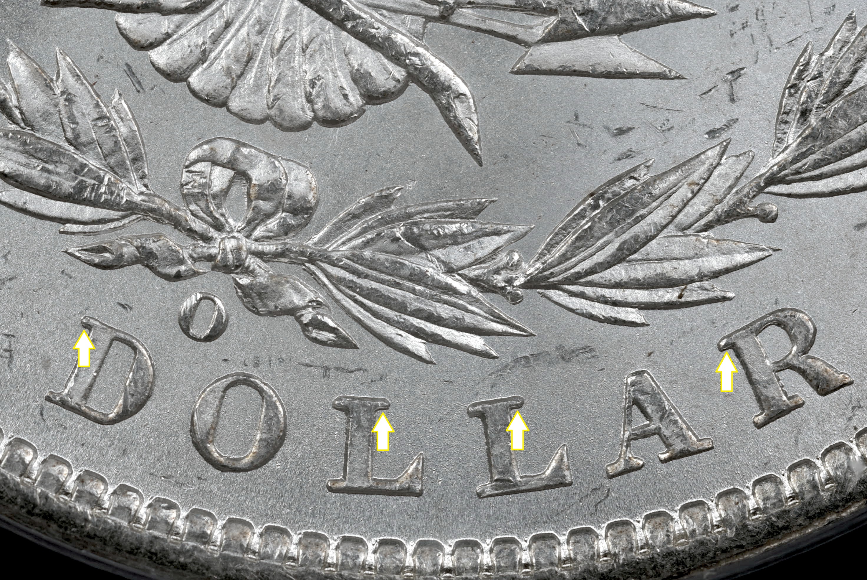 A. Unlike VAM-1B1, VAM-35A, and VAM-35B, which do not show Reverse Motto doubling, the VAM-31, VAM-2A, VAM-13, and VAM 22A1 do show Reverse Motto doubling. Further review of 1904-O Base VAMs will be conducted under the auspices of the SDP. This unique Hub doubling has been seen on other post-1879 Morgan Silver Dollars and should also be included in the aforementioned review. This doubling is seen on the 1901-S VAM-10 as well.
