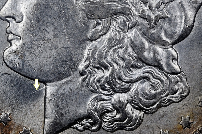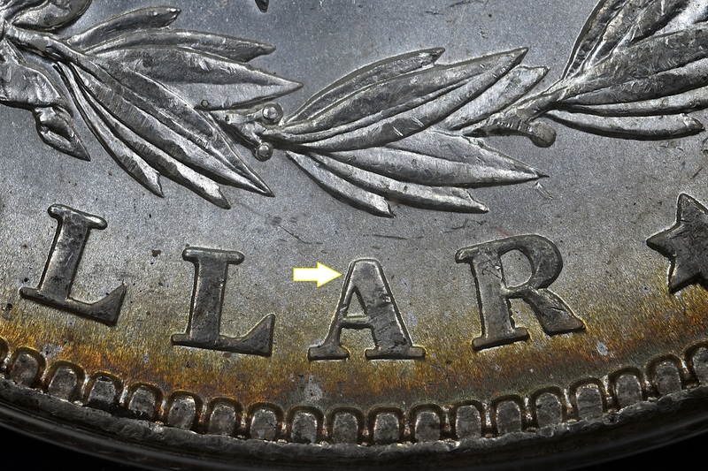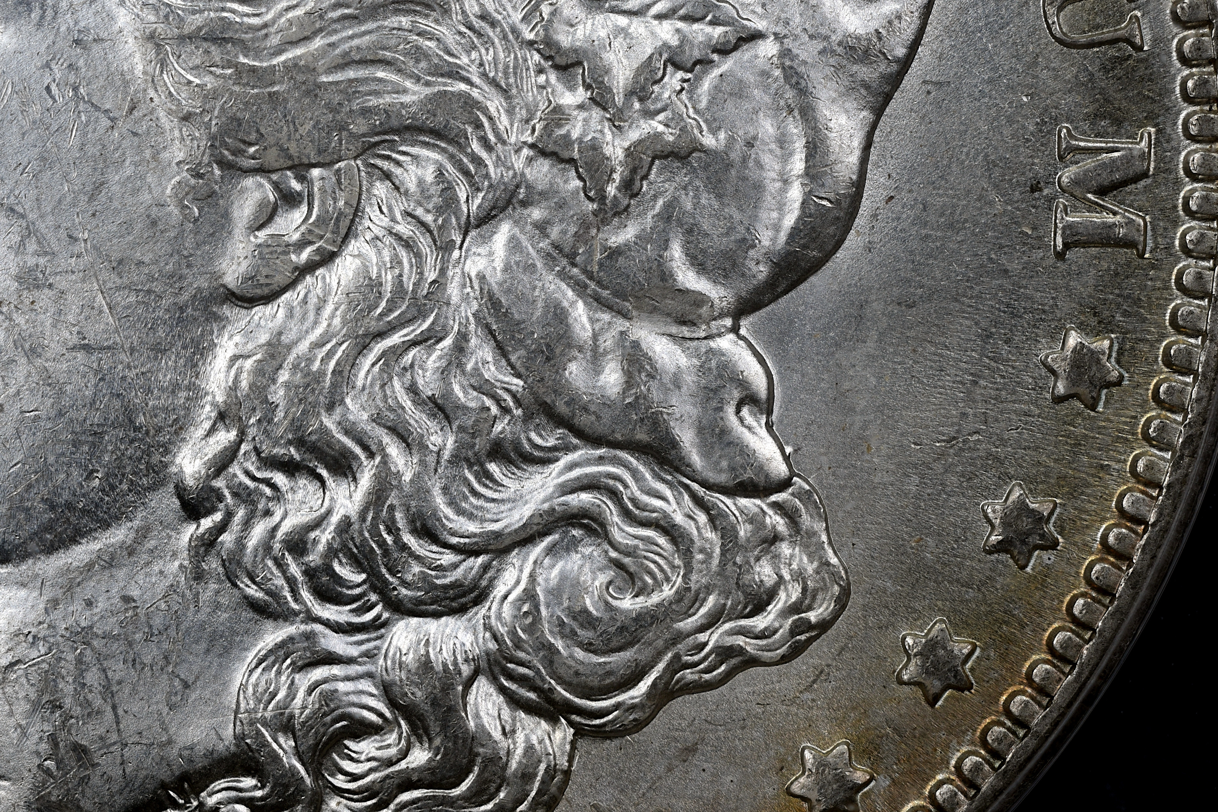 Comment: The "Snail". Looks decidedly un-snailish. This feature has appeared on Morgan Silve Dollars from at least 1883 to 1904 and is of the Die. |