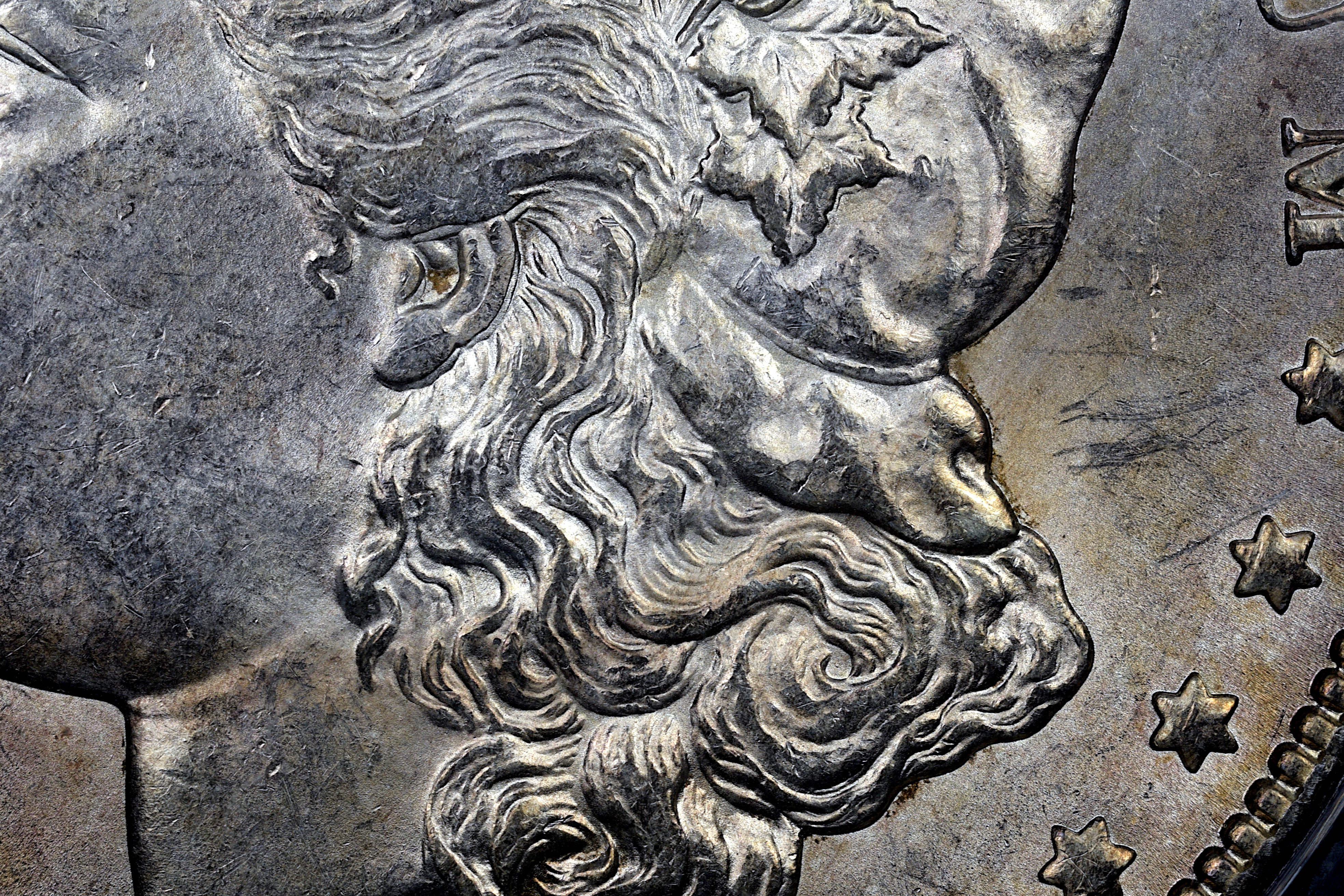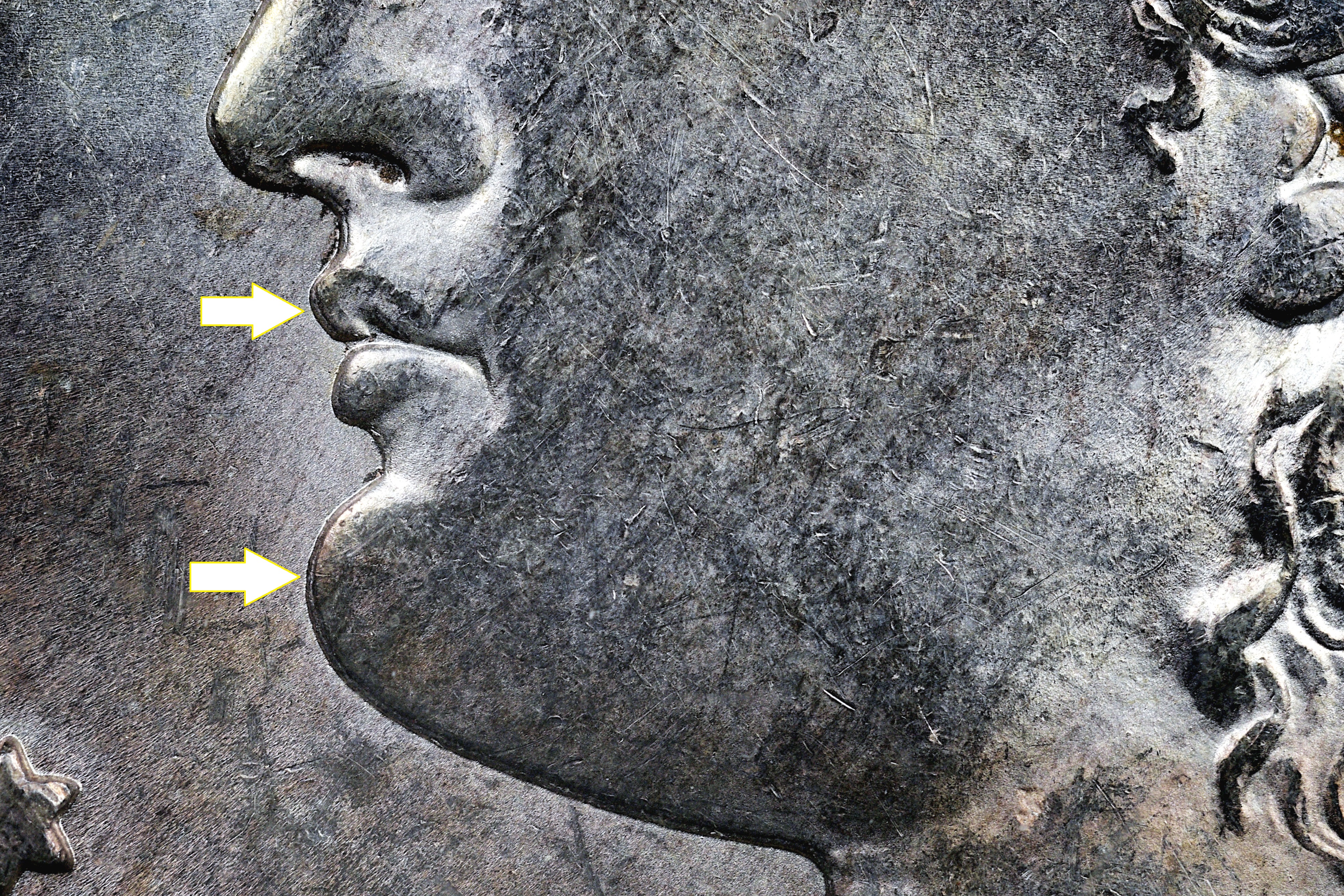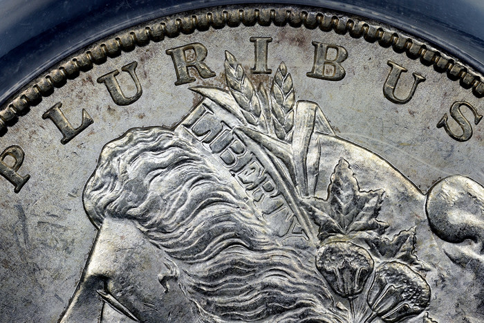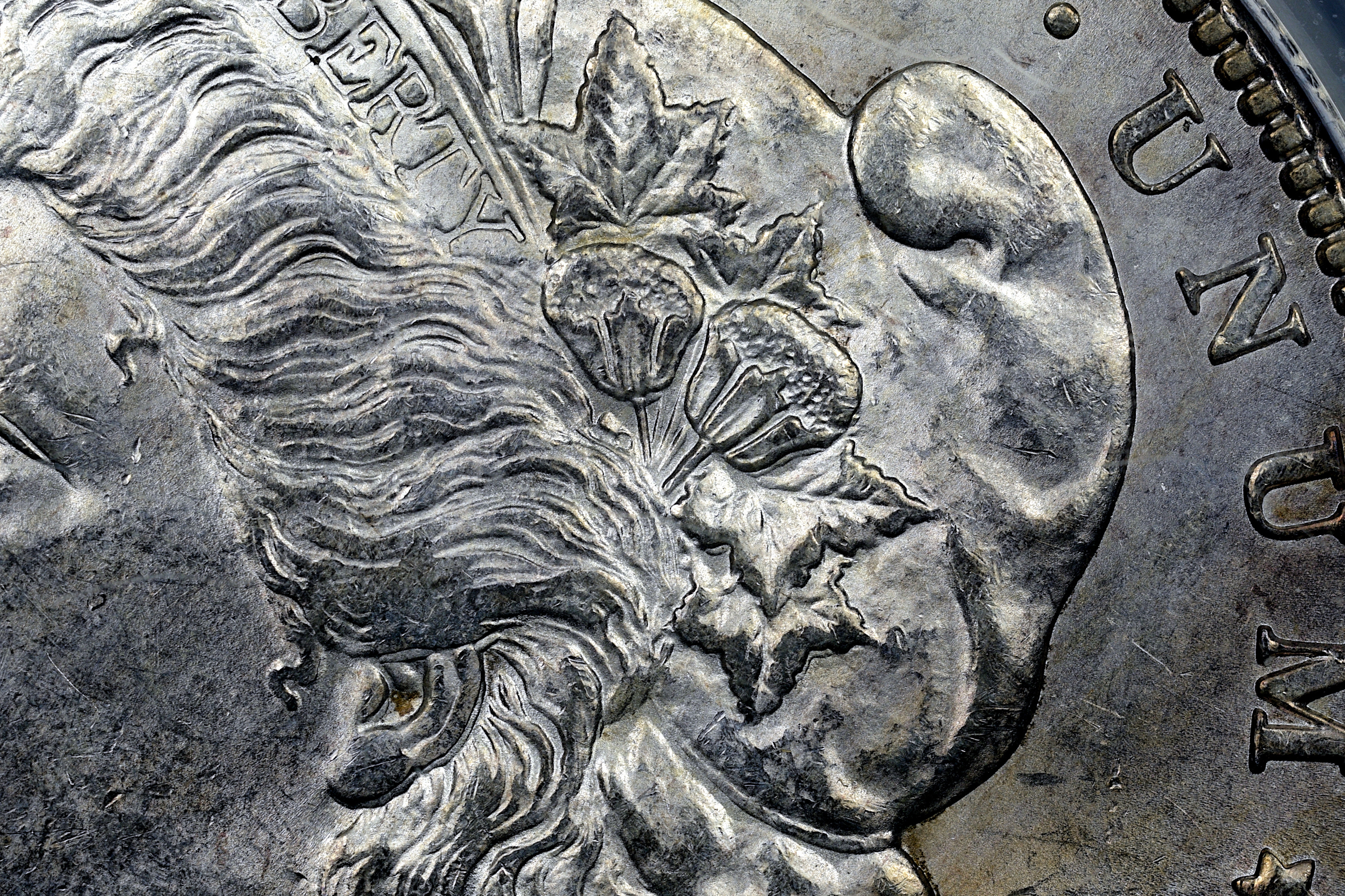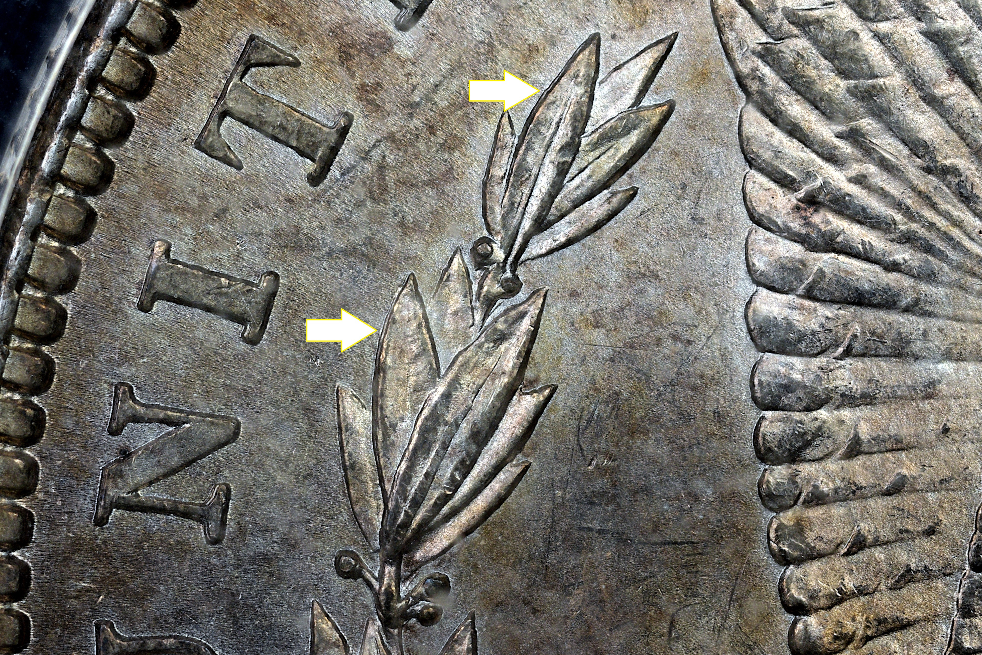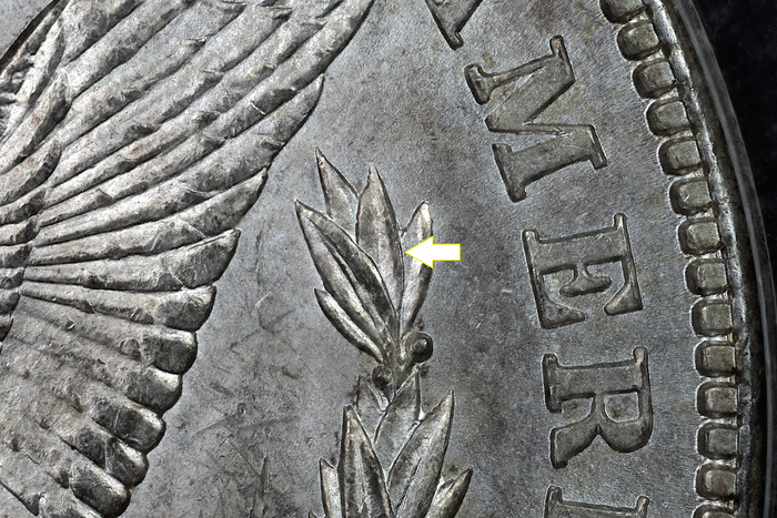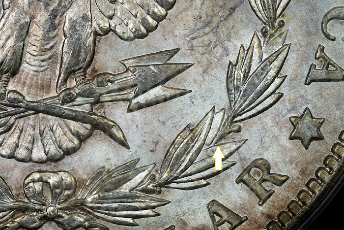 SPECIAL NOTE: A feature that has been described as a "Snail" due to its shape, appears on a leaf of Right Wreath Cluster #4. This feature is of the Hub and is seen on Morgan Silver Dollars that were minted from 1880 through 1904. In the cae of this specimen, the Snail is difficult to see. Photographs of this interesting looking feature can be viewed in the Section entitled
