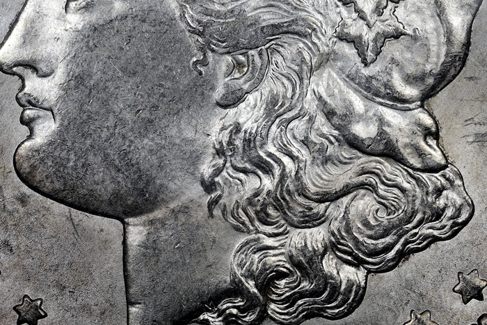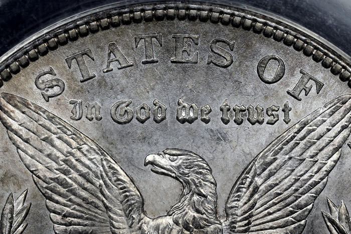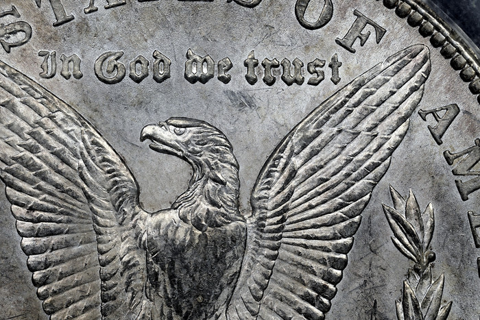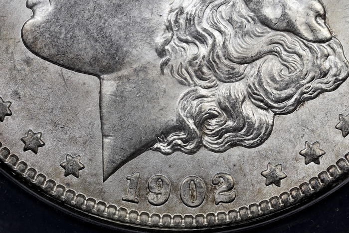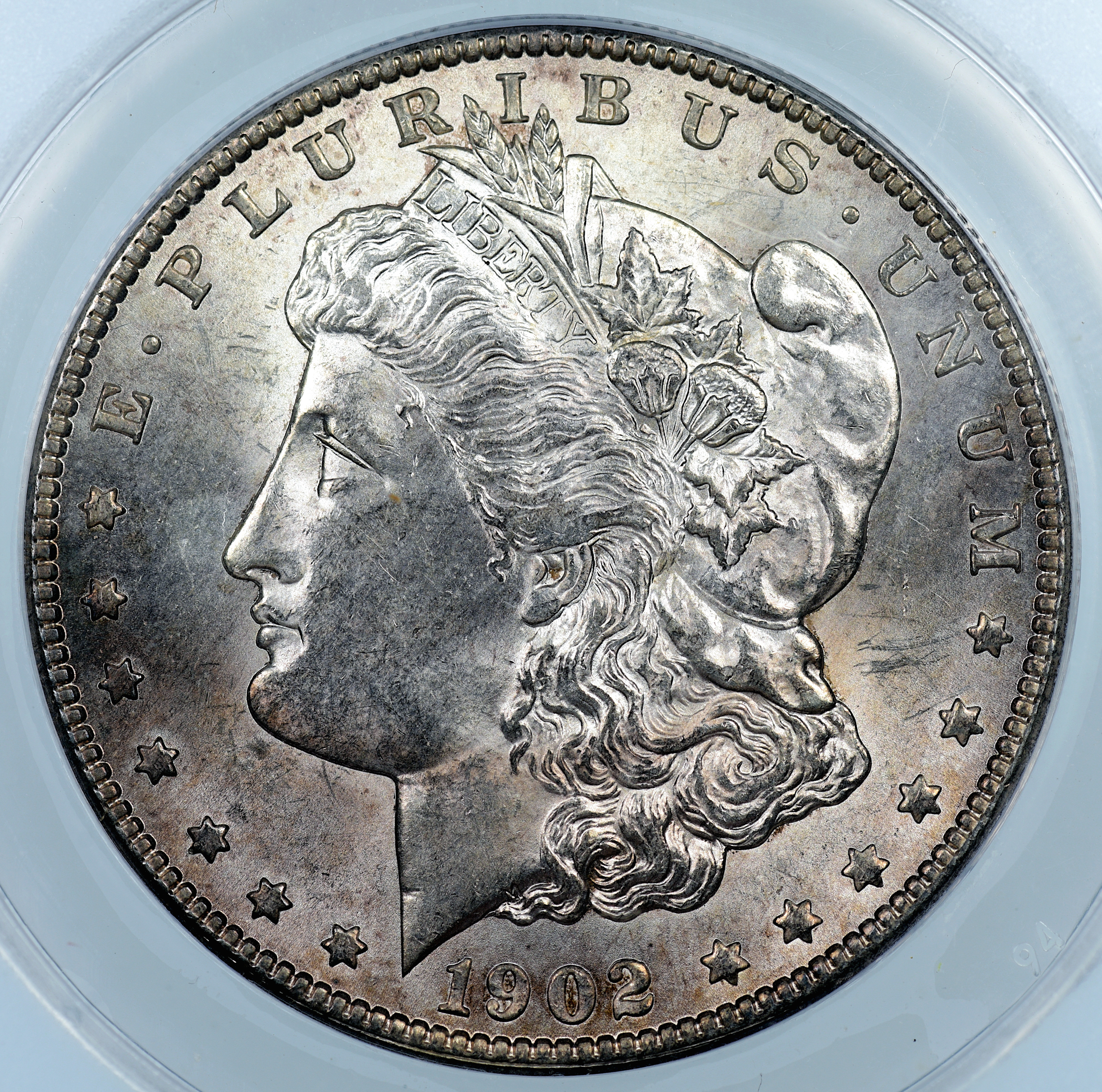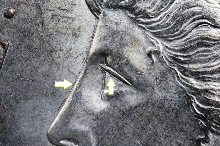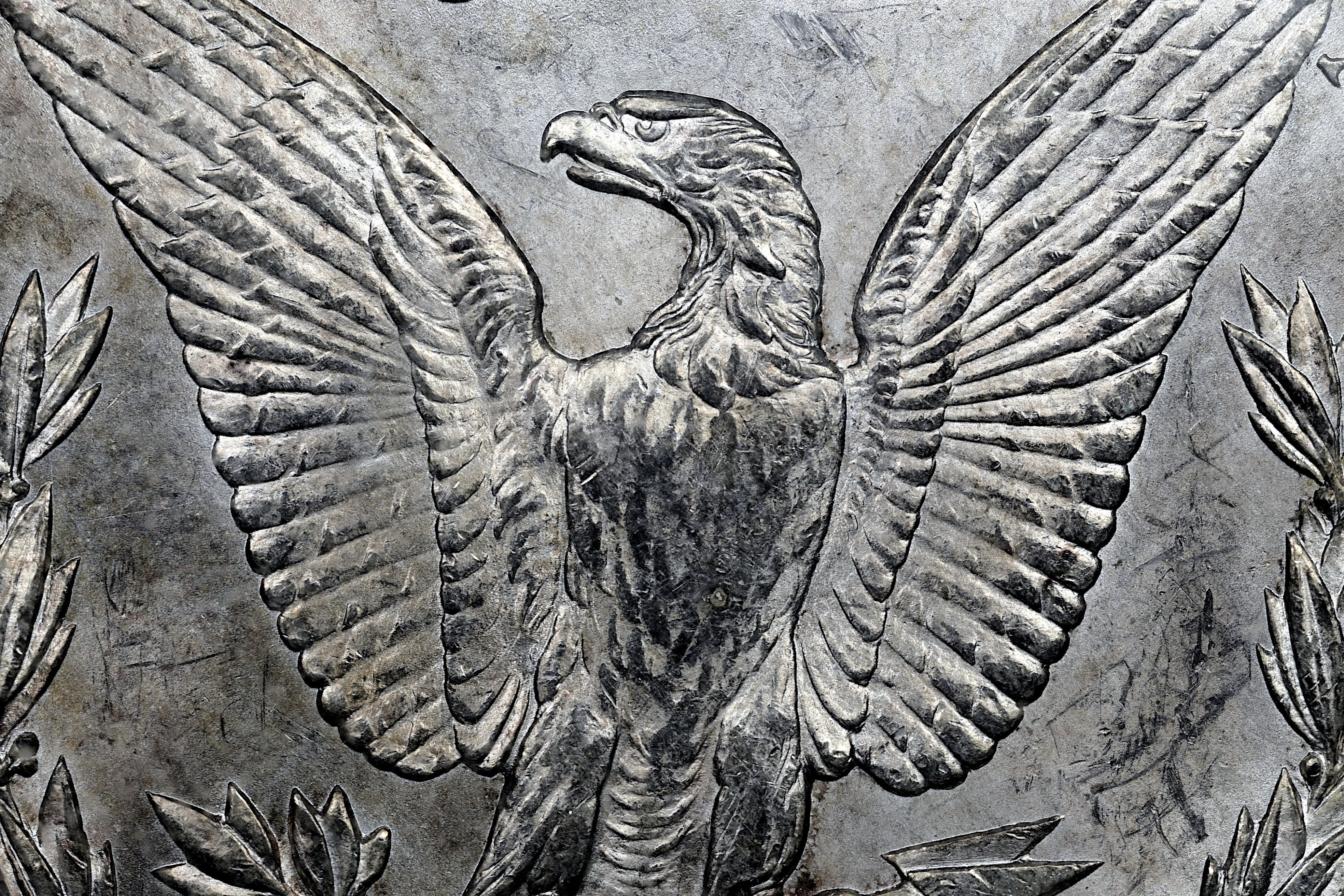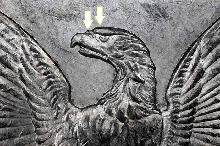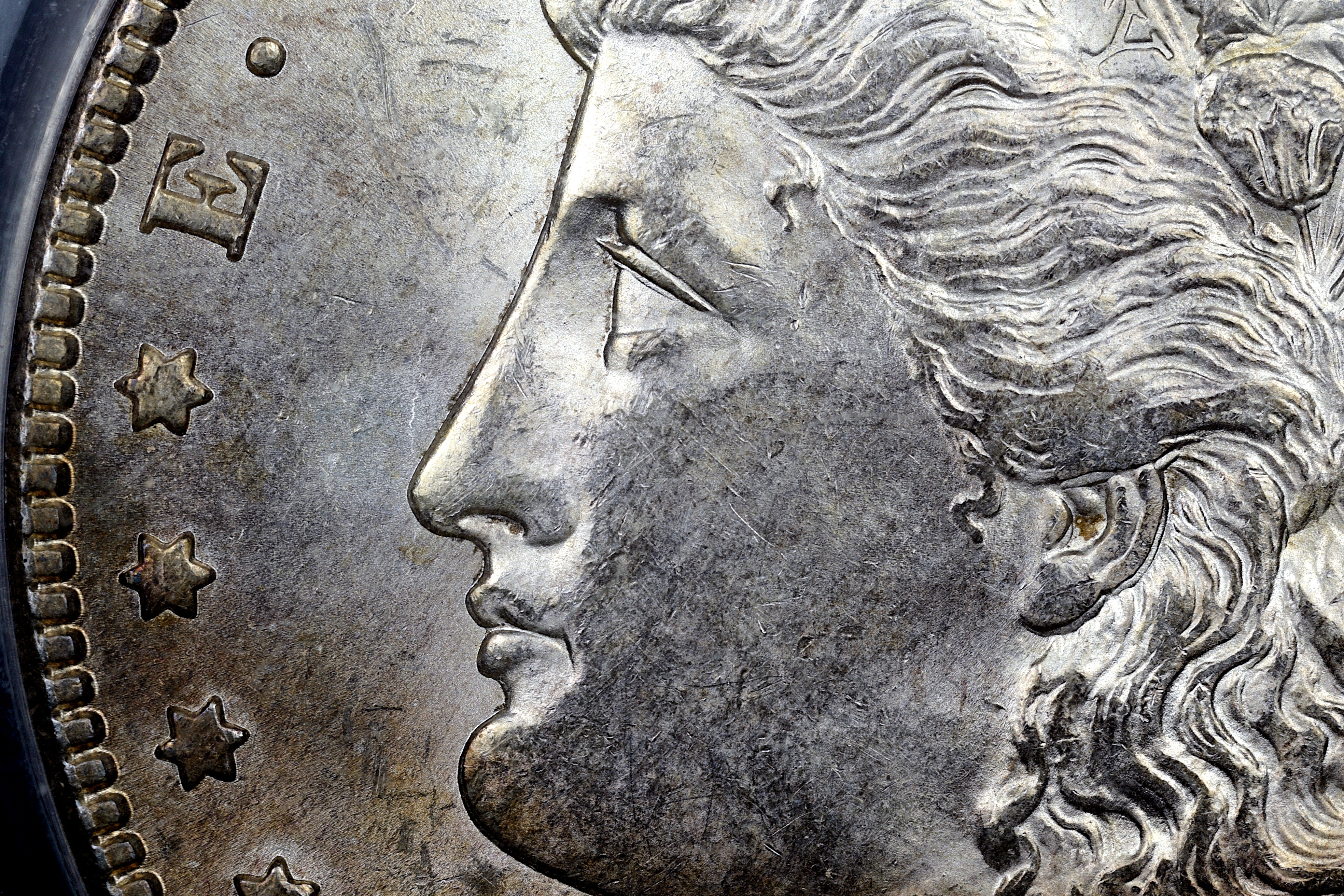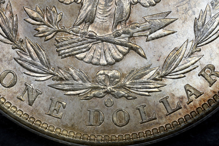 SPECIAL NOTE: A feature that has been described as a "Snail" due to its shape, appears on a leaf of Right Wreath Cluster #4. This feature is of the Hub and is seen on Morgan Silver Dollars that were minted from 1880 through 1904. In the cae of this specimen, the Snail is difficult to see. Photographs of this interesting looking feature can be viewed in the Section entitled