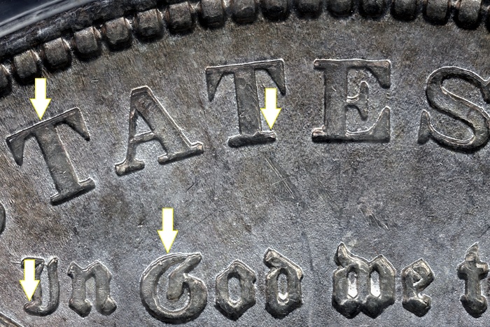 - Die chips are present at the the first S in the second letter of the Reverse Legend, UNITED STATES OF AMERICA.