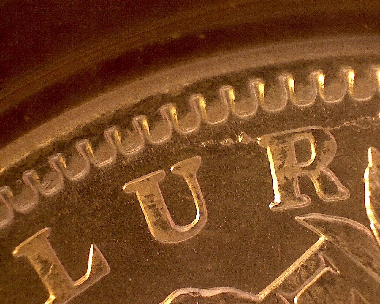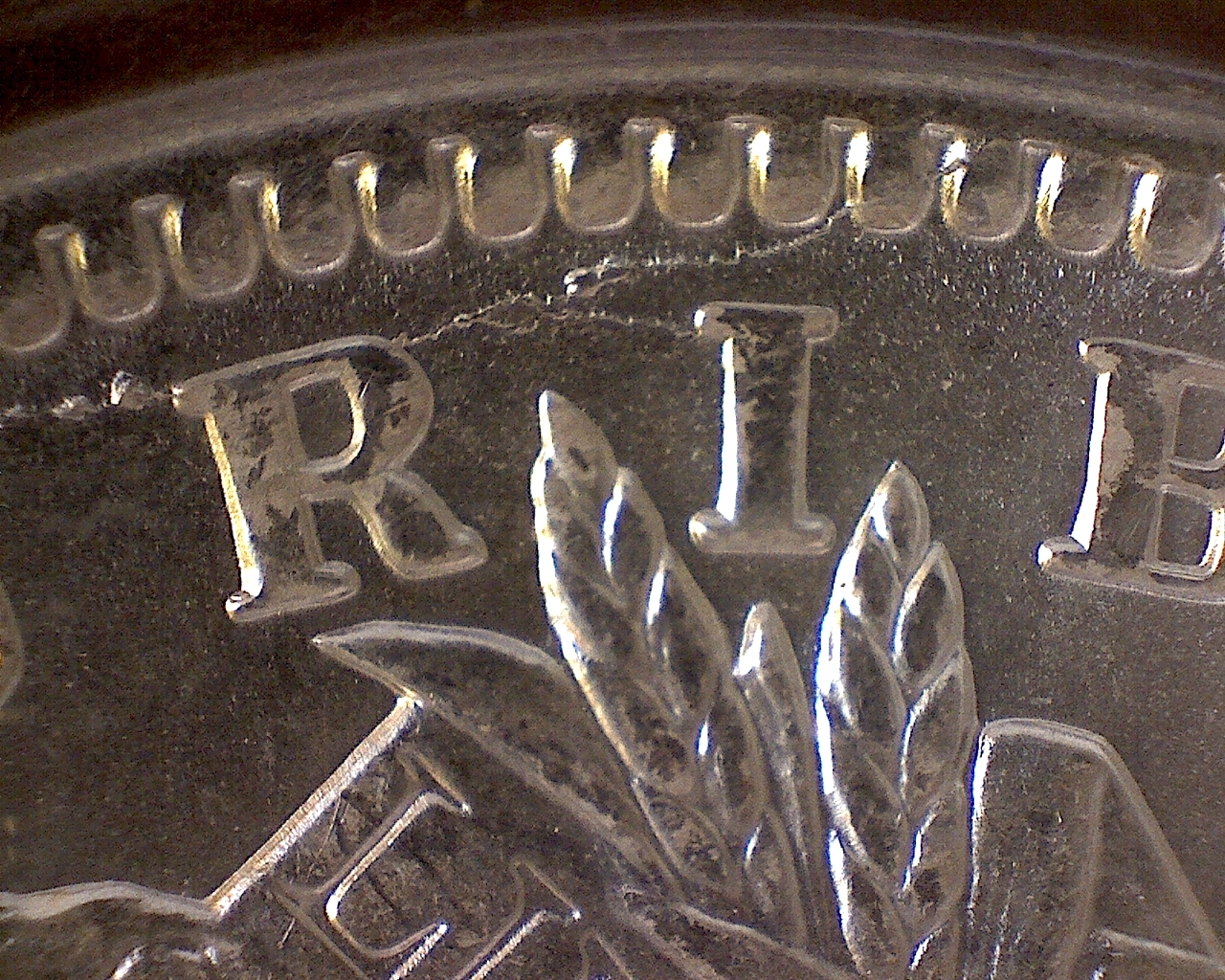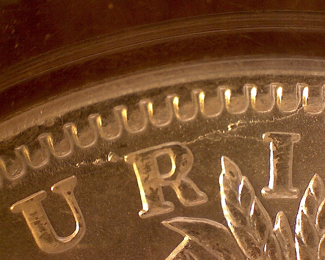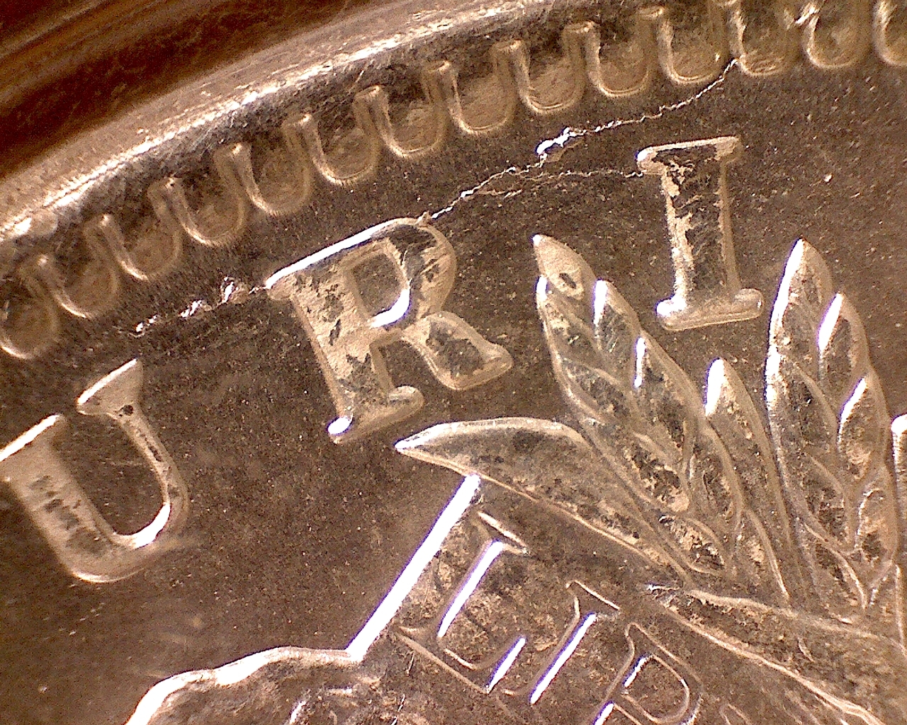 | Obverse: Near Date, Doubled profile . Die Crack through "R" in Pluribus up to denticles and small chip between "R & I". |