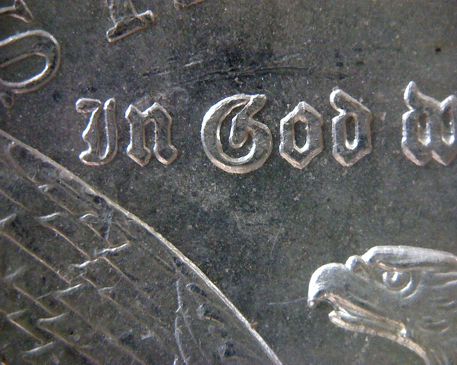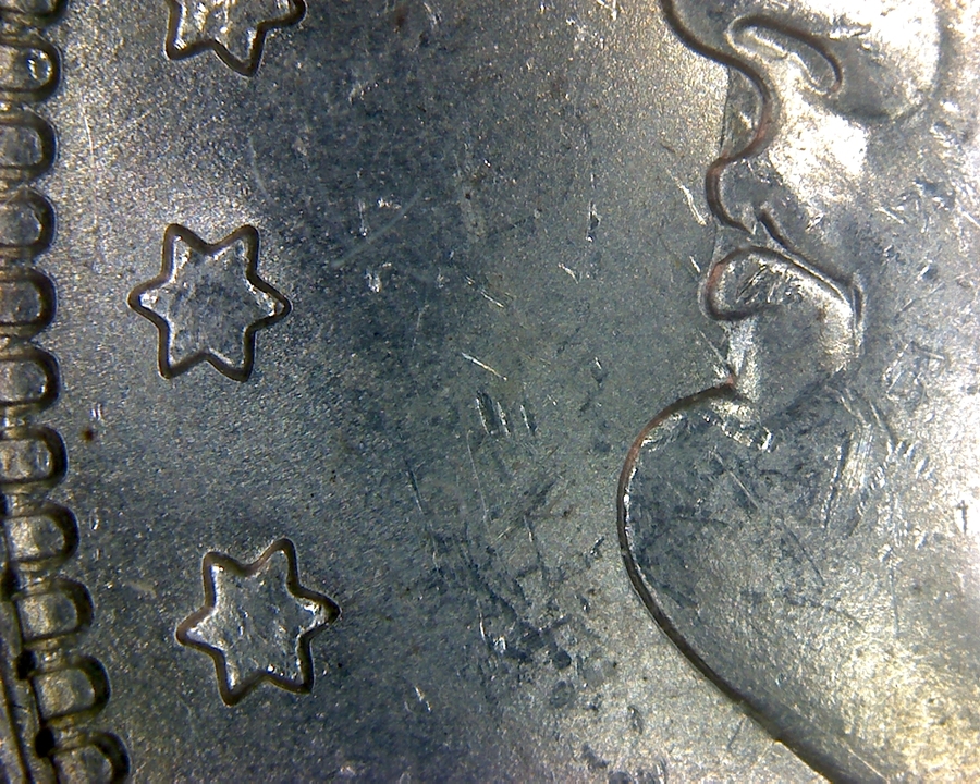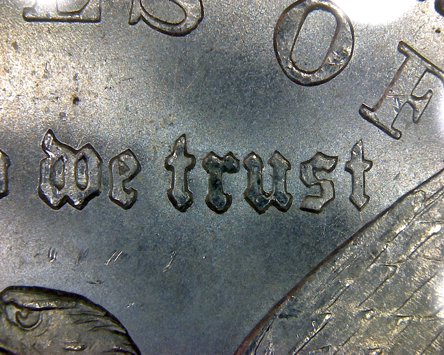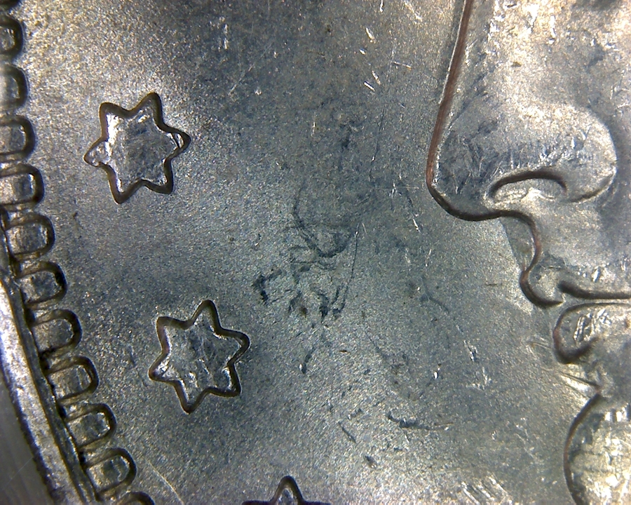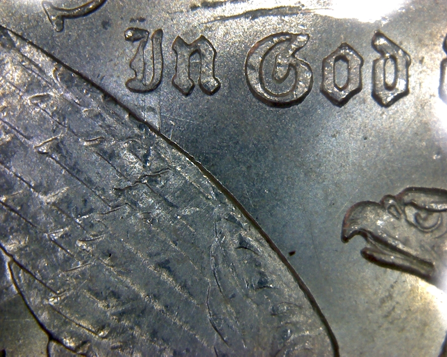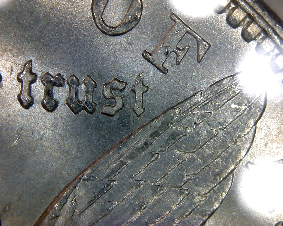 | Obverse: Strong Die clash marks around lips and nose with partial incuse I from "In" of reverse next to Liberty's neck. Also partial incuse "u" from "Trust" of reverse showing in lower right Hair Vee. |