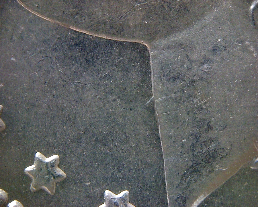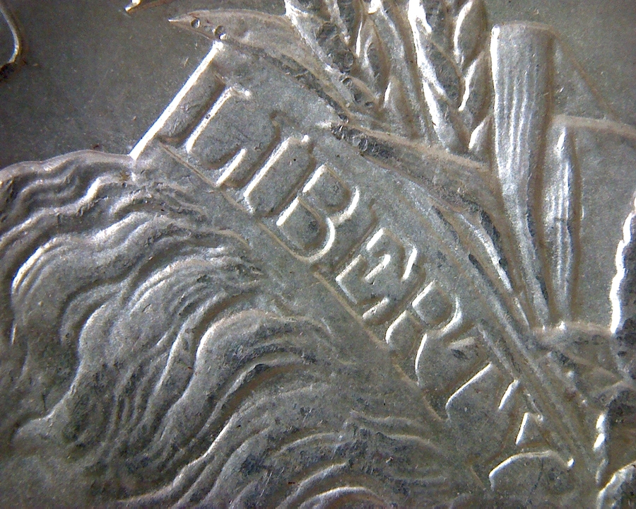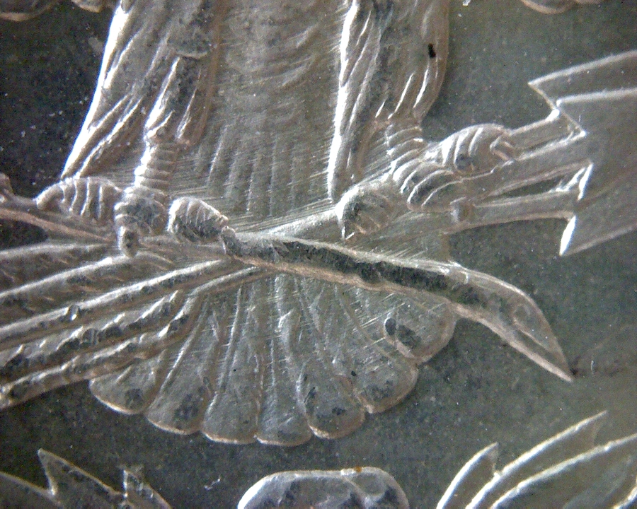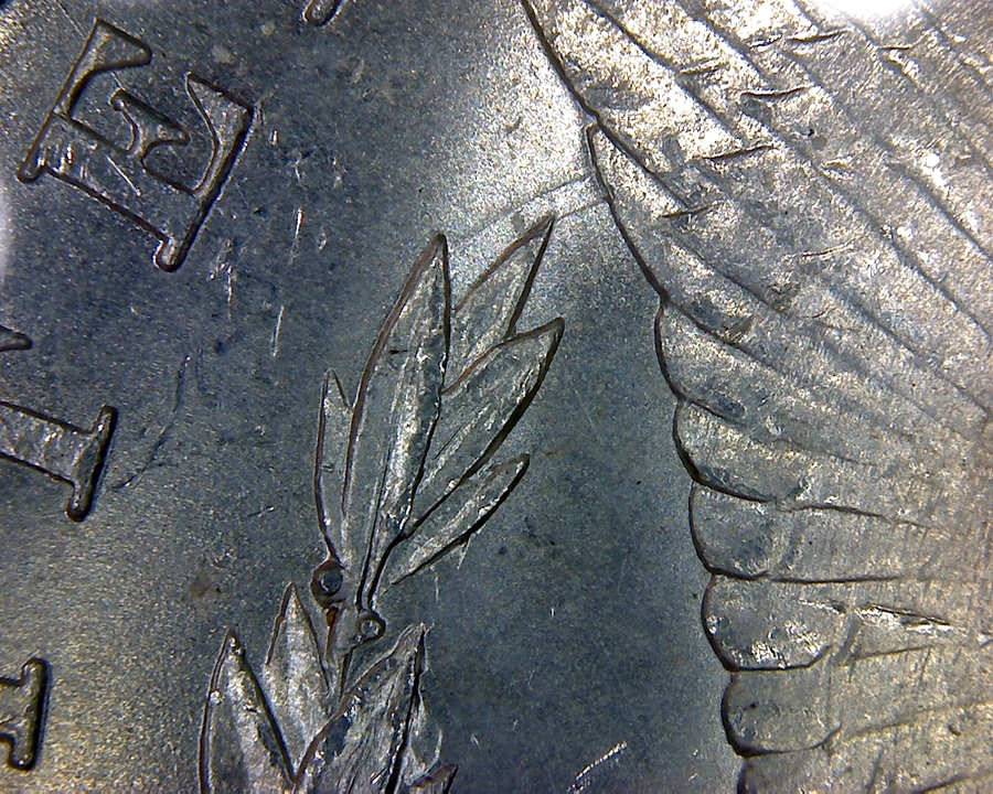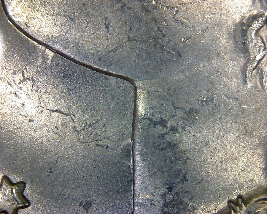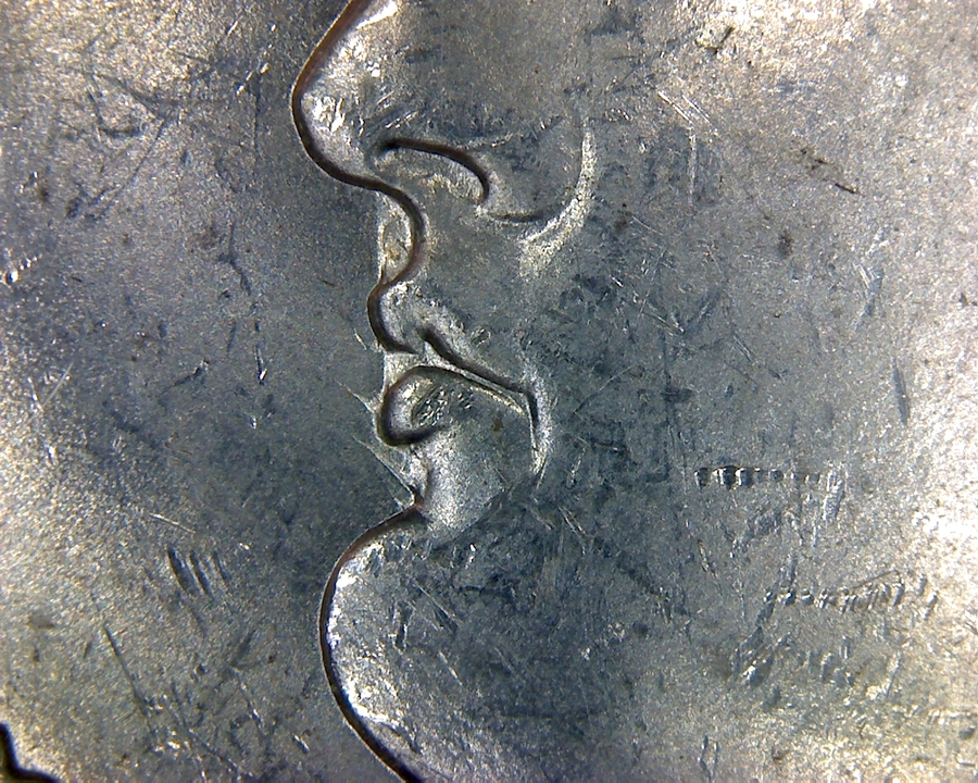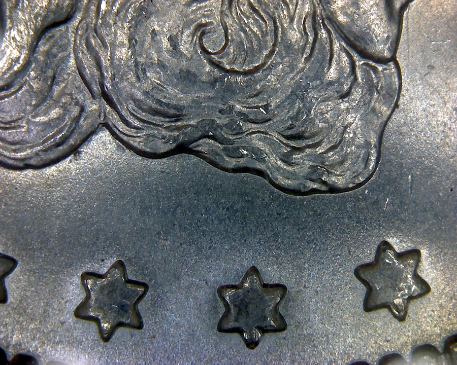 | Obverse: Strong Die clash marks around lips and nose with partial incuse I from "In" of reverse next to Liberty's neck. Also partial incuse "u" from "Trust" of reverse showing in lower right Hair Vee. |