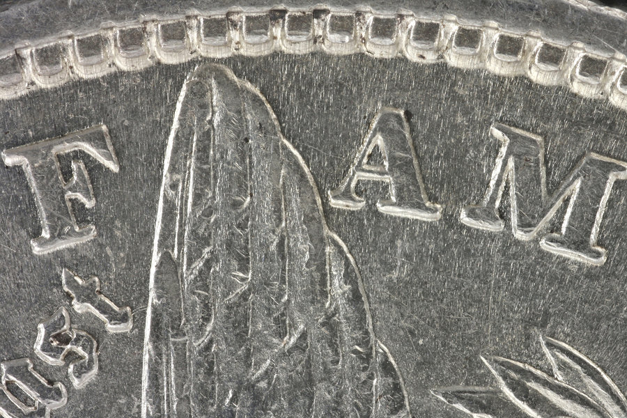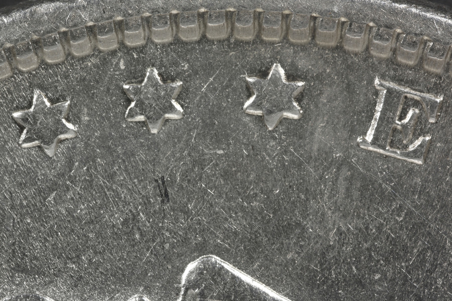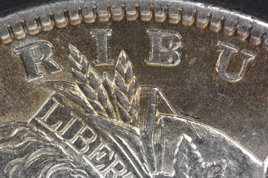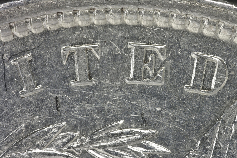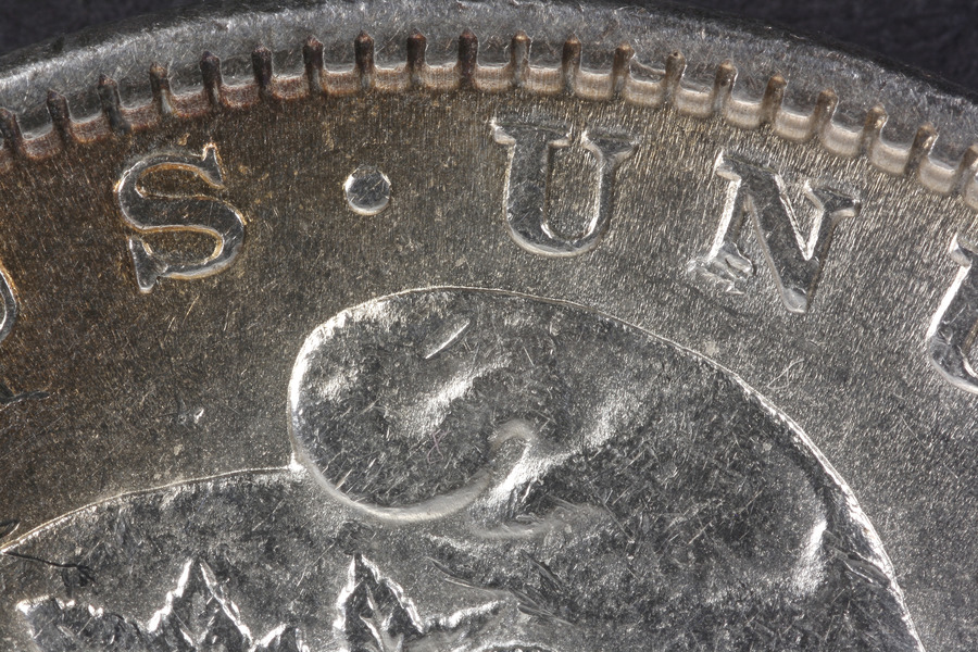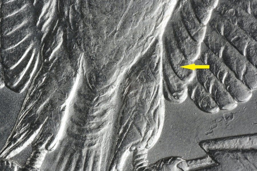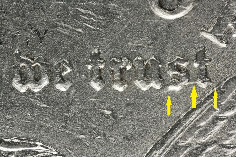 | Reverse: C3a Normal die. Double clash of Liberty's chin, lips, and nose bridge beginning at the eagles right wing above LW1 and extending down and terminating just below LW3. Double clash of at the inside of RW1. Strong double clash of Liberty's neck line at the top of the eagles right wing extending into the n of In. Double clash of Libety's hair vee area at the base of the st in trust. Marker Thread-like impression on the lower left wing, second inner feather up. |