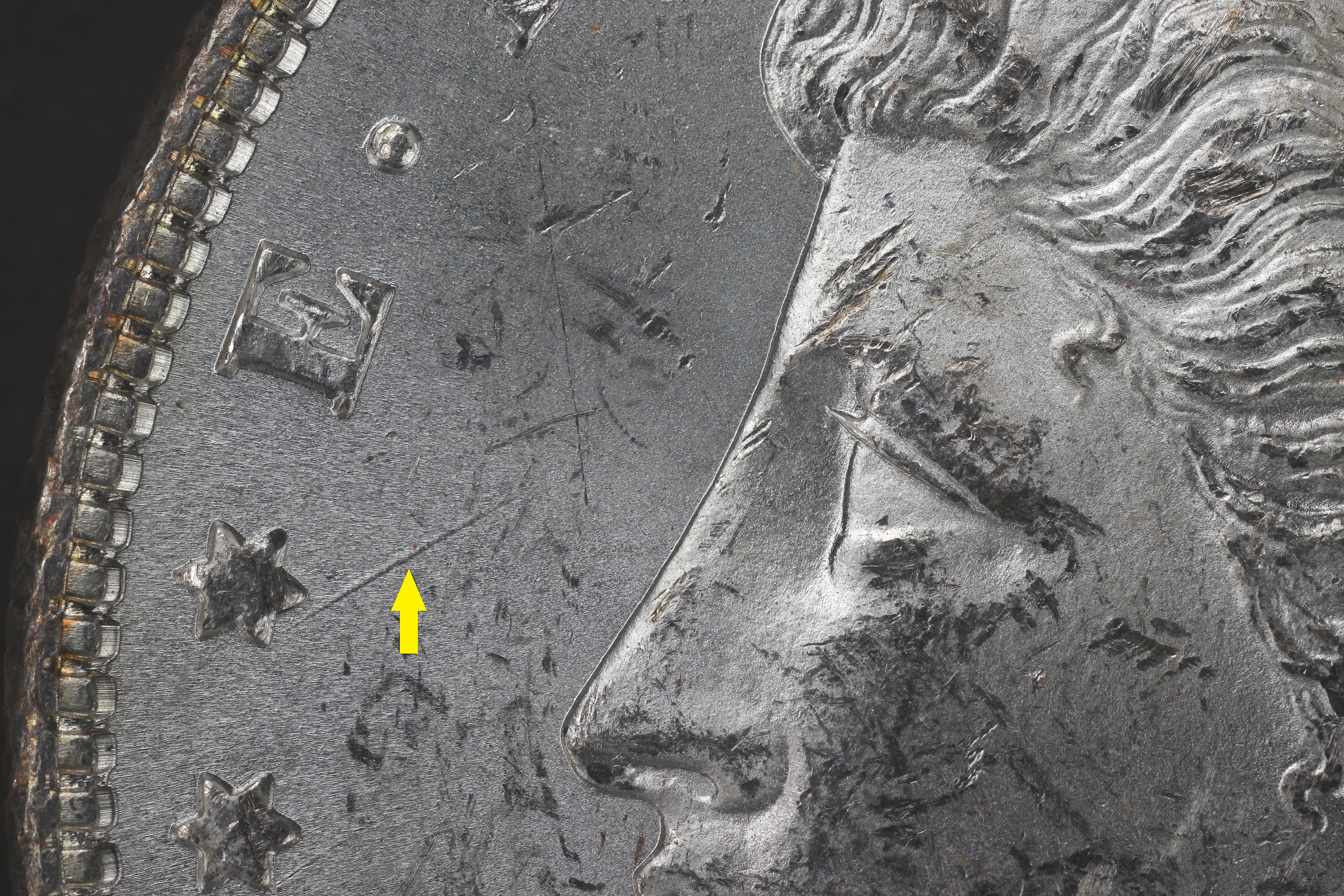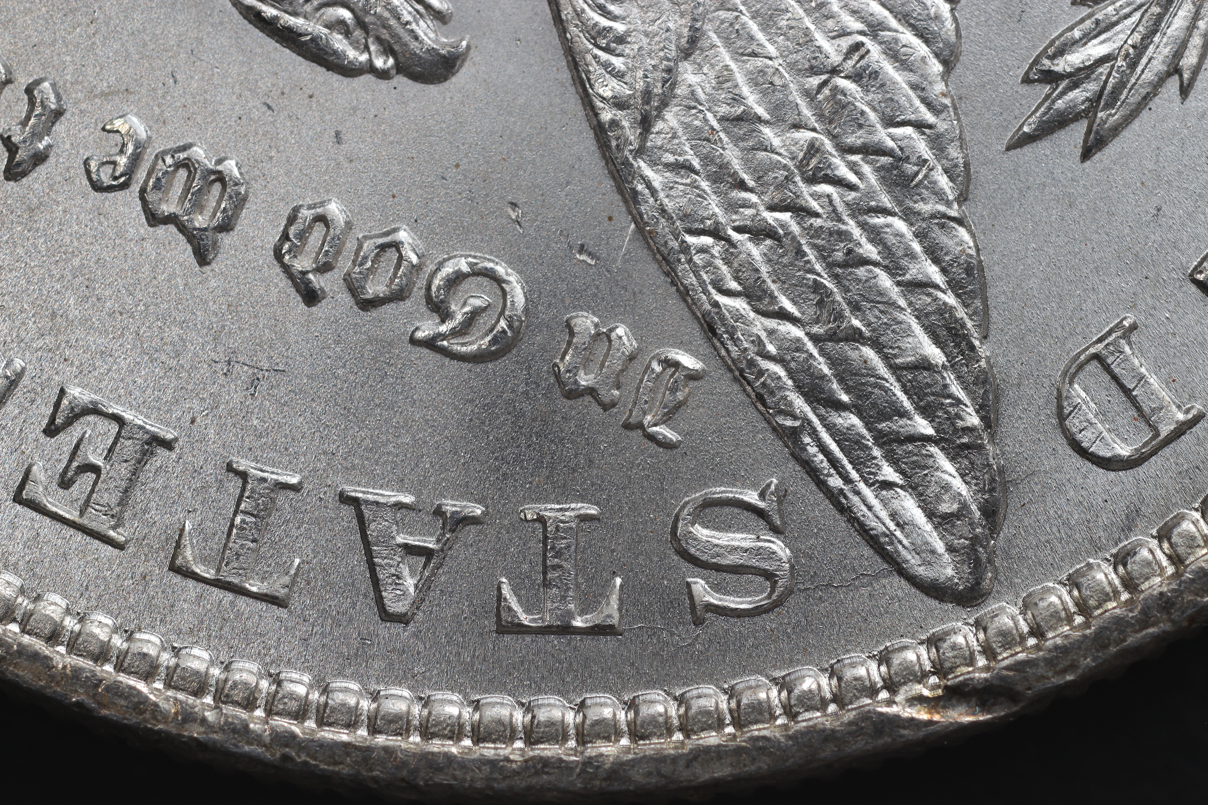• Weak die crack across the tip of the eagle's right wing tip into/across the top of the ST of STATES.