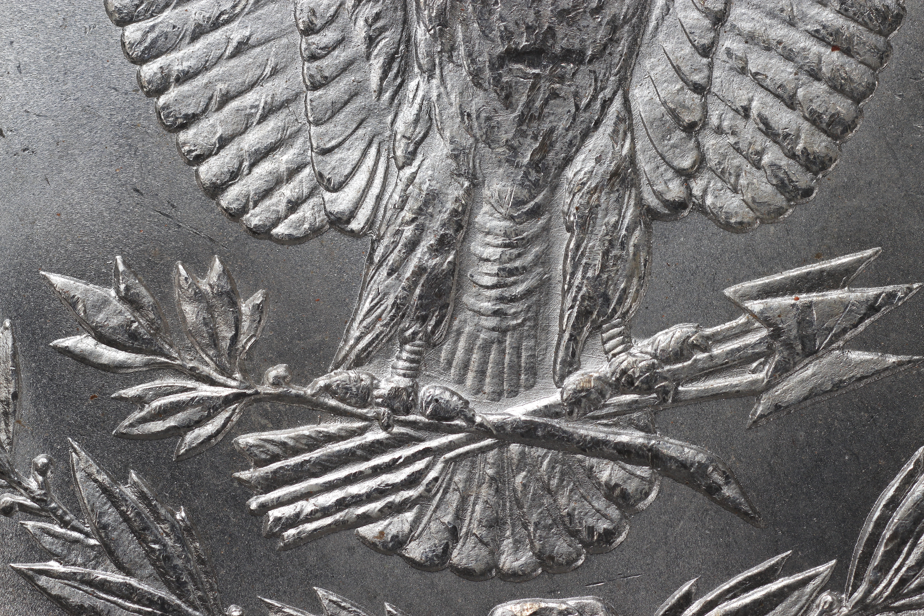 • Fine, dense cross-hatch polish lines inside/around the wreath bow, eagle's lower/upper tail feathers,wing-neck gap and left/right leg triangle voids.
