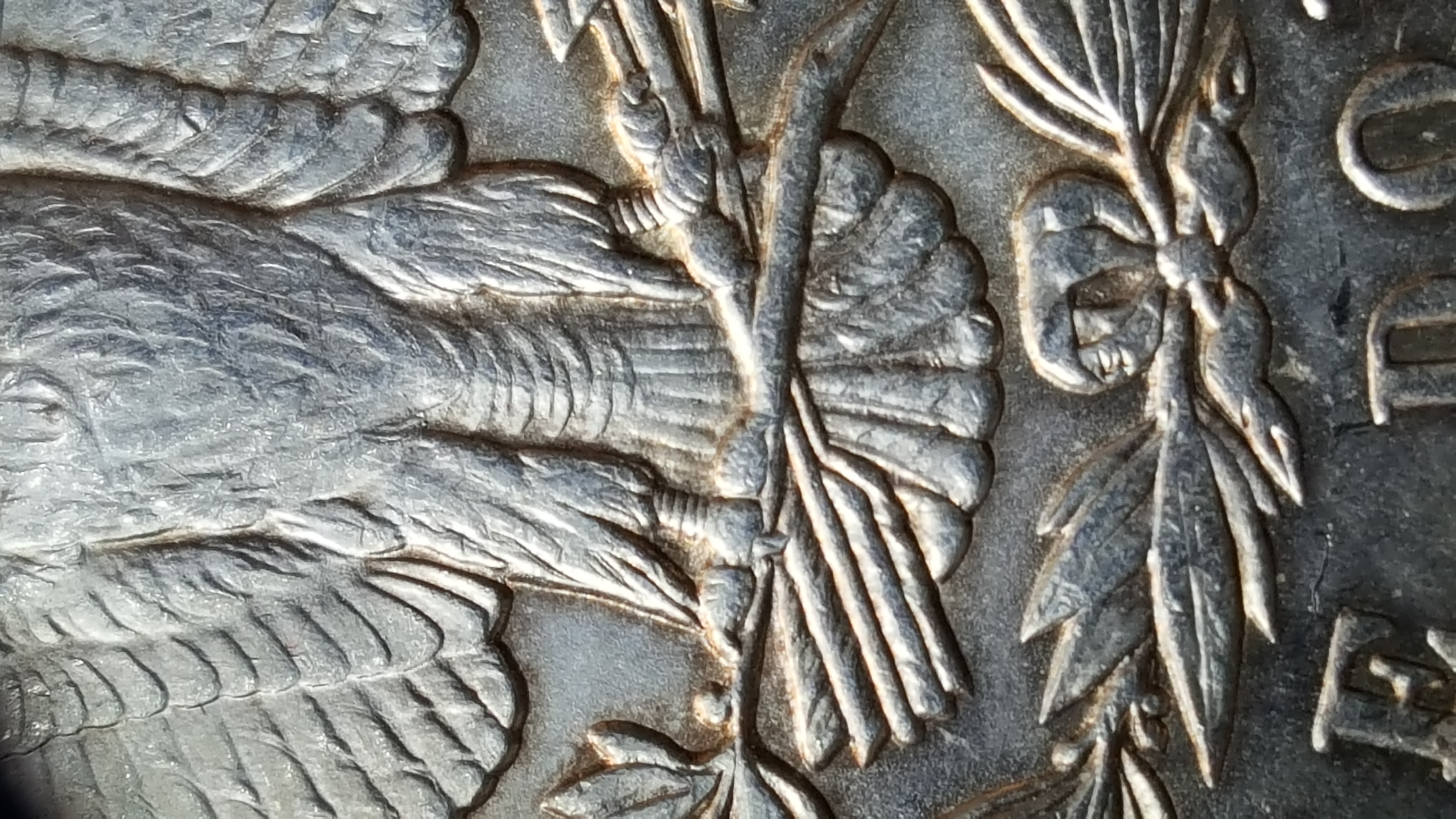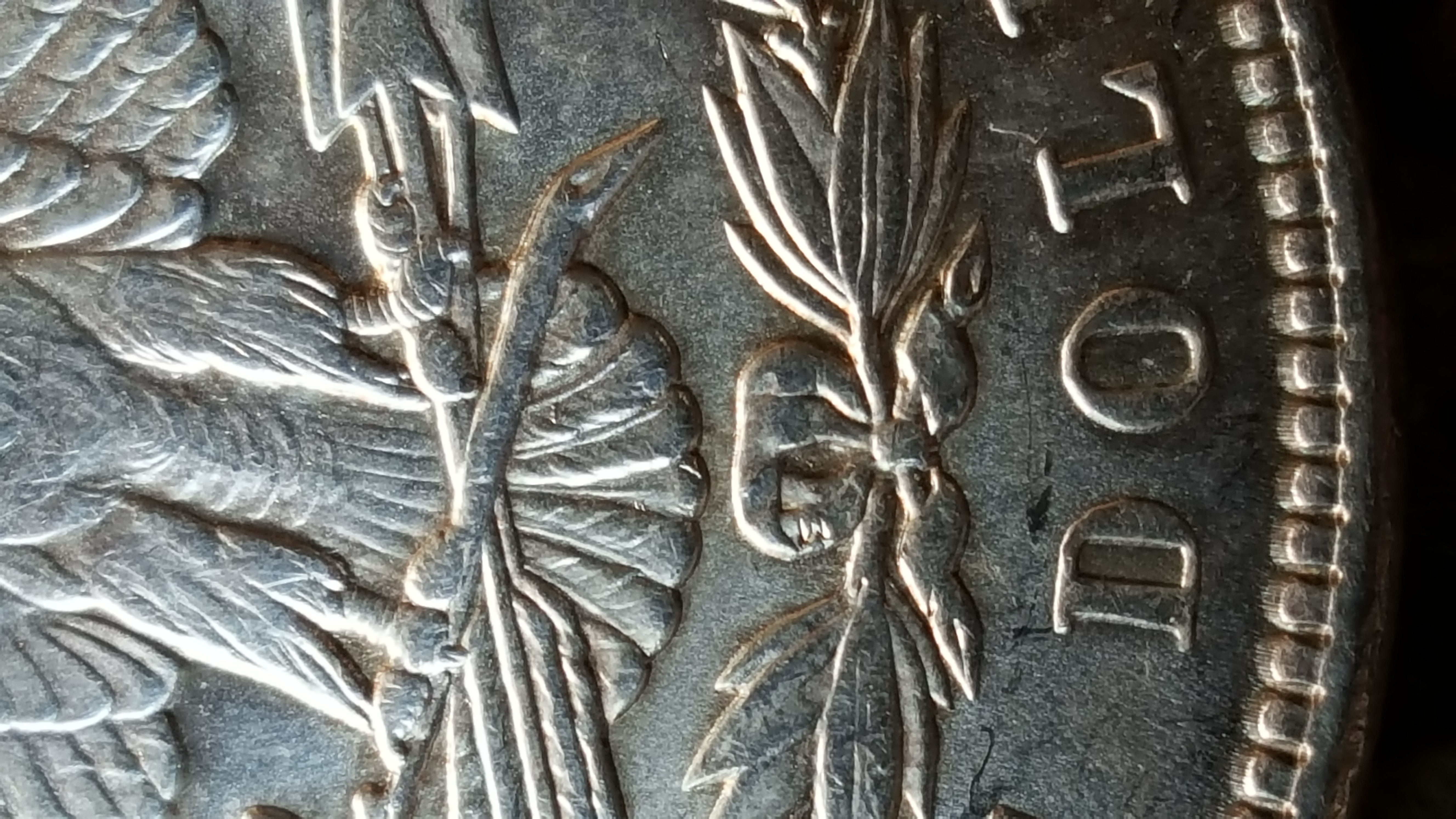 | Metal dots below beak. | Diagonal lines in the left wing gap. |
