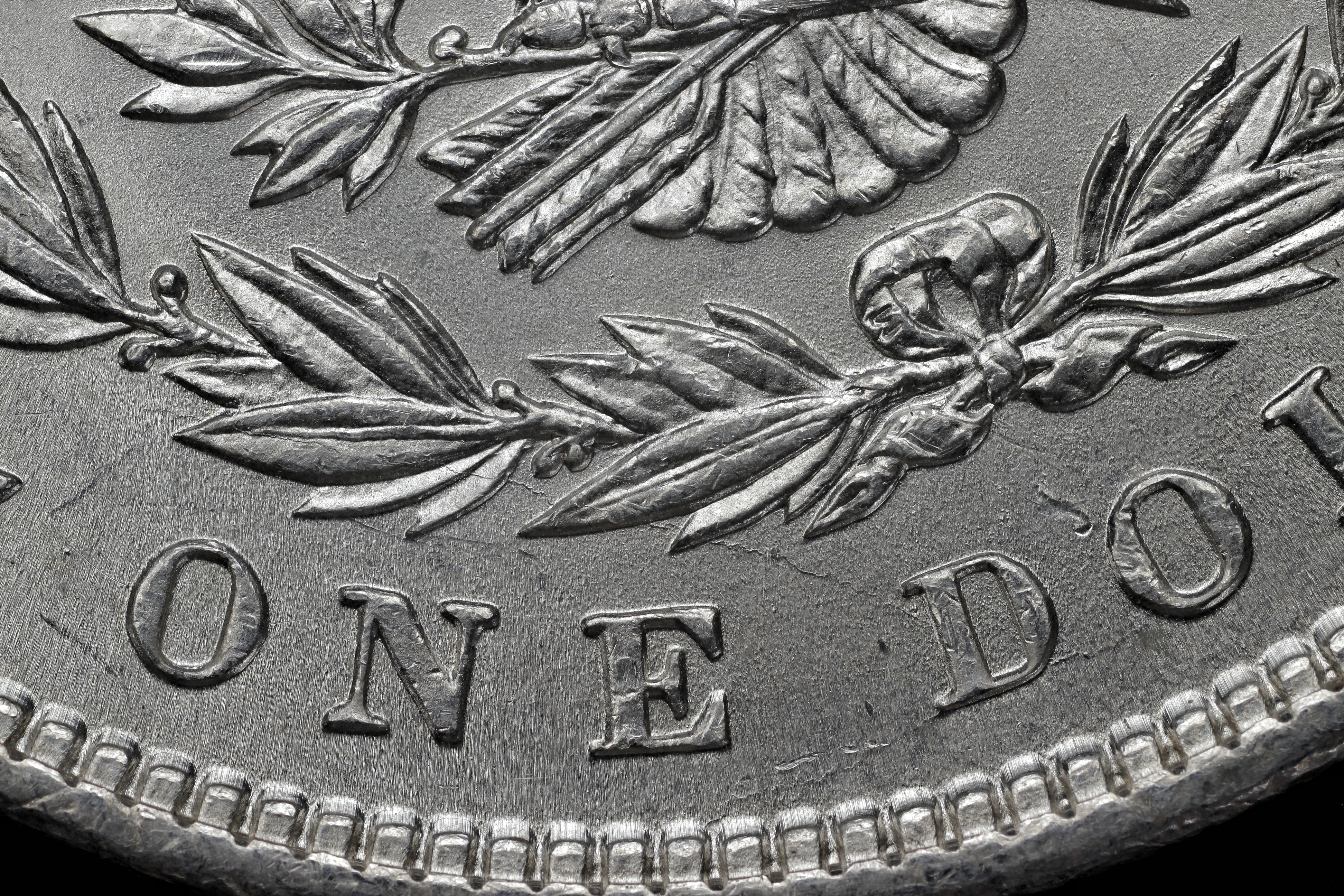 • Die crack from the denticles below the E of ONE into the left side of the D in DOLLAR and out the right side ending at the left side of the O of DOLLAR.
