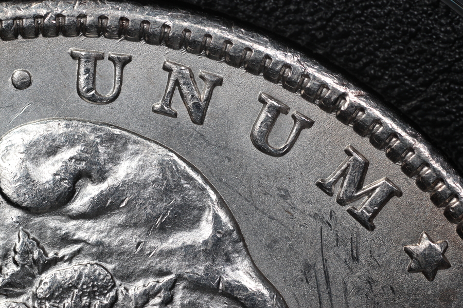 • Short diagonal die scratches out from the denticles above the E, RIB & UN.