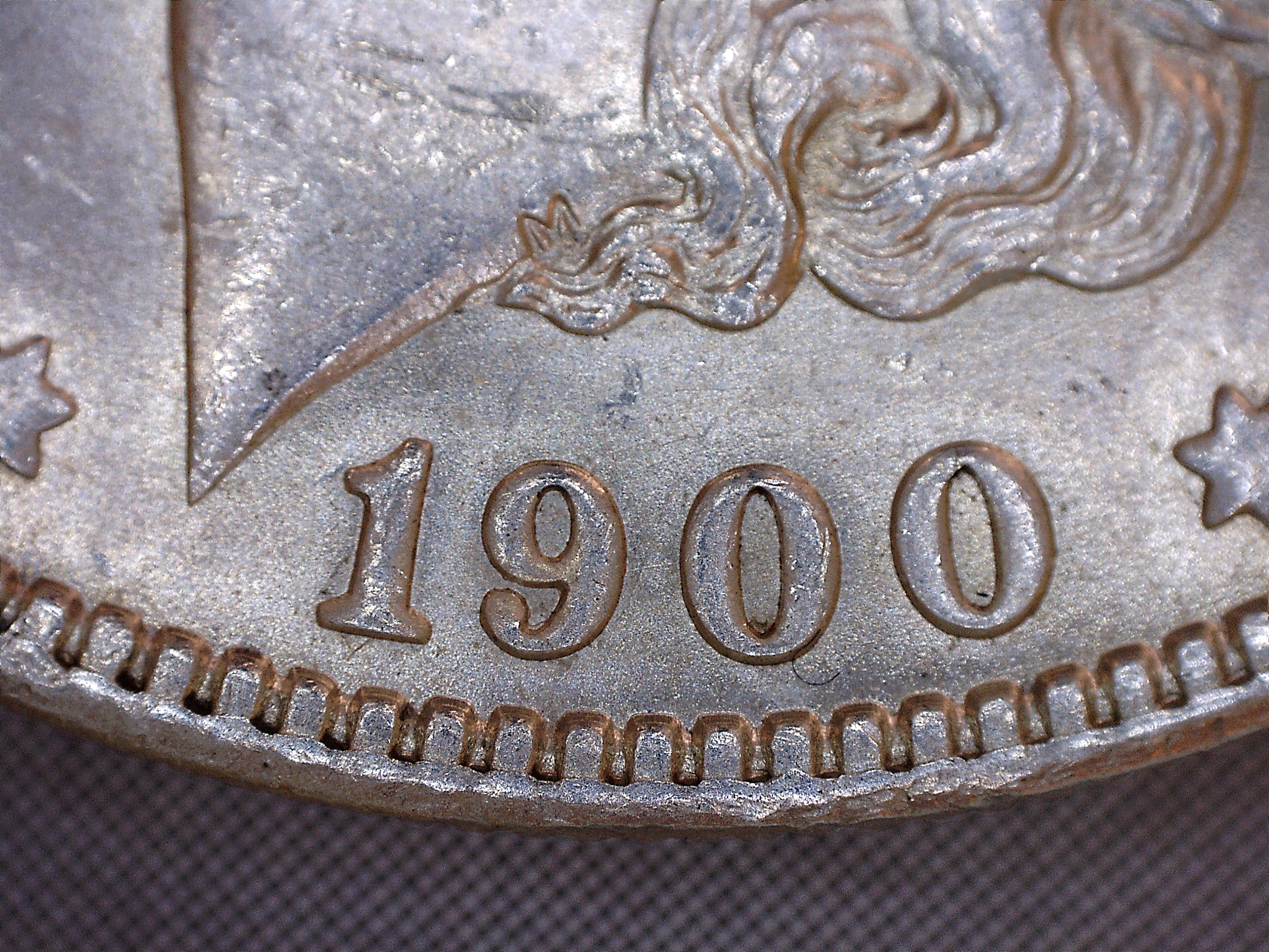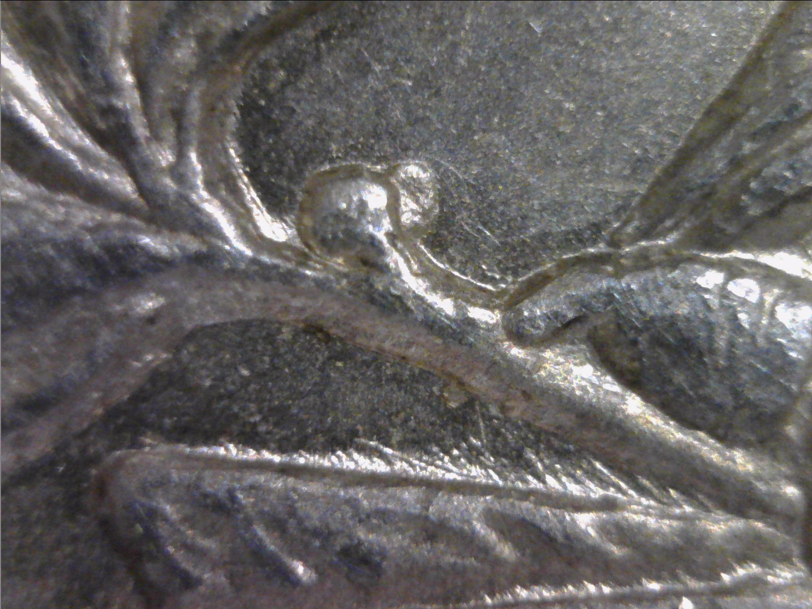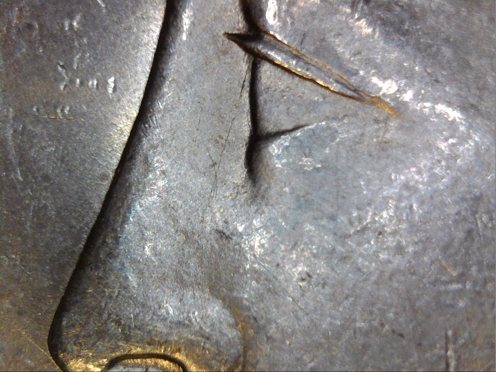 | Obverse: Date in normal position Scratch in front of eye. Doubled inside 9 lower loop. D-Void scratch. |