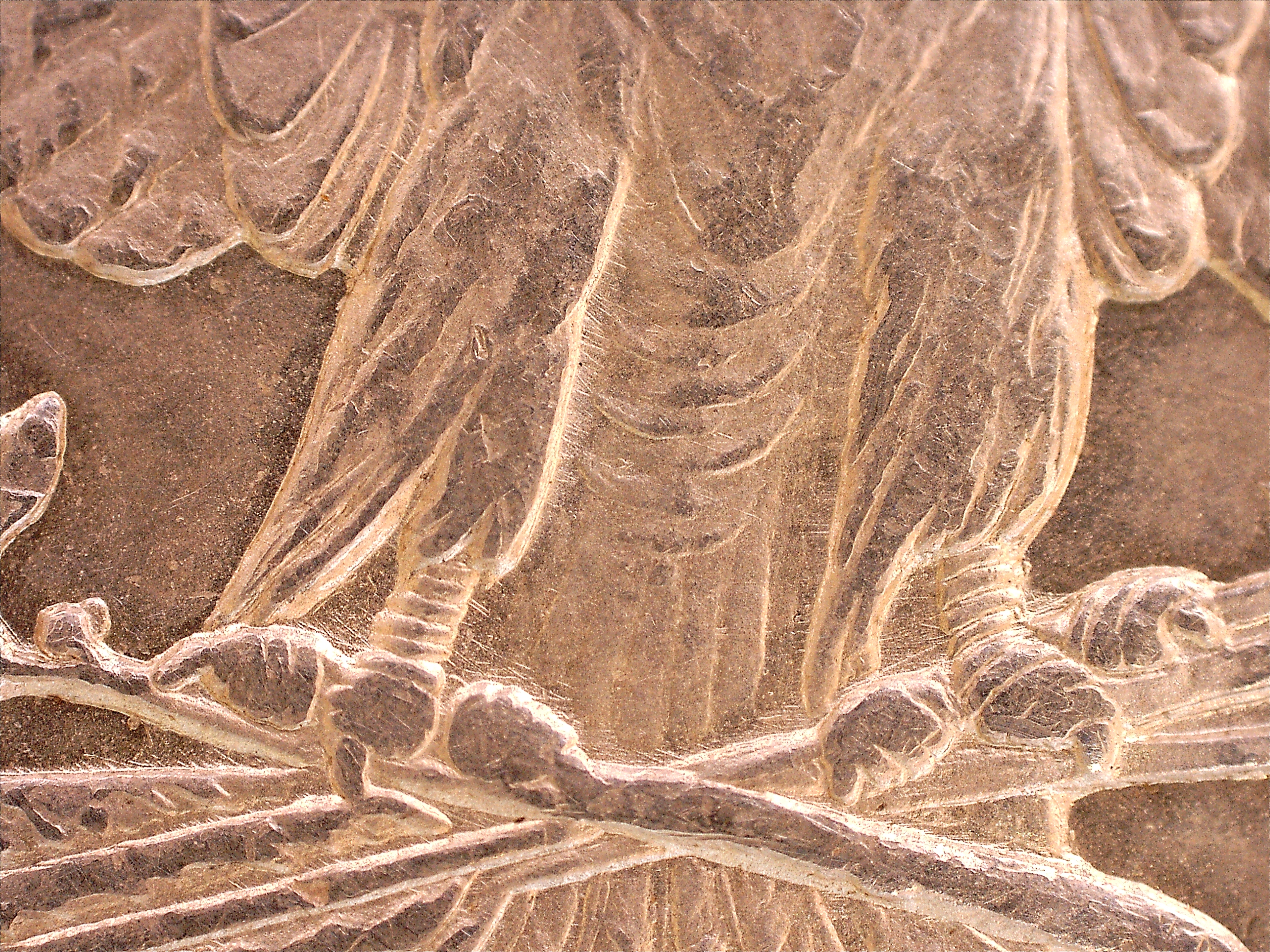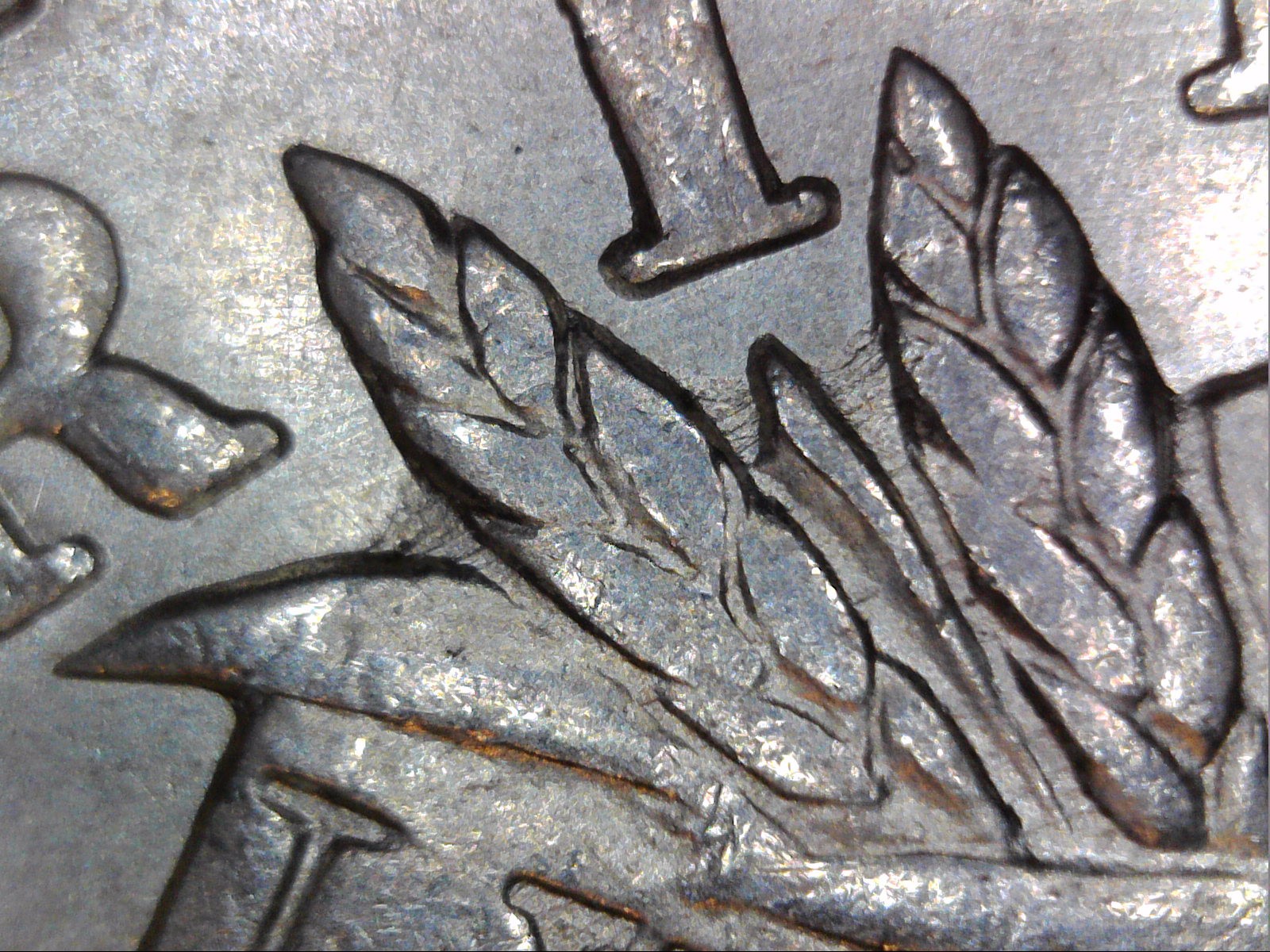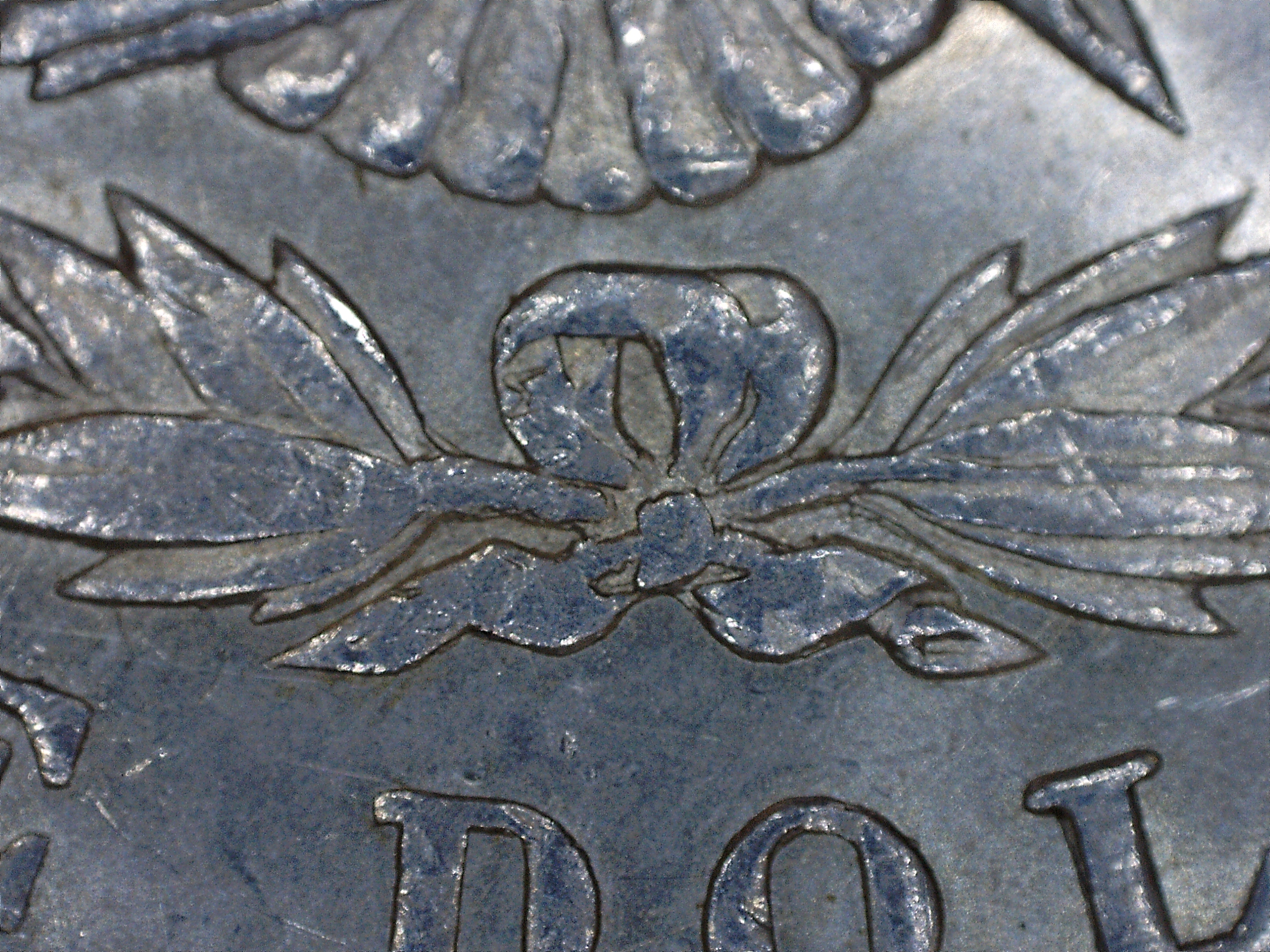 | Reverse: Eagle has doubling on left wing, nostril, and eye. Doubling at base of olive leaf clusters, back of lower arrow head and right of right wing feathers next to leg. Polishing lines at olive branch. |