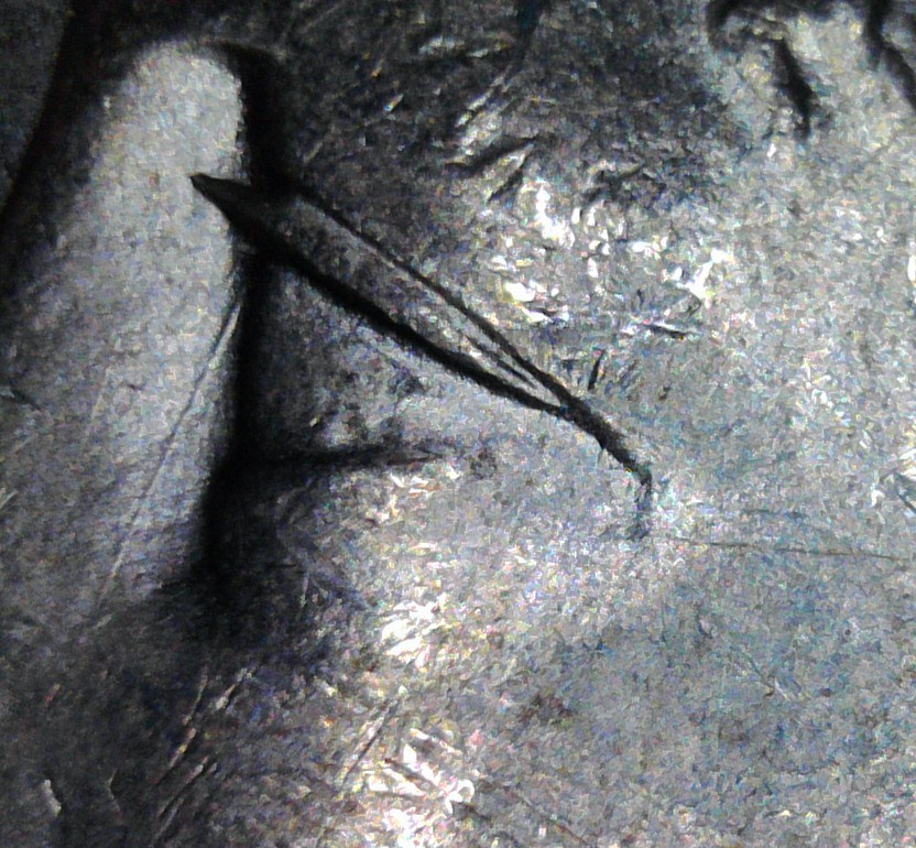 File line in front of eye. Polishing lines between olive branch and arrow feather..