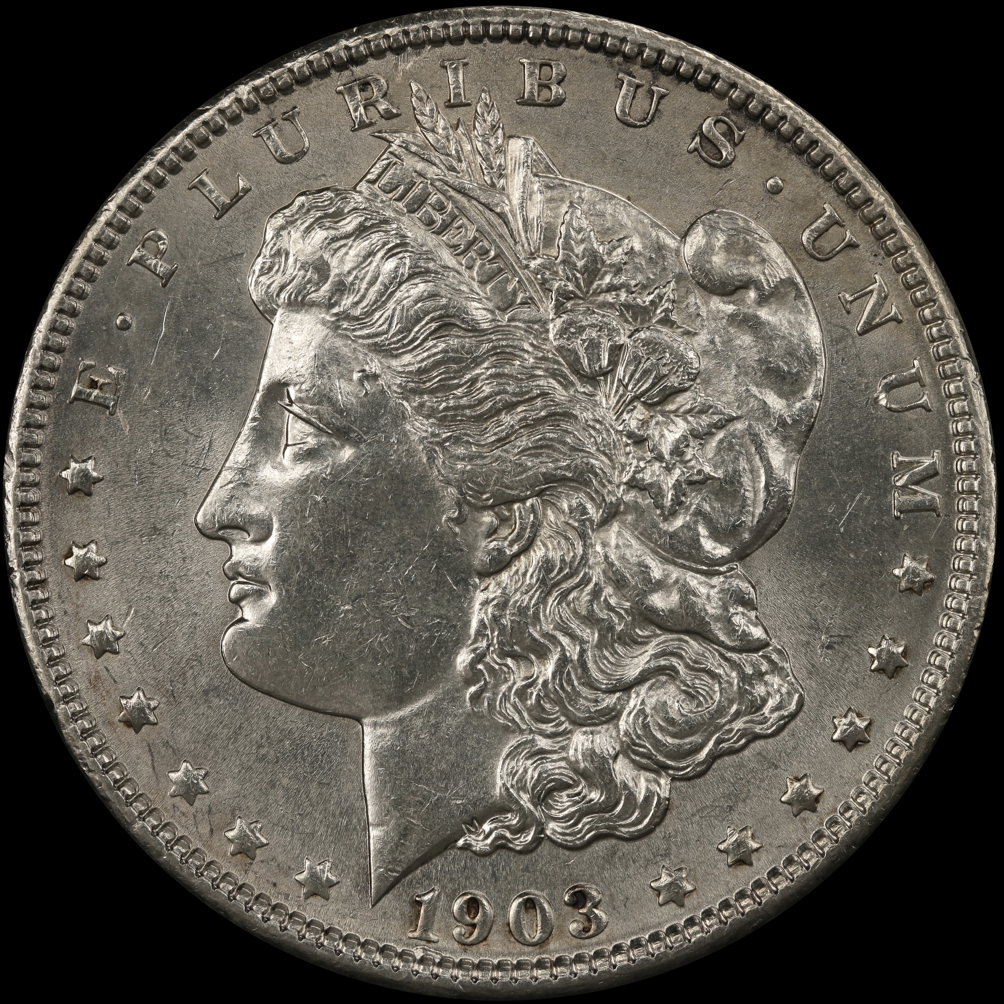 | Obverse: III2-6 Date is set at the Normal position. Broad die gouge at top of denticle below 1 and broad vertical die gouge from denticle top thru 0. Very weak wing clash at the top of Liberty's neck. No letter transfer. |