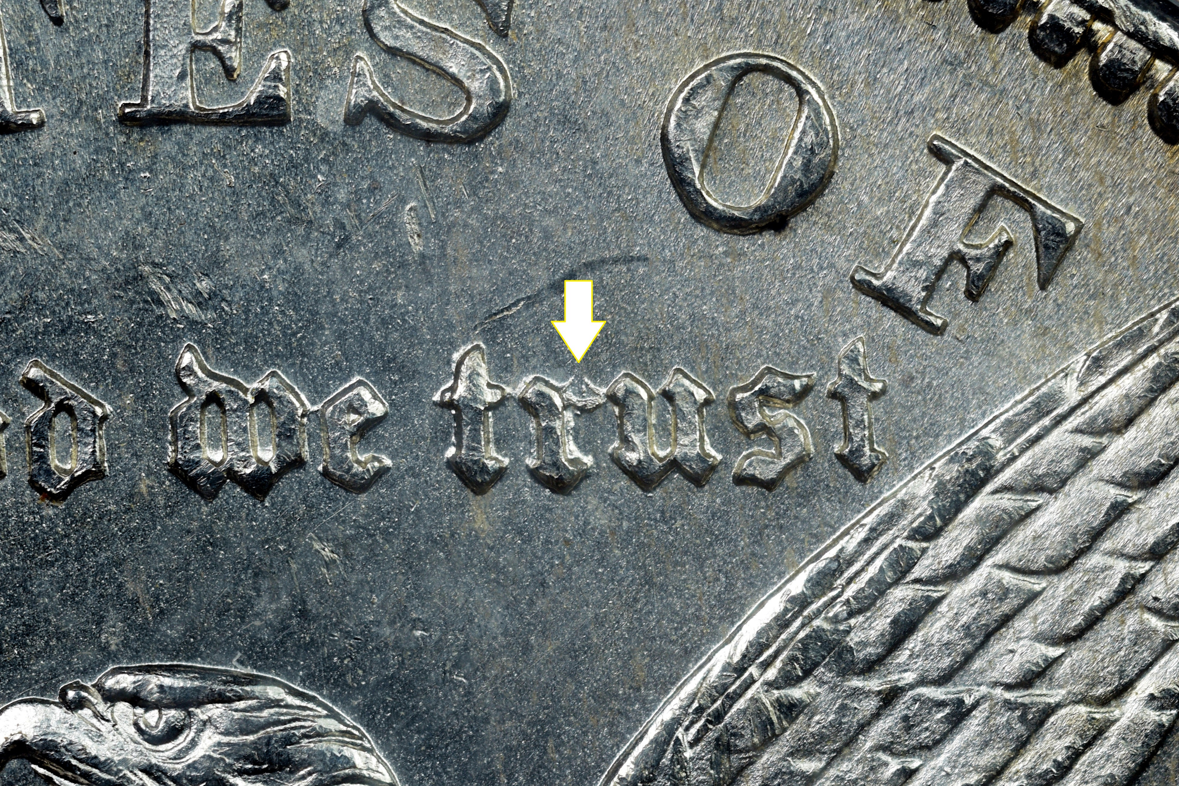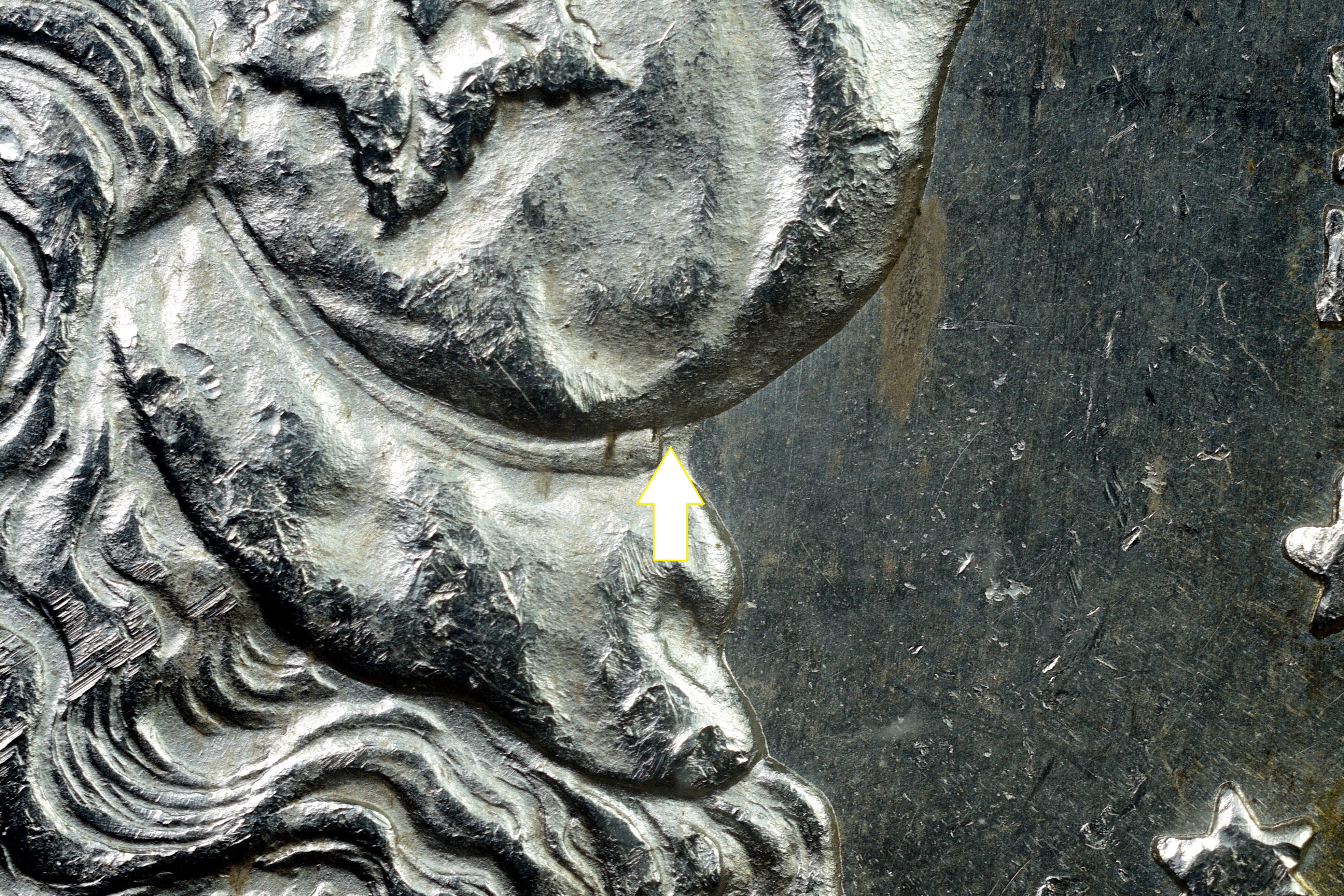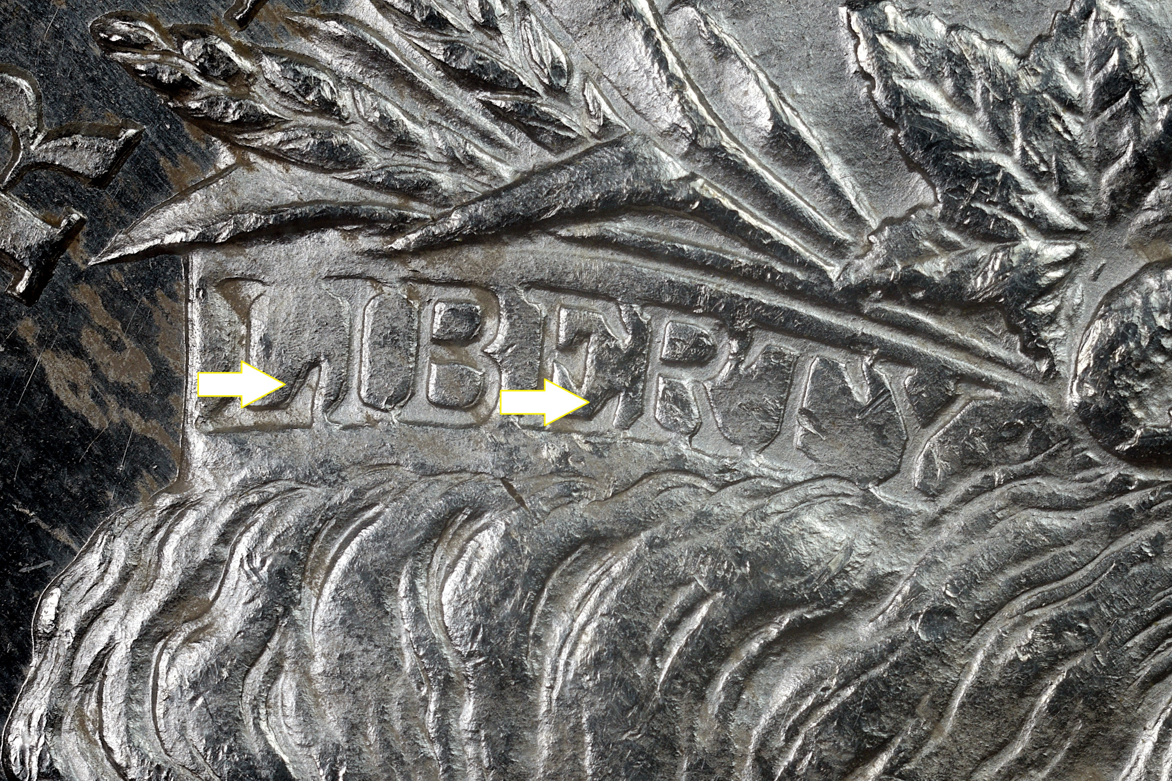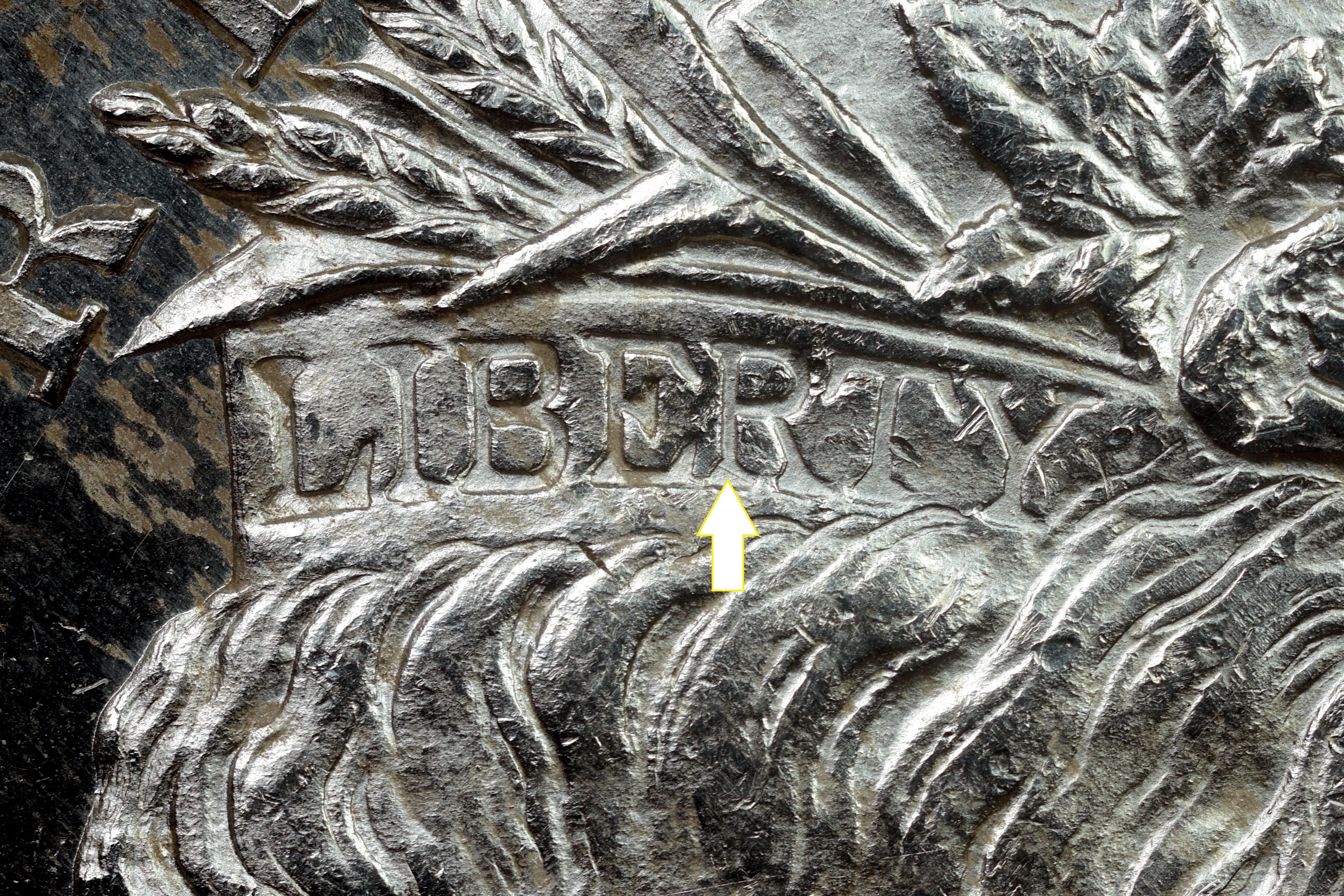 LIBERTY. A short horizontal Die polishing line can be seen at the end of the Phrygian Cap Ribbon.
