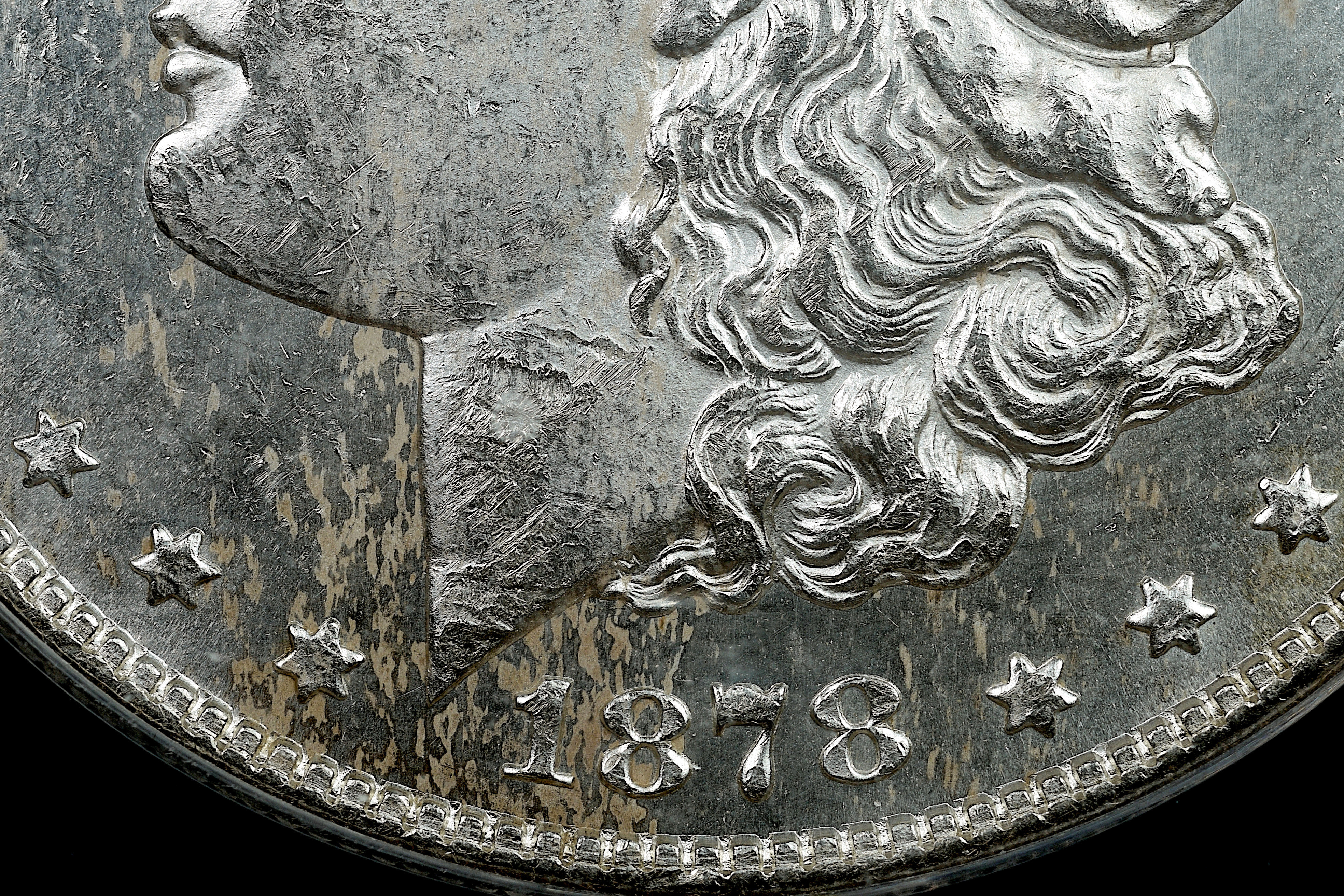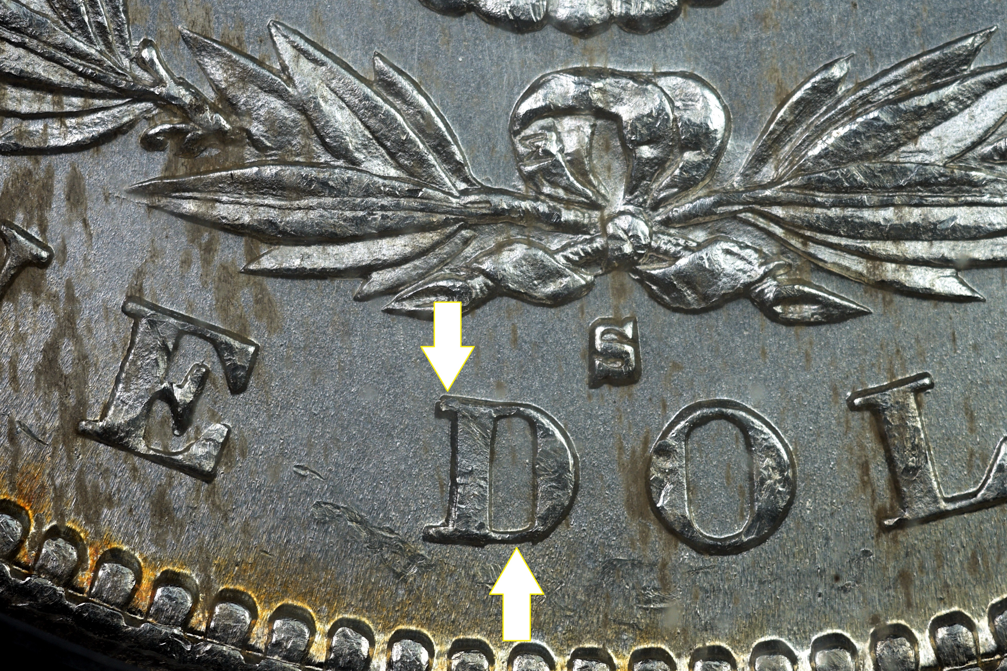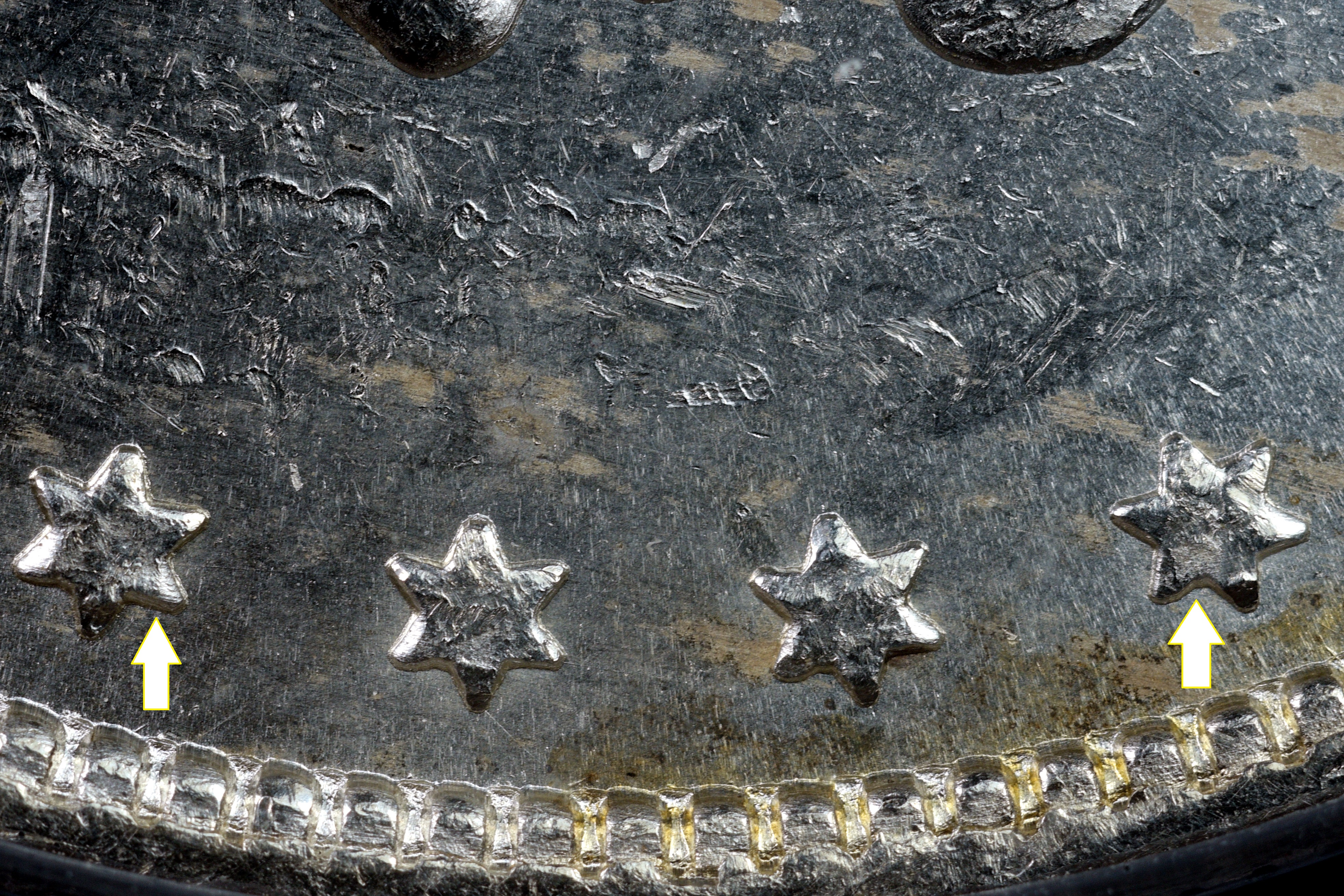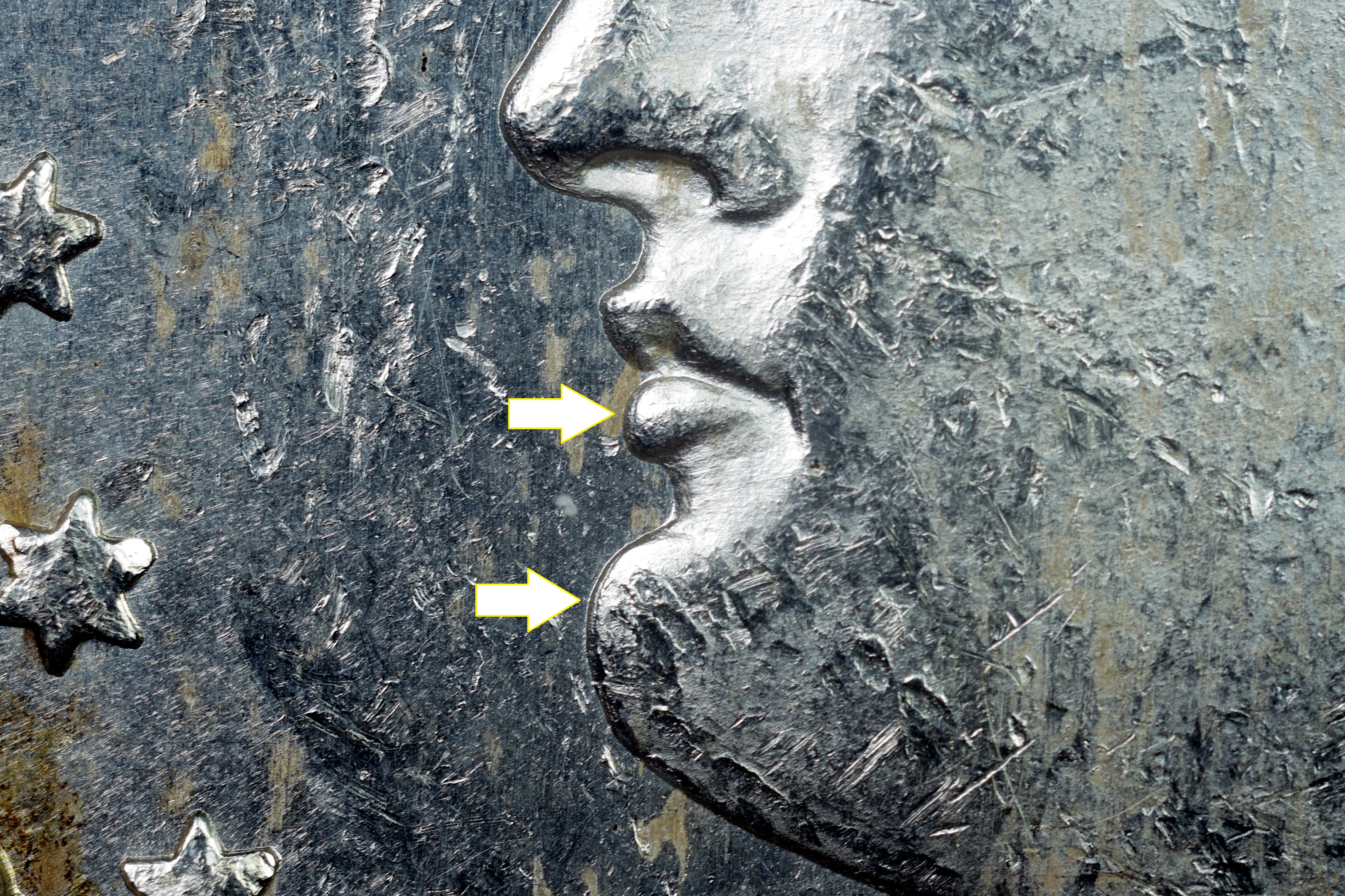U are doubled rimward) with all Legend letters doubled with some tripled. Liberty's profile is doubled, most clearly at lower lip and chin. The Date is doubled with the left at the inside top of the upper loop. Digit 7 is doubled on the right side of the stem; and, digits 8,7,8 shows slight doubling at the outside top. Left Stars are slightly doubled to quadrupled towards rim.