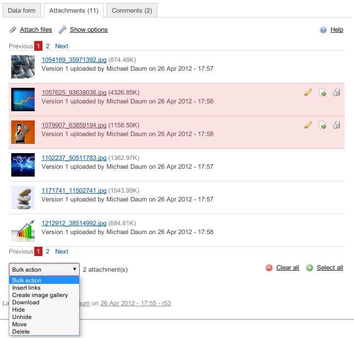 - bulk actions on attachments: delete, move, hide, download as zip archive, create image gallery, insert links